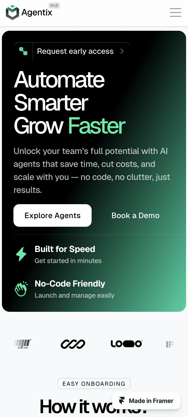 Build and launch your AI-powered SaaS faster with Agentix — a premium Framer template packed with modular sections, feature-rich pages, and seamless UX. P