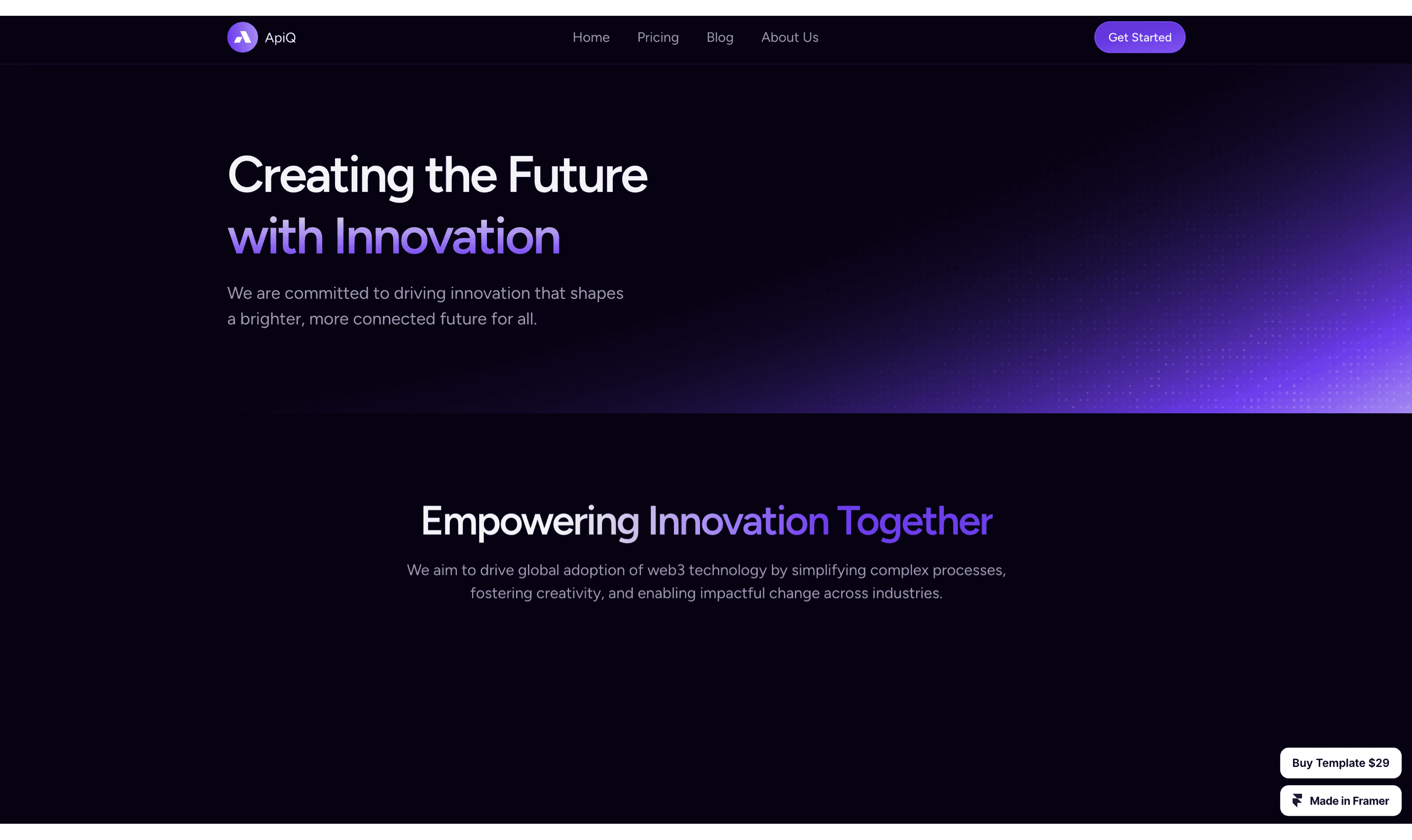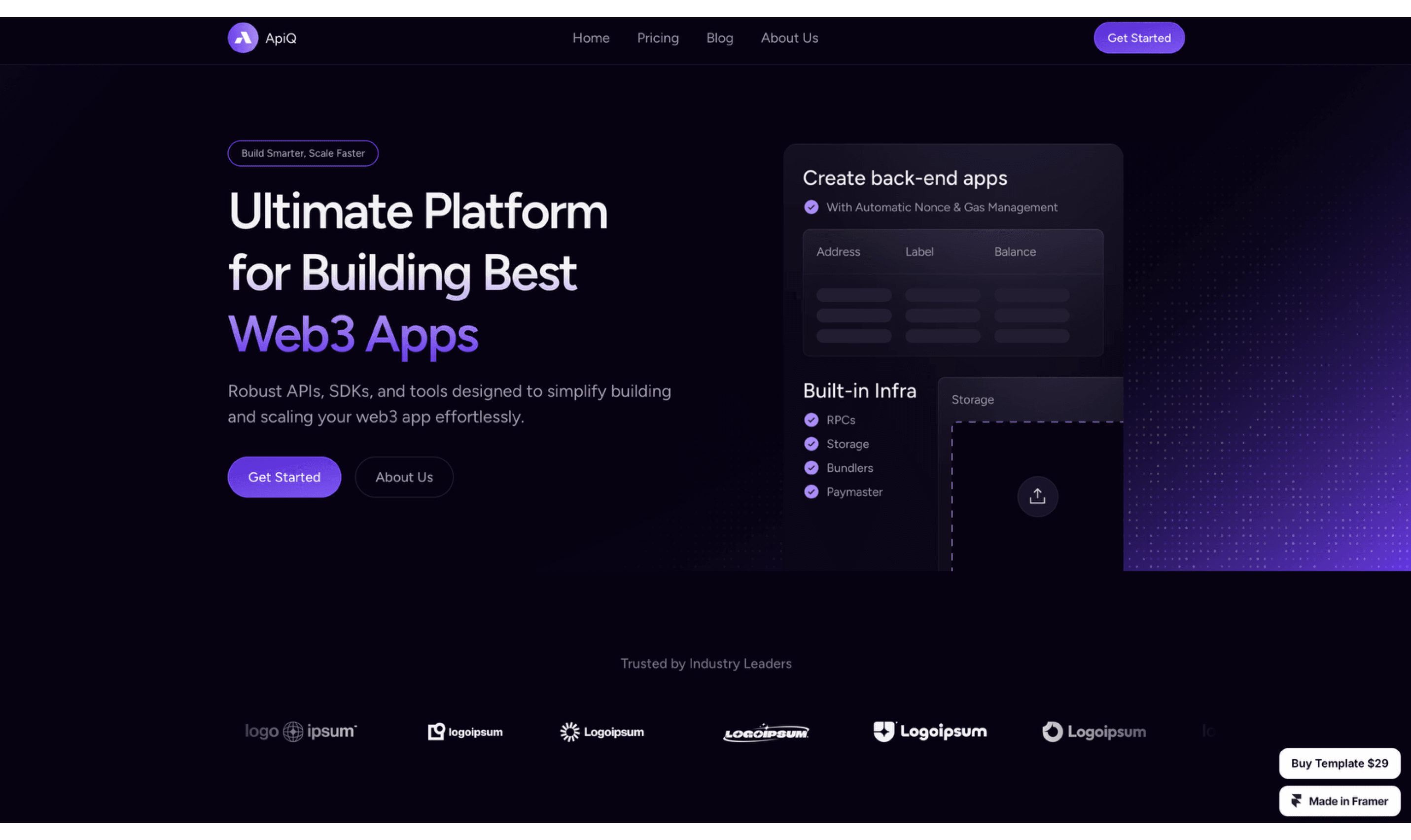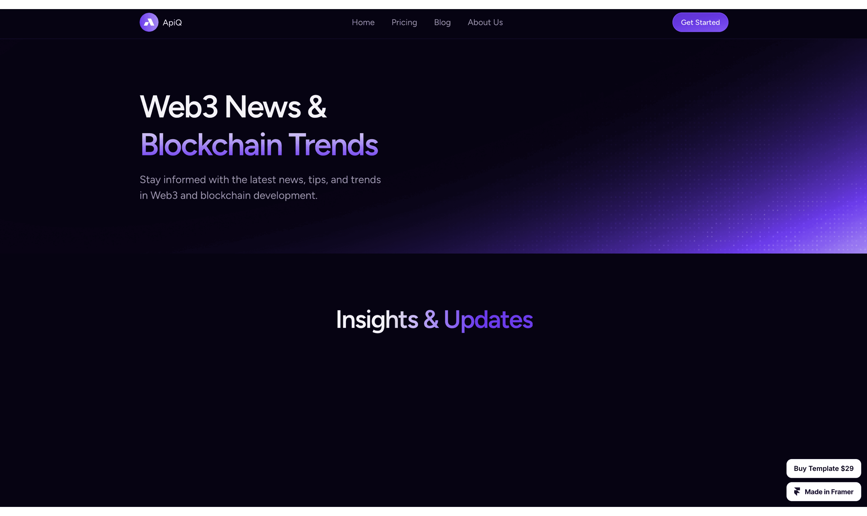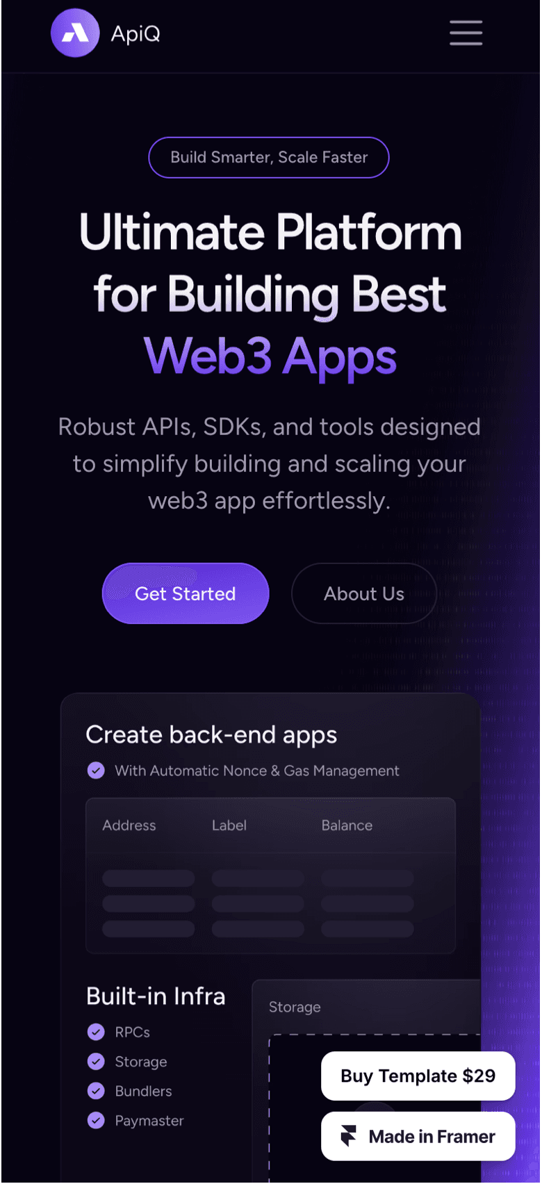 Build your Web3 projects effortlessly with APIQ – Web3 Blockchain Template. Featuring fully responsive layouts, customizable components, and sleek designs tailored for blockchain startups, dApps, and NFT marketplaces. Launch your Web3 site in minutes with APIQ