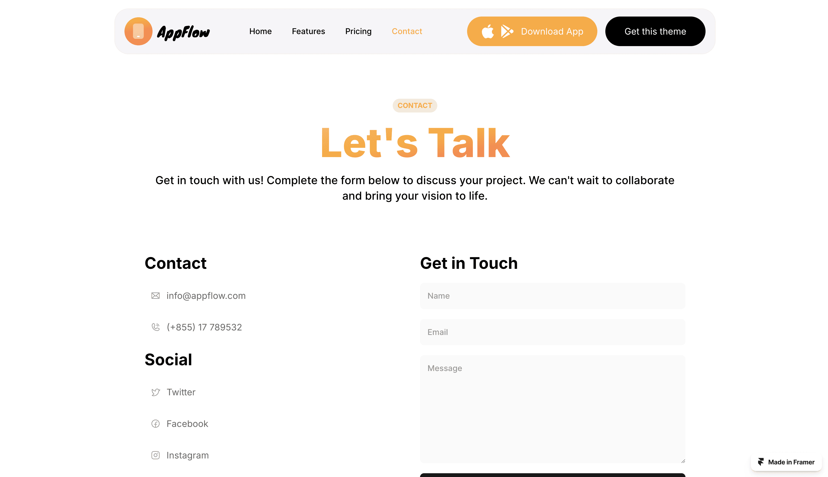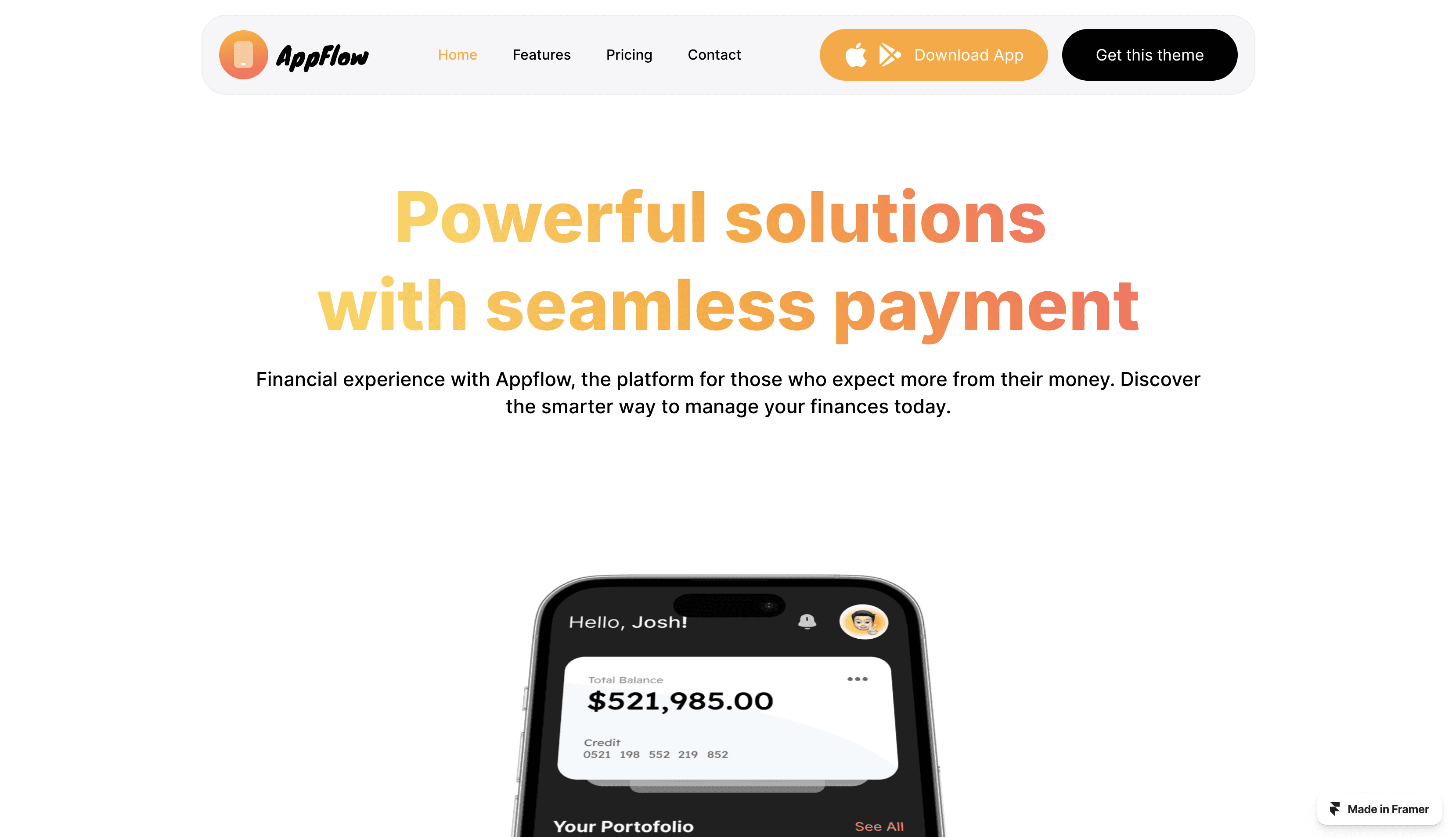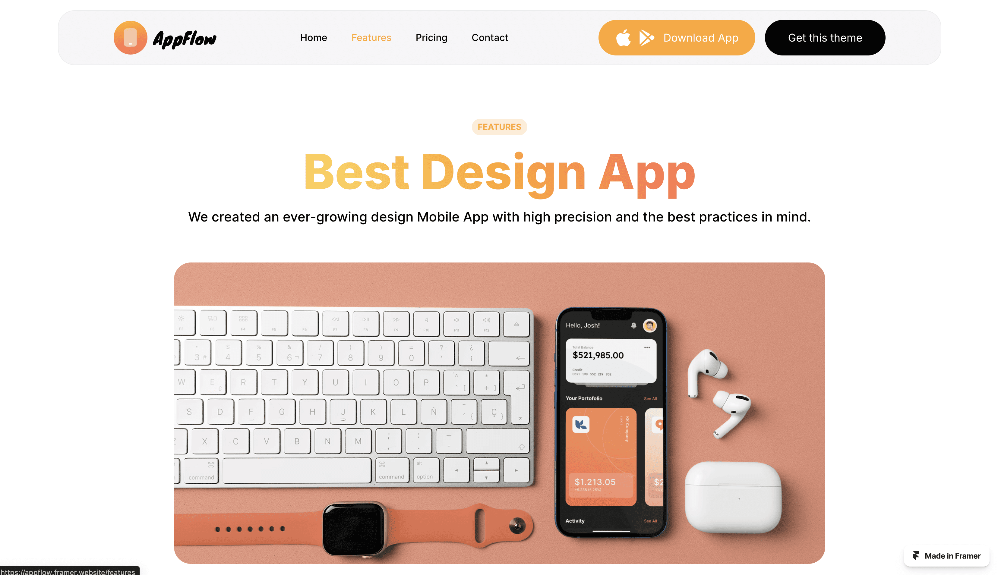 AppFlow is a website framer template that represents modern design aesthetics for mobile app landing pages perfectly.