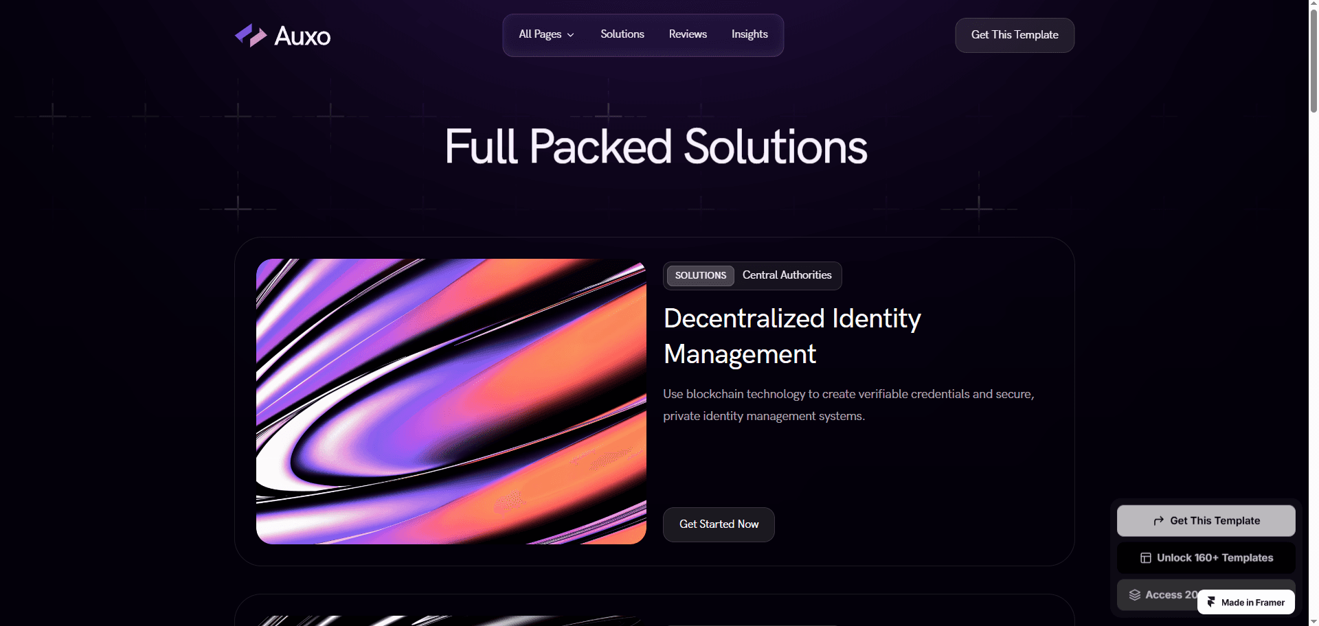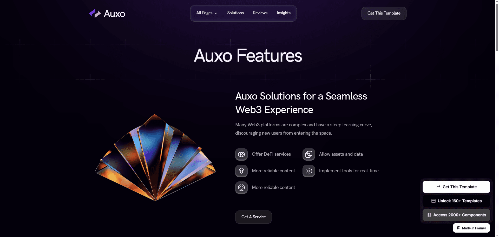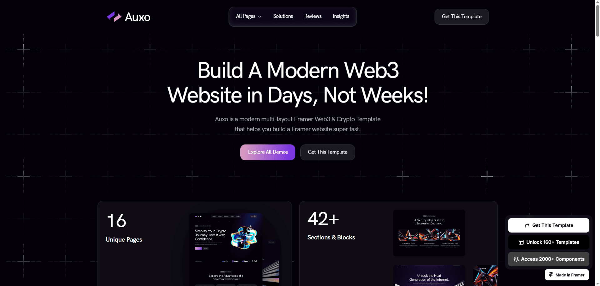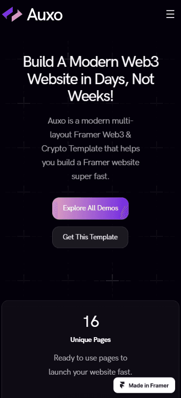 Auxo is a versatile, easy-to-use Framer template packed with 4 Homepage variations & 16 ready to use complete pages to help you build blockchain, crypto or web3 websites.