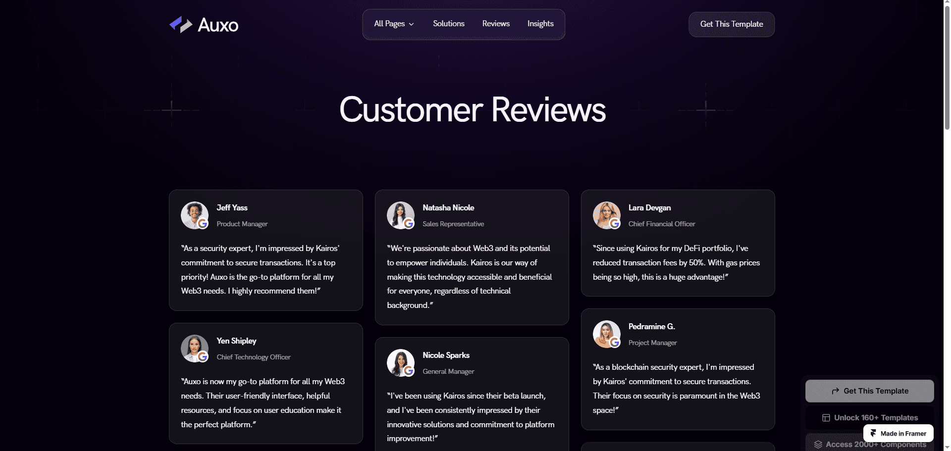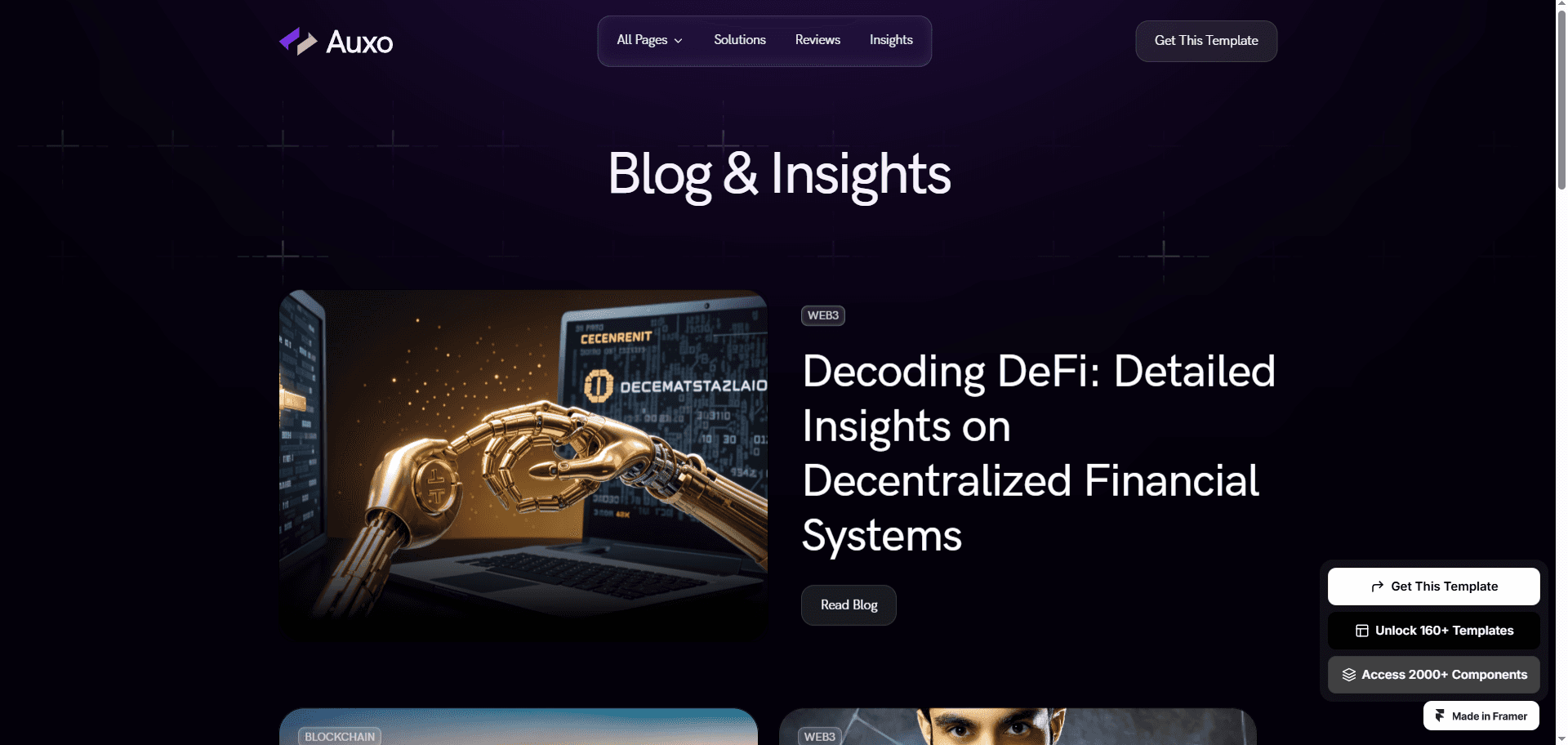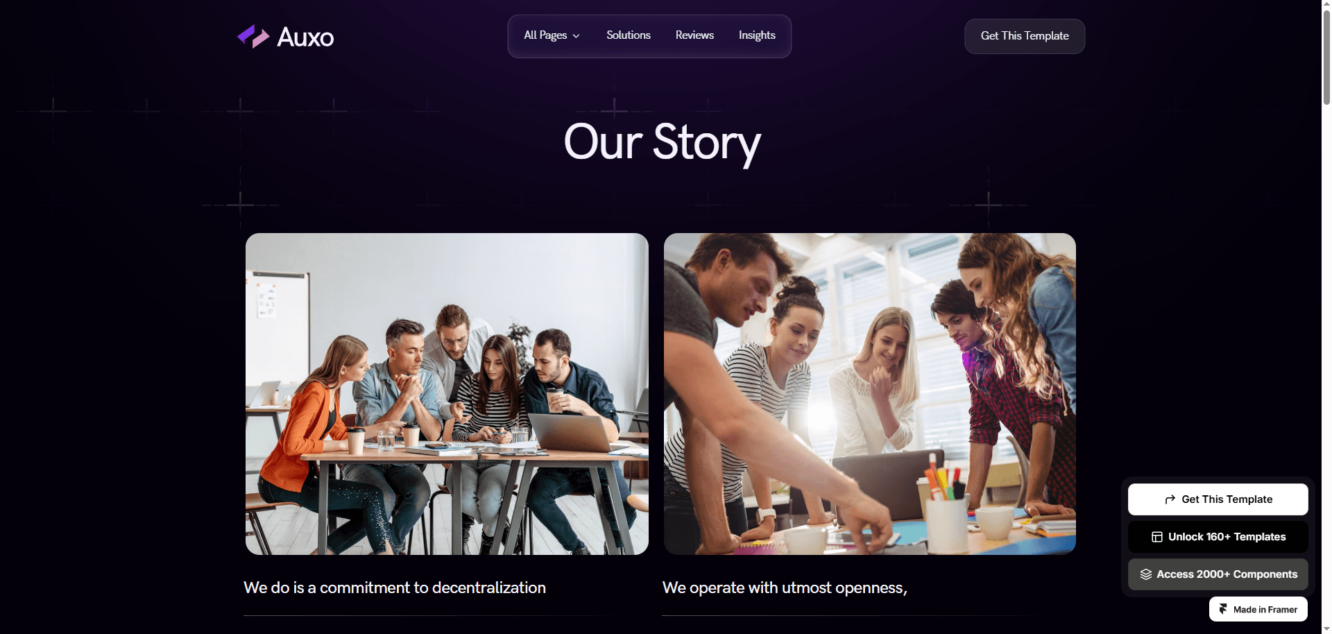 Auxo is a versatile, easy-to-use Framer template packed with 4 Homepage variations & 16 ready to use complete pages to help you build blockchain, crypto or web3 websites.