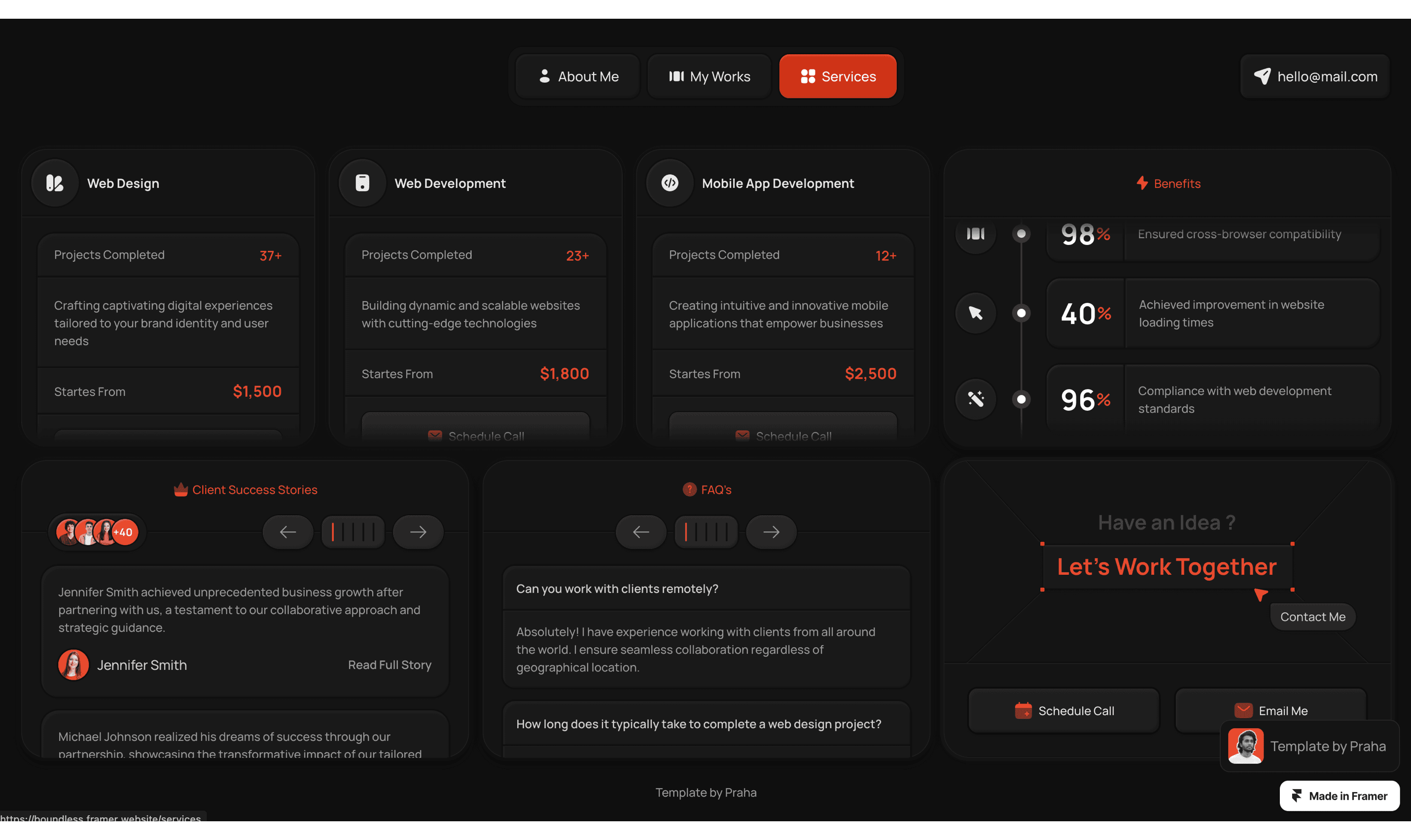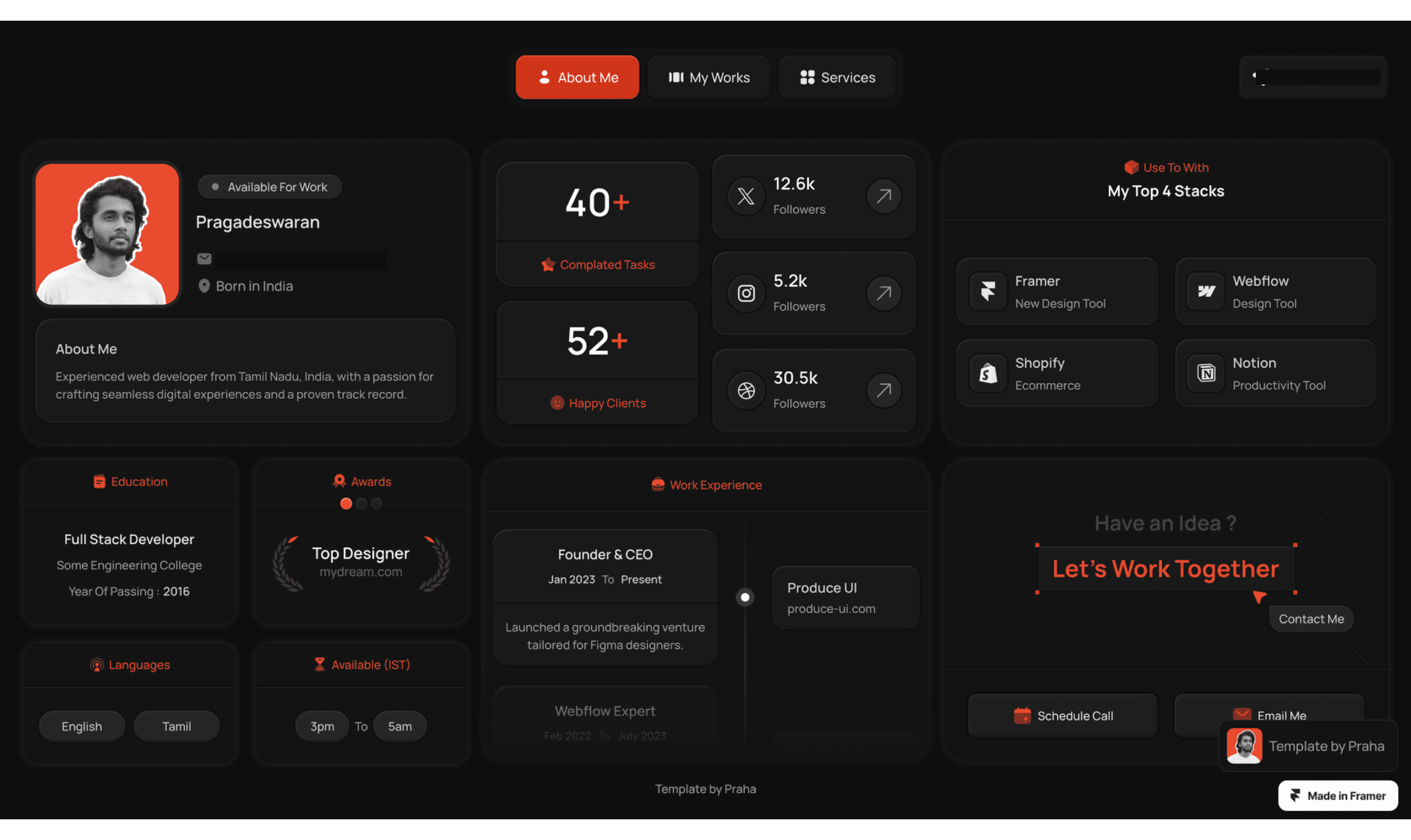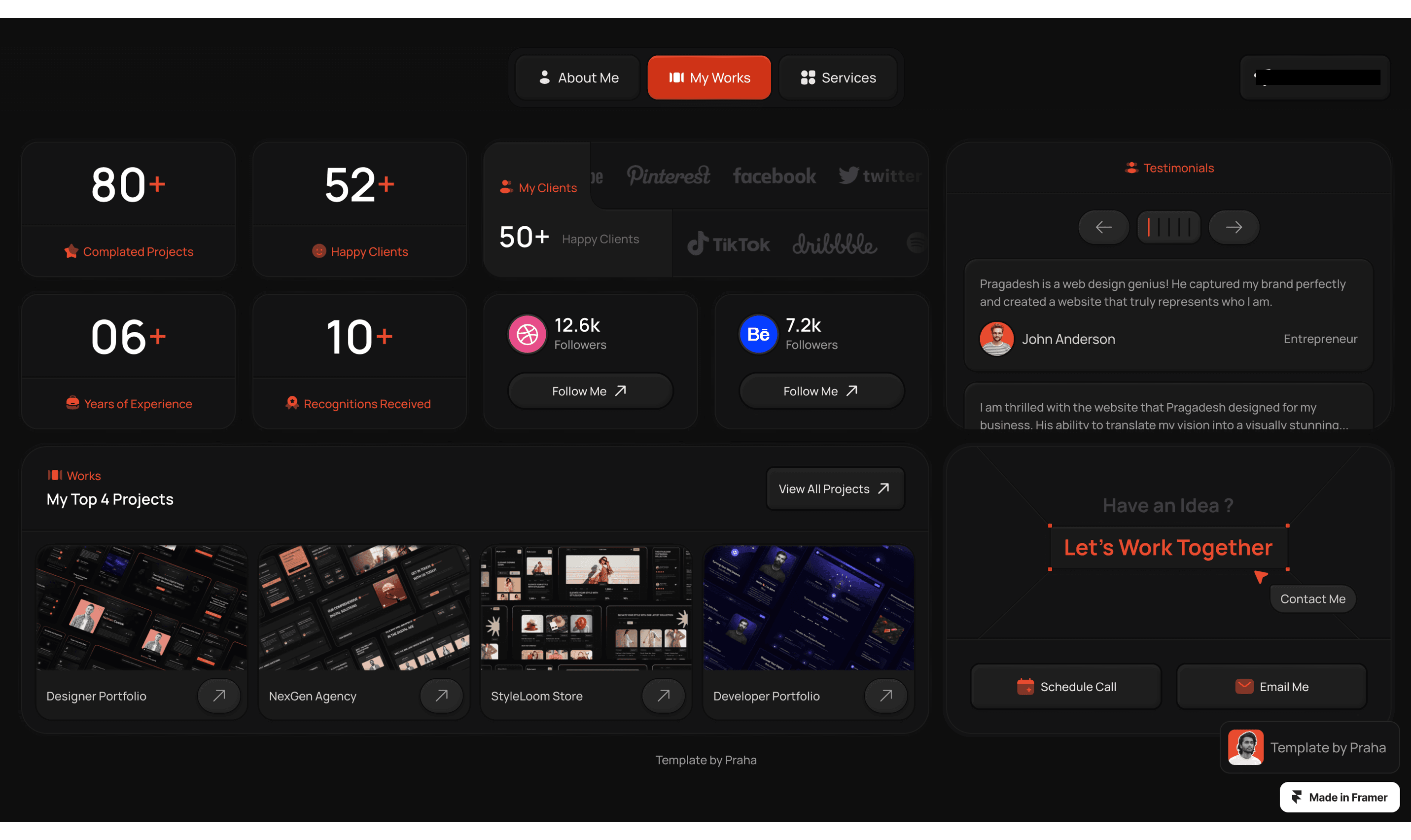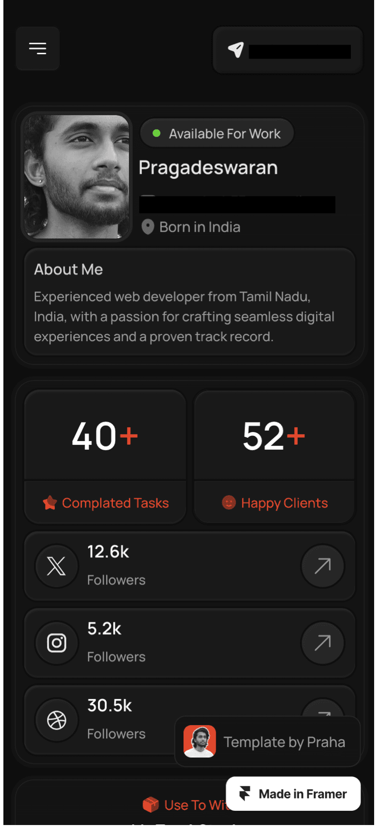Innovative Framer portfolio template meticulously crafted to showcase all your vital information in a visually compelling format, block by block.