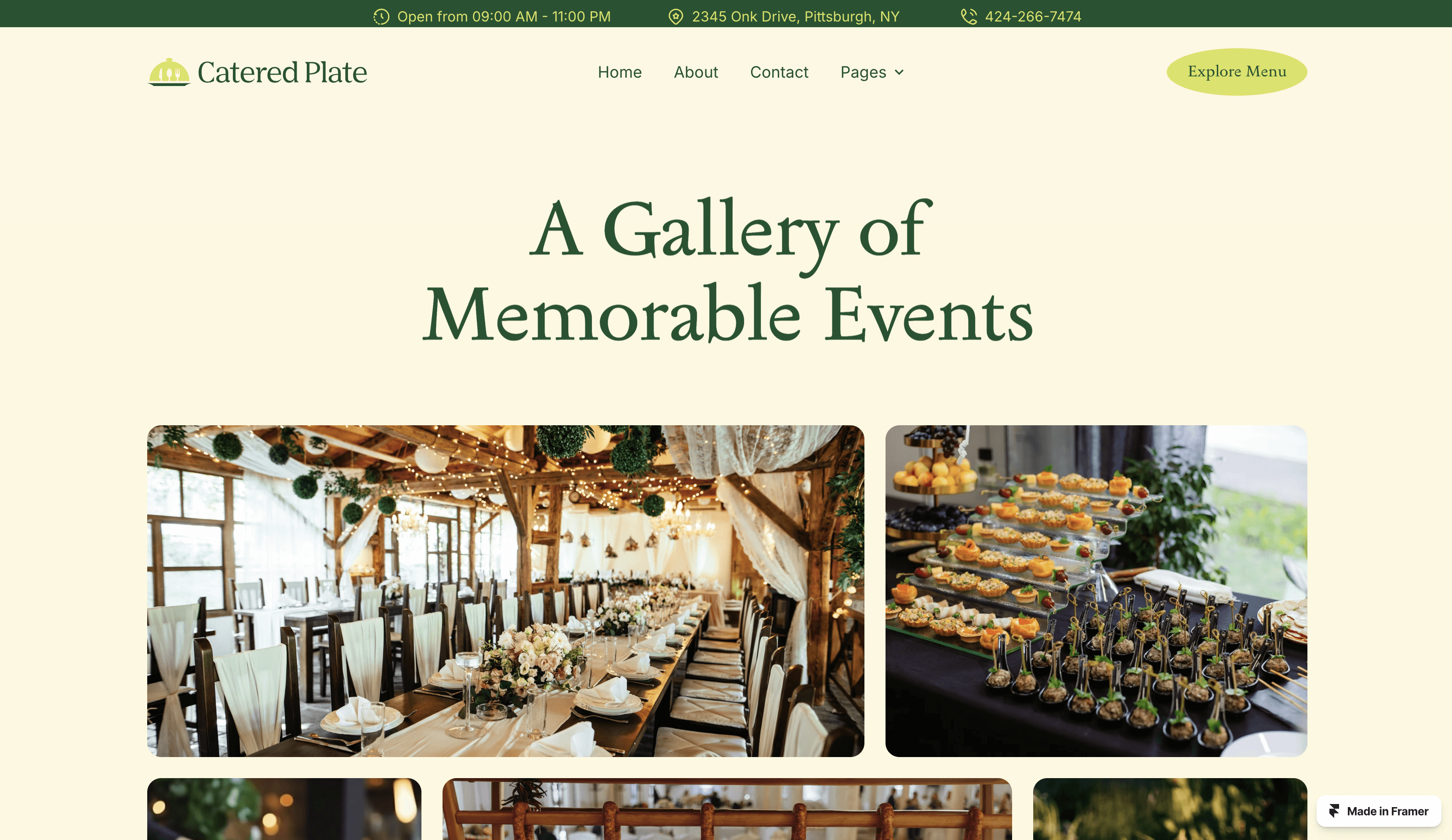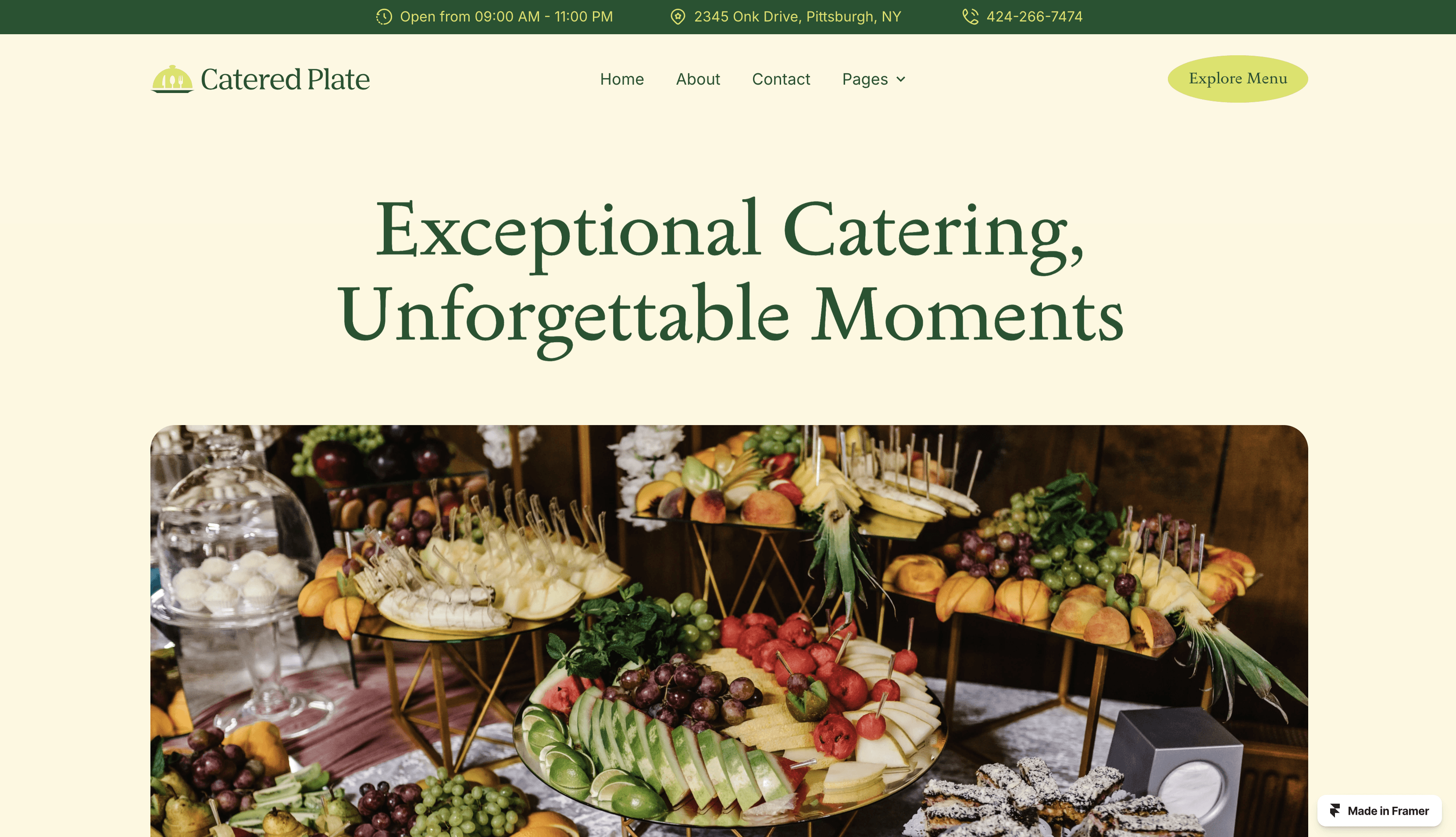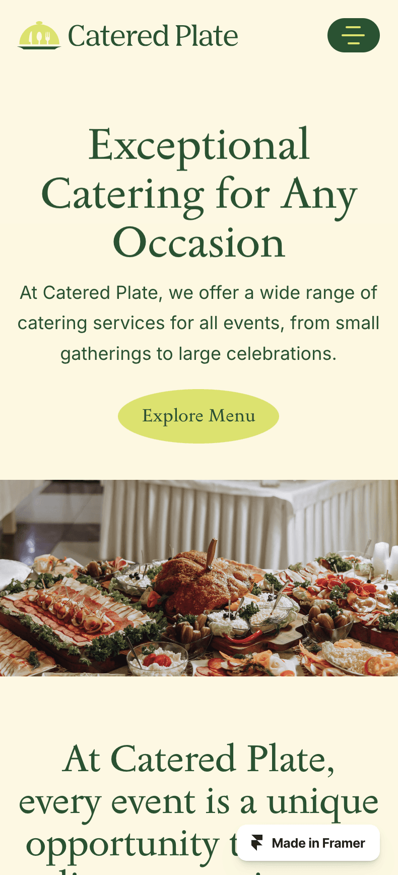 Catered Plate is a sleek Framer template for catering and event planning businesses, featuring interactive animations, CMS integration, and flexible layouts for showcasing menus, testimonials, and galleries, all tailored for culinary professionals.