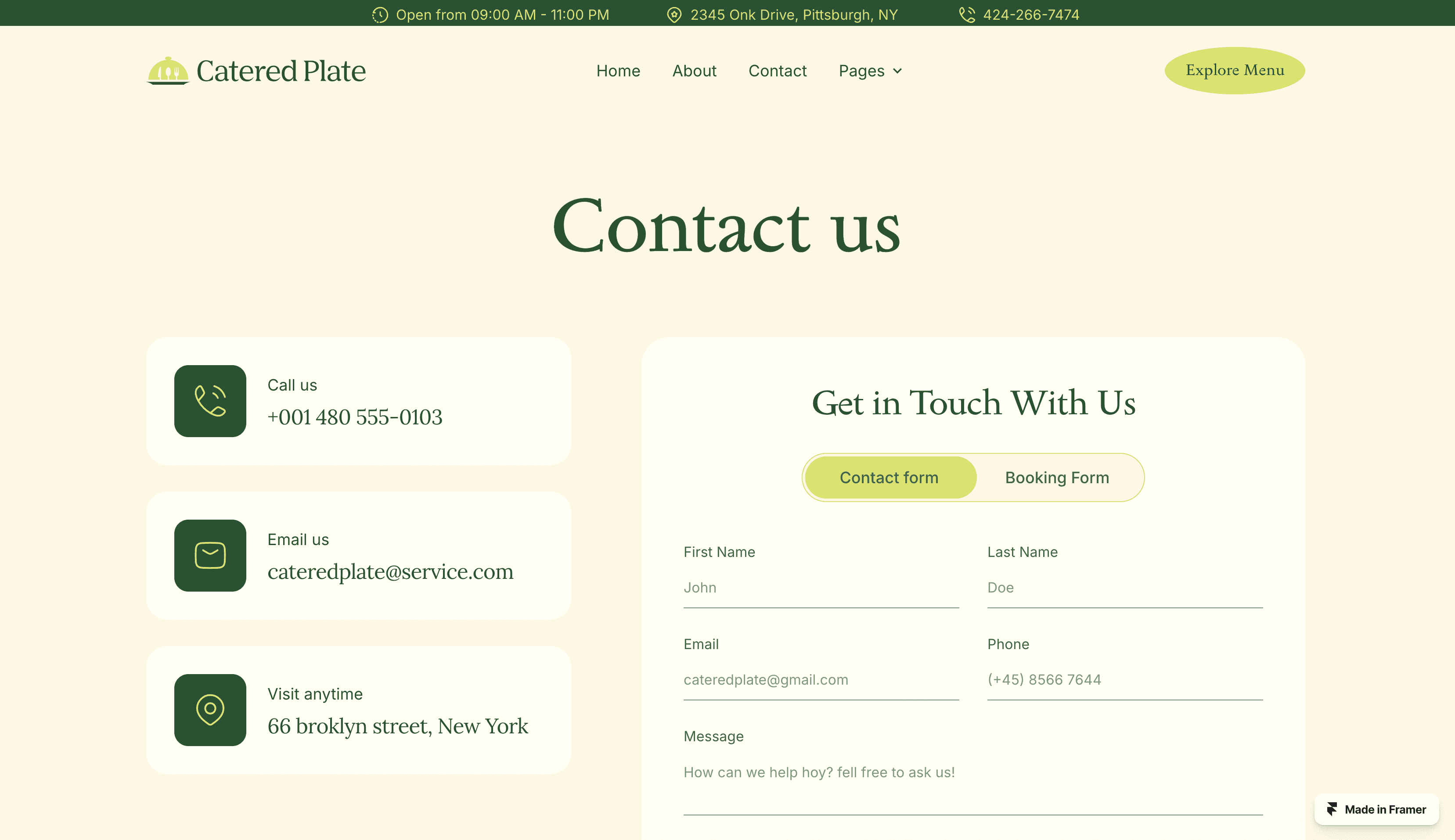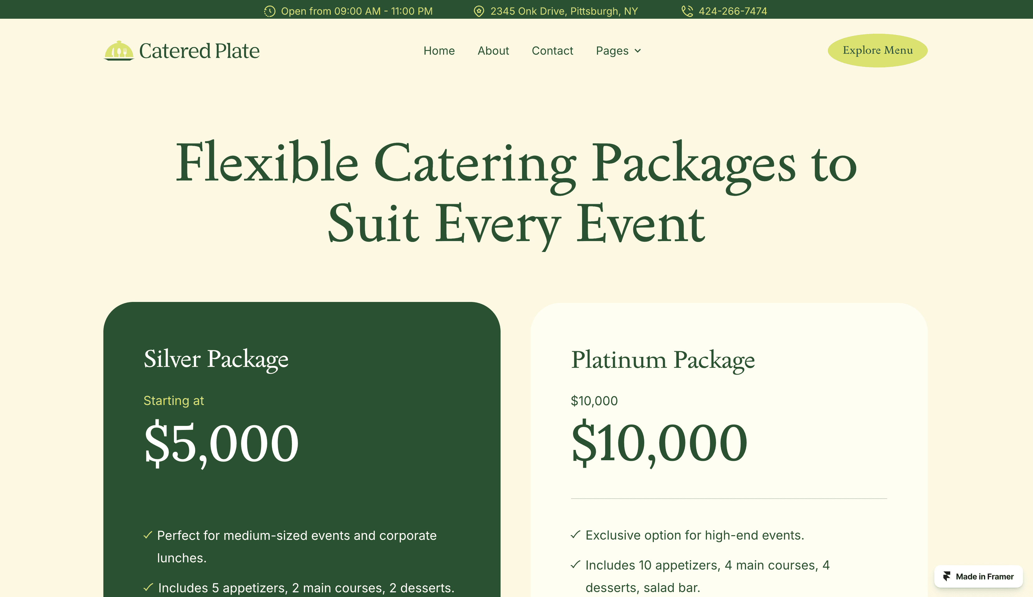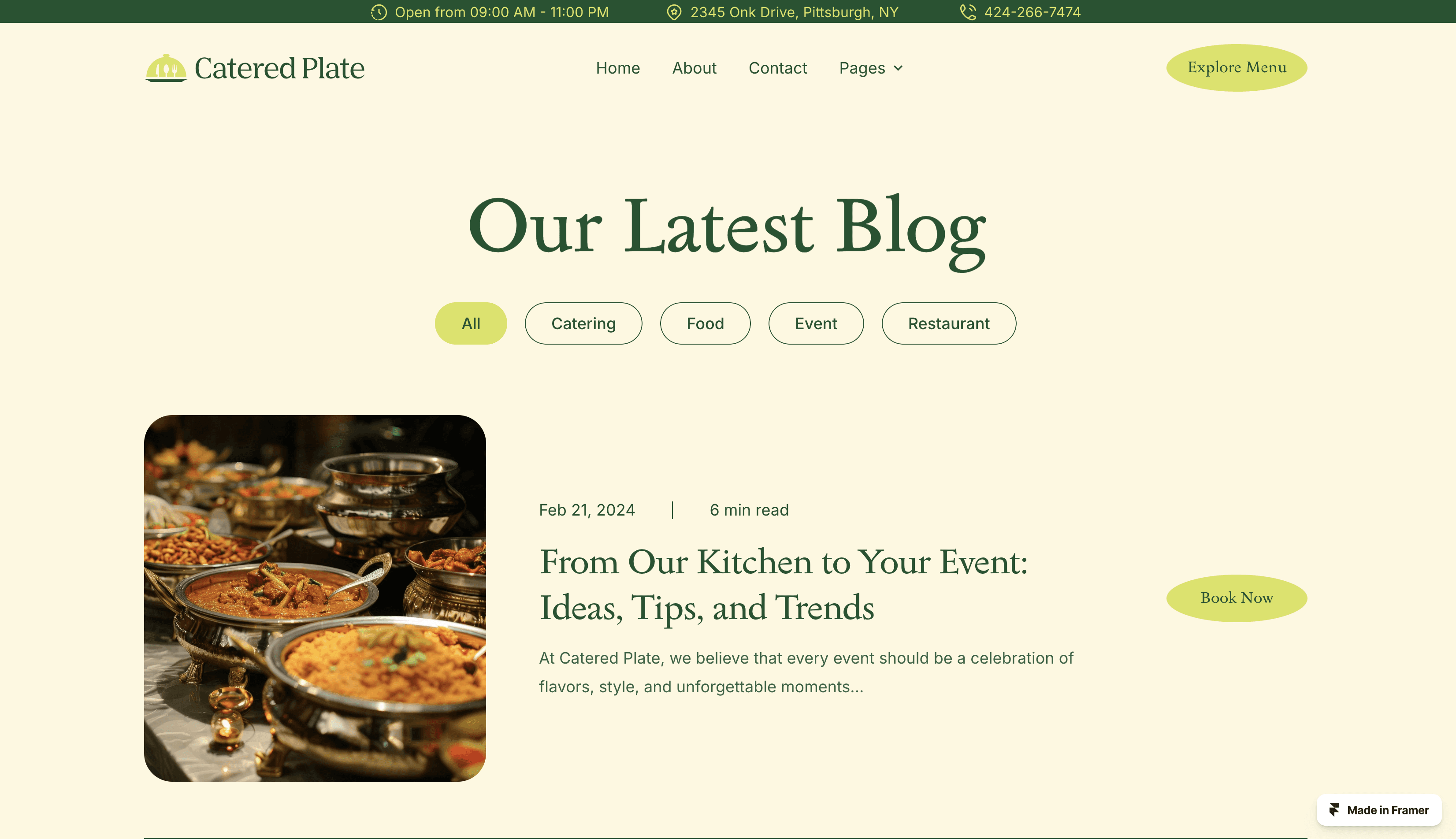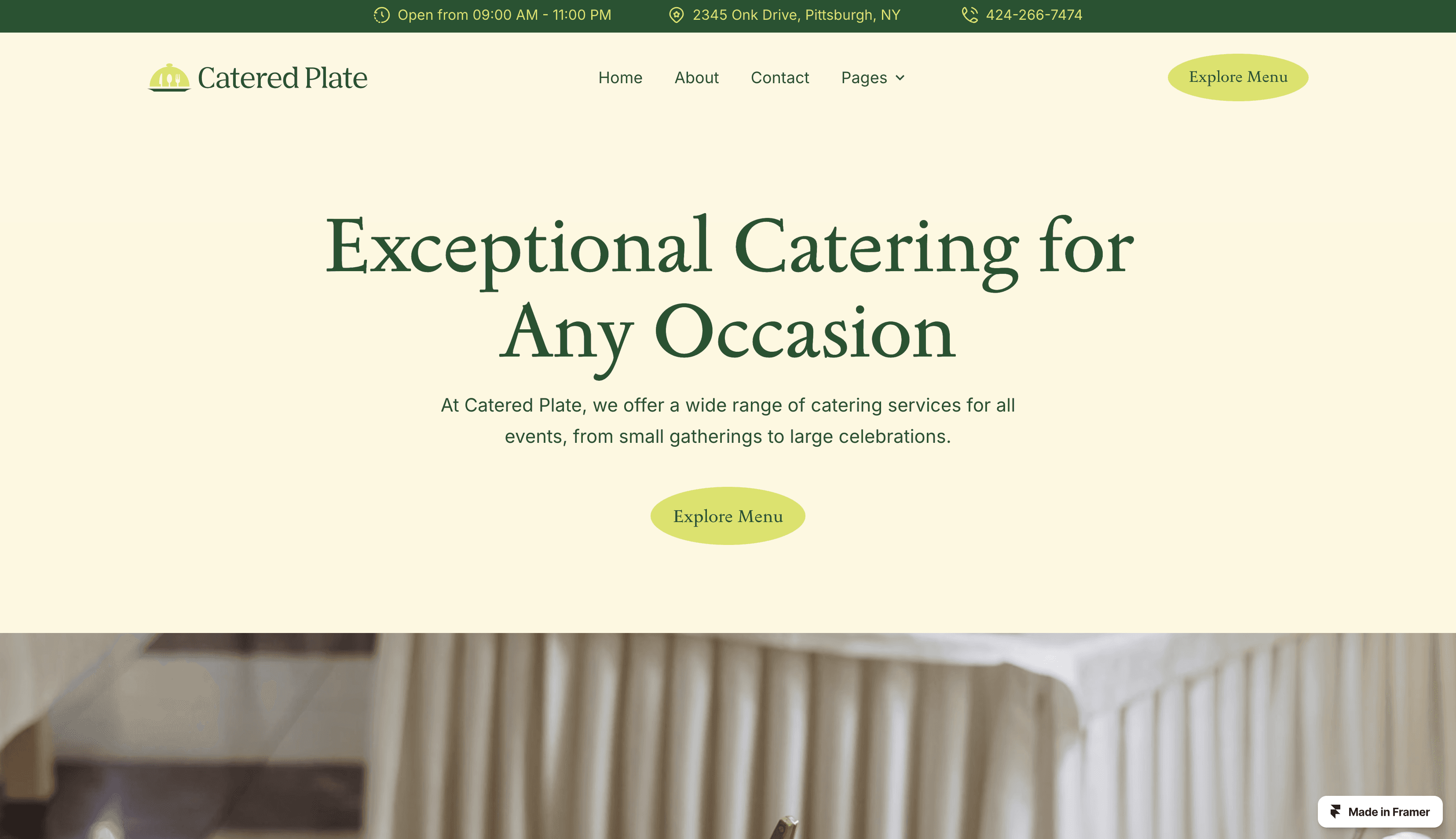Catered Plate is a sleek Framer template for catering and event planning businesses, featuring interactive animations, CMS integration, and flexible layouts for showcasing menus, testimonials, and galleries, all tailored for culinary professionals.