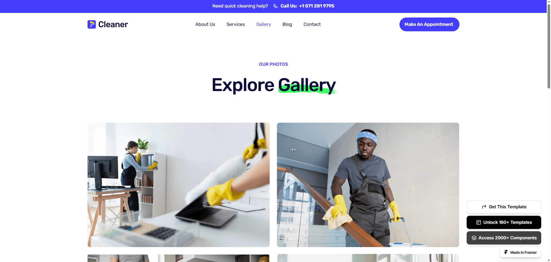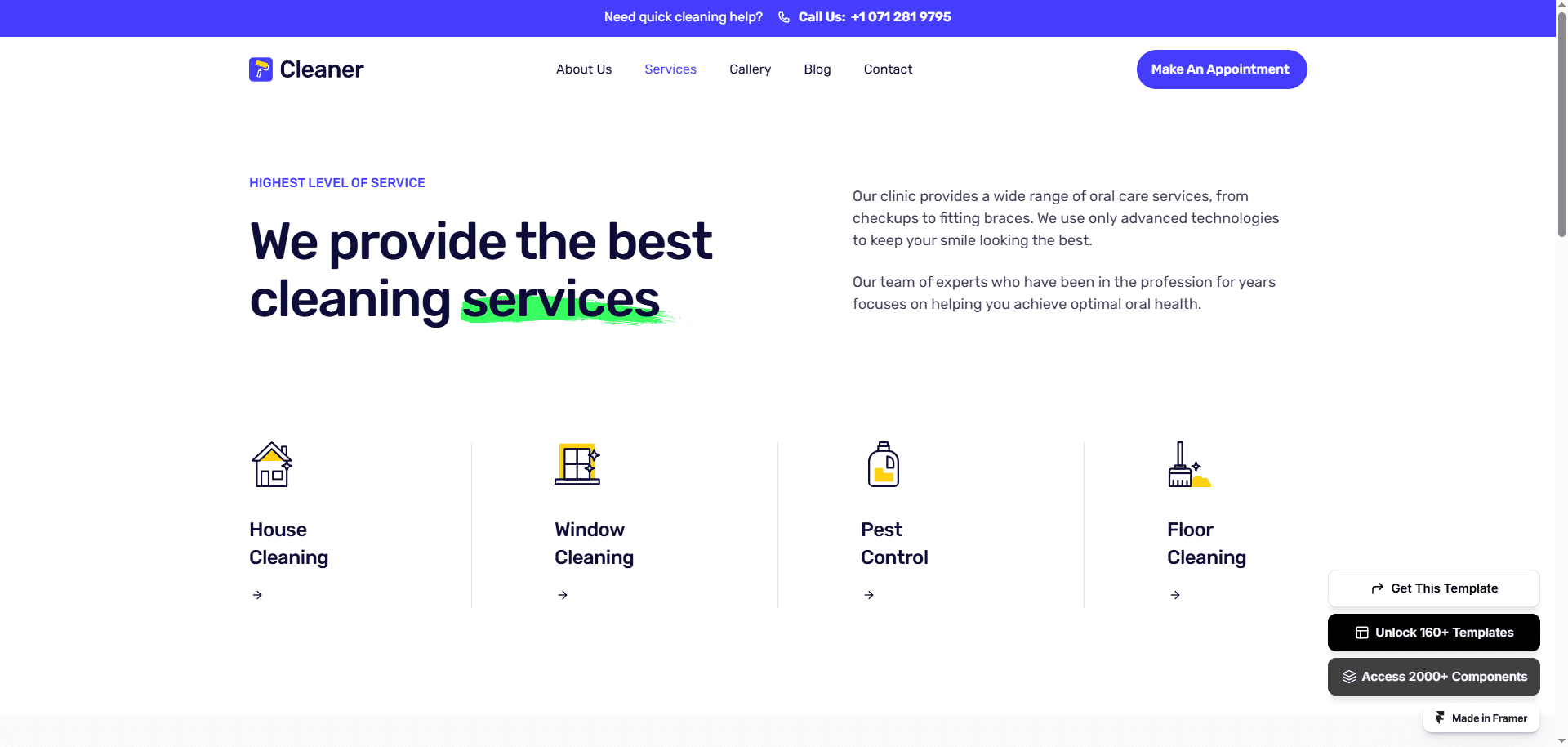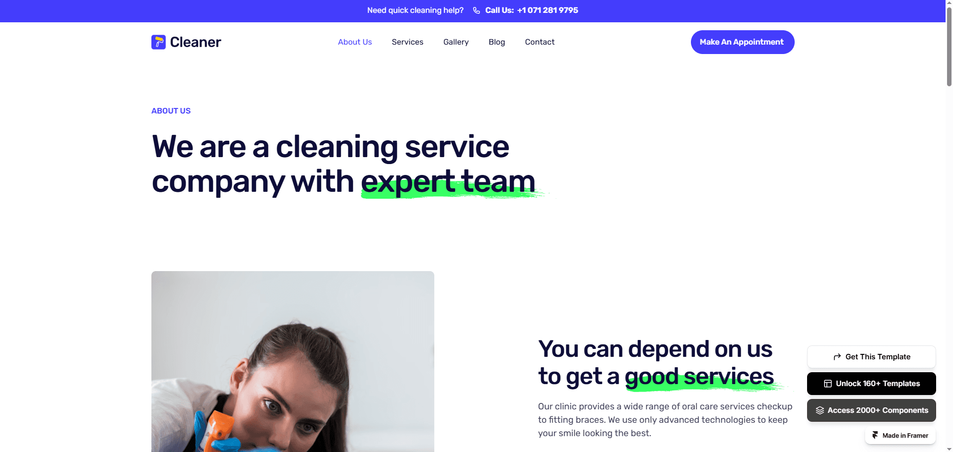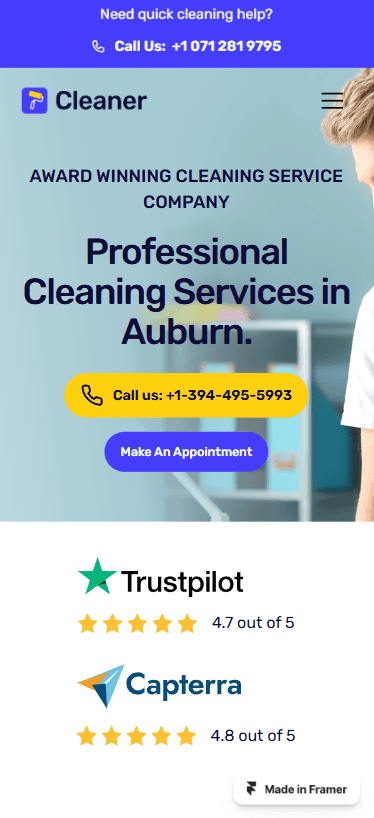 Cleaner is a premium cleaning service Framer template, purpose-built for local service business like cleaning, plumbing, HVAC, roofing etc to shine in the digital realm.