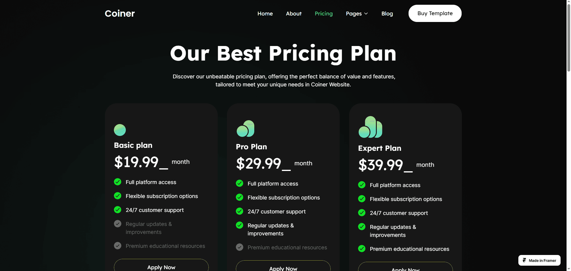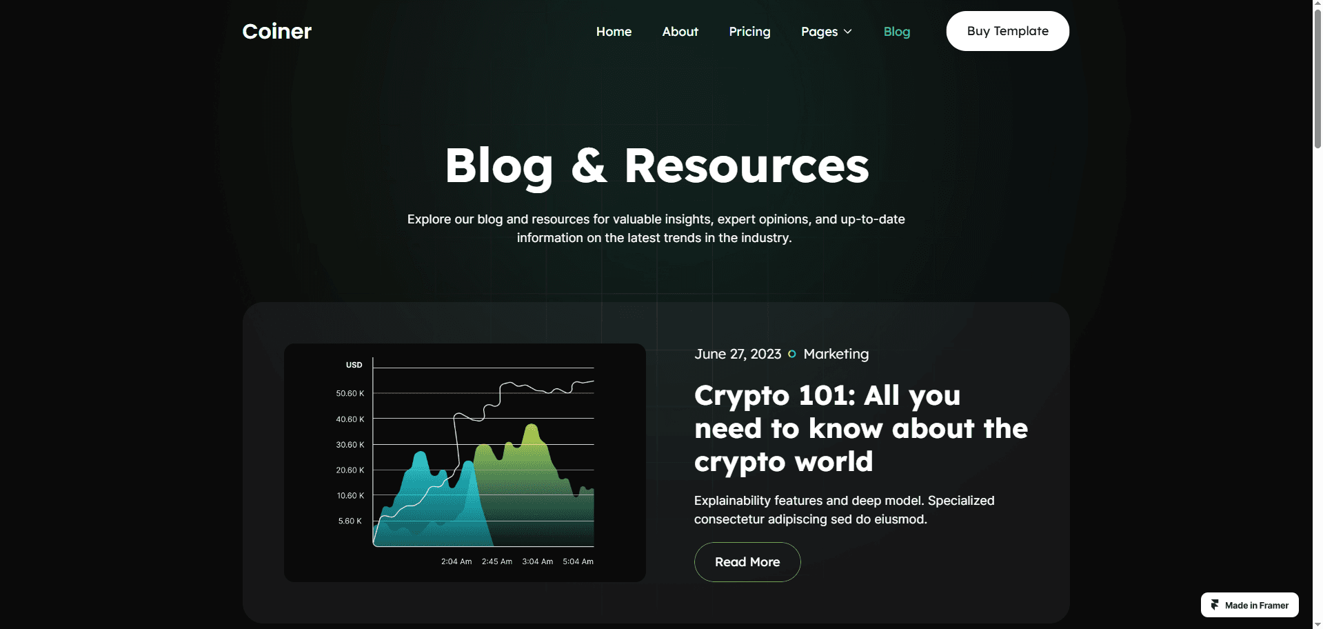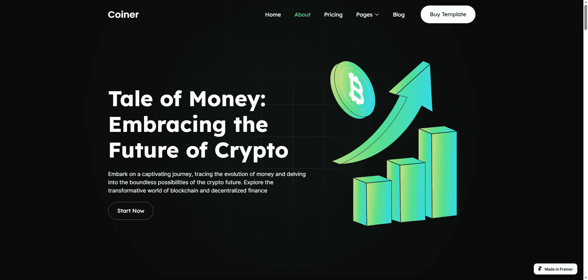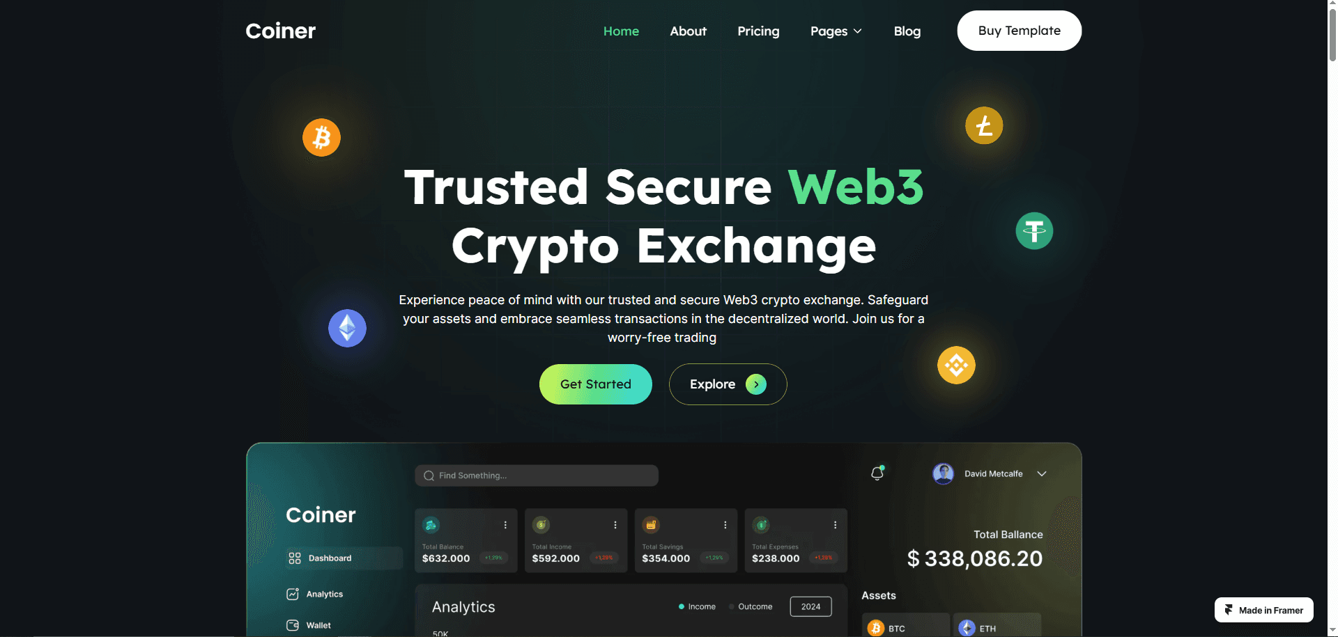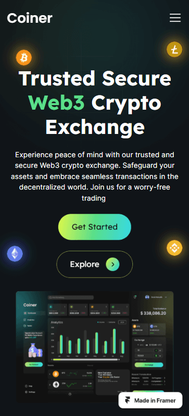 Coiner, a Framer template, is ideal for Web3, crypto, and blockchain websites. Featuring sleek design, interactive elements, and seamless animations, Coiner offers real-time experiences.