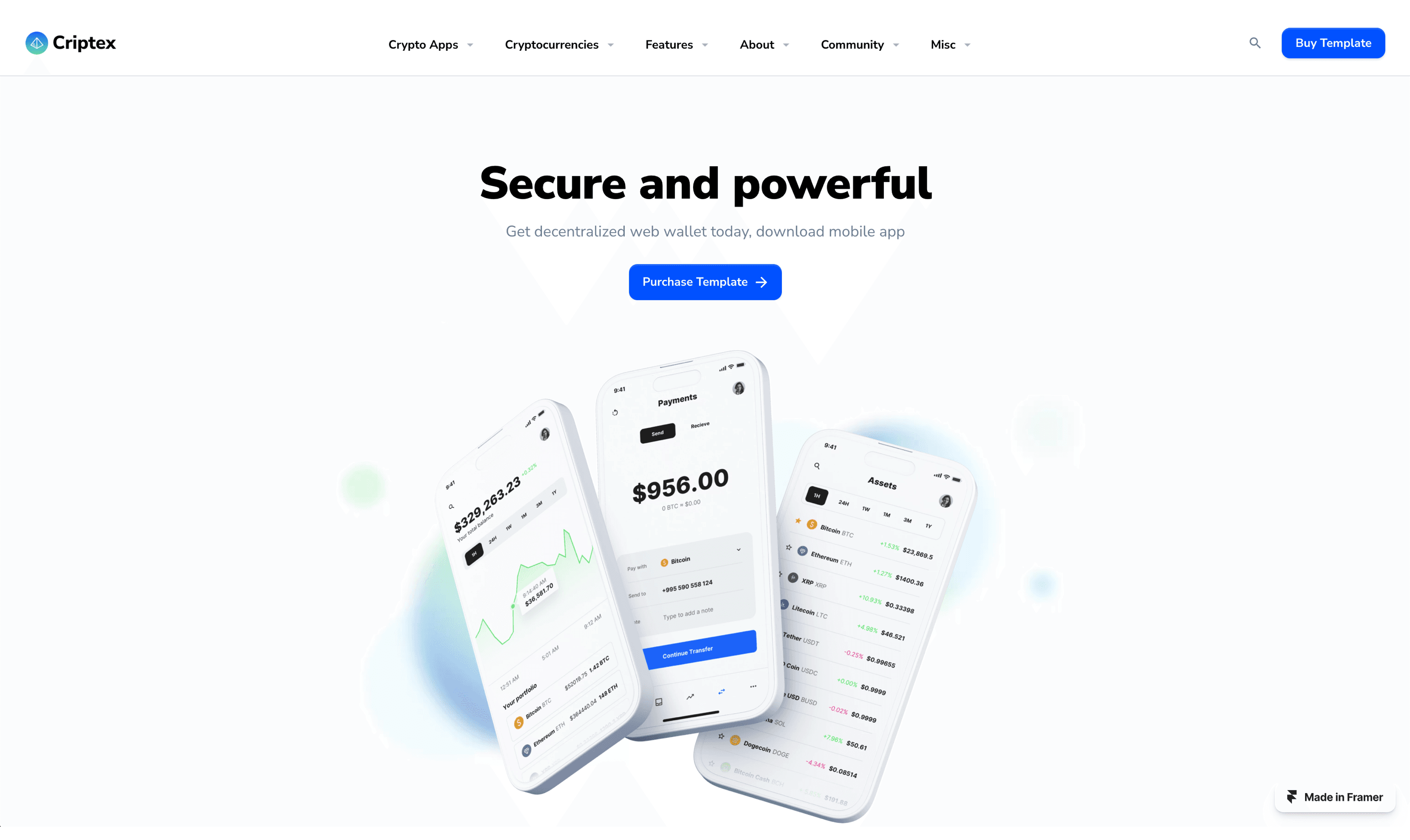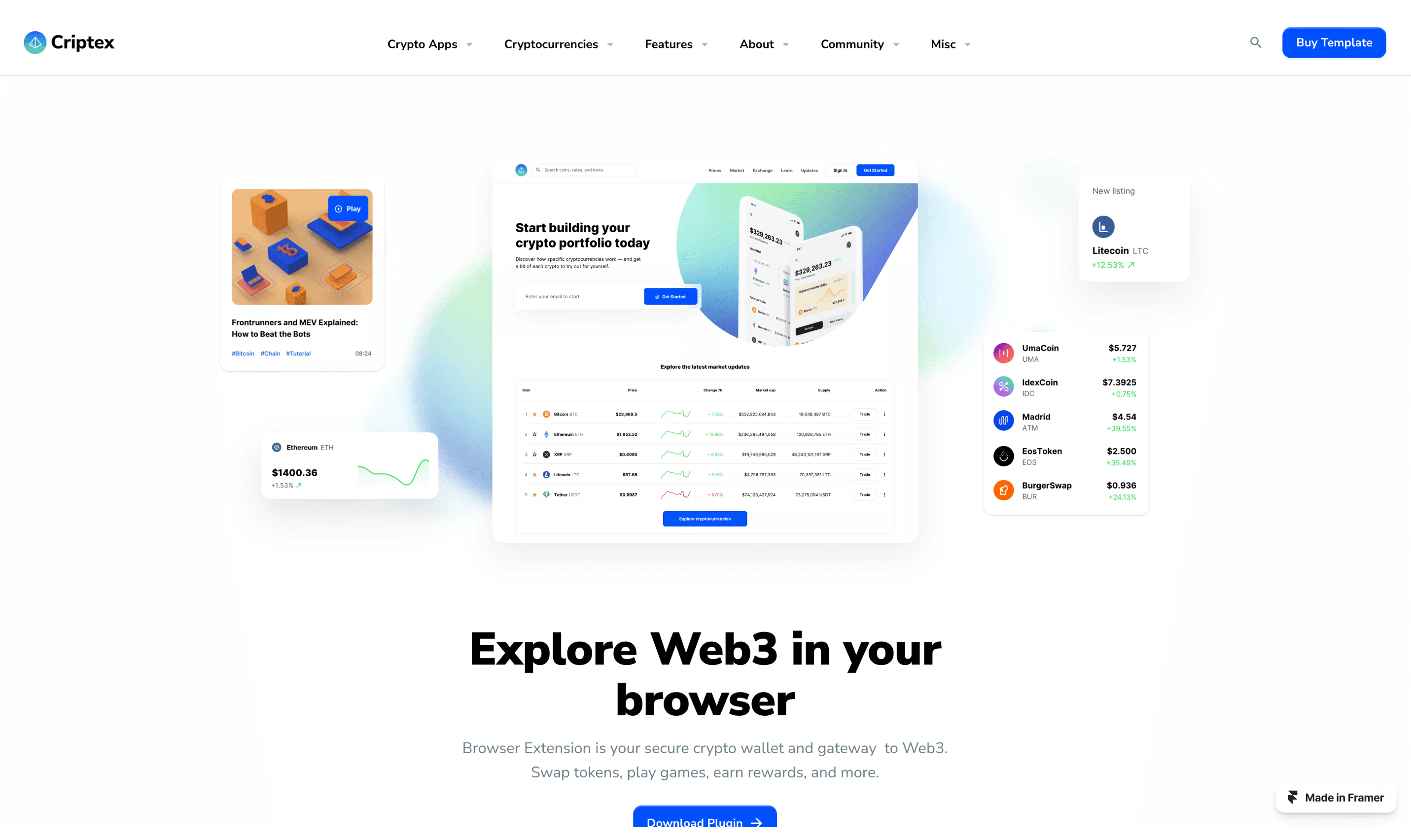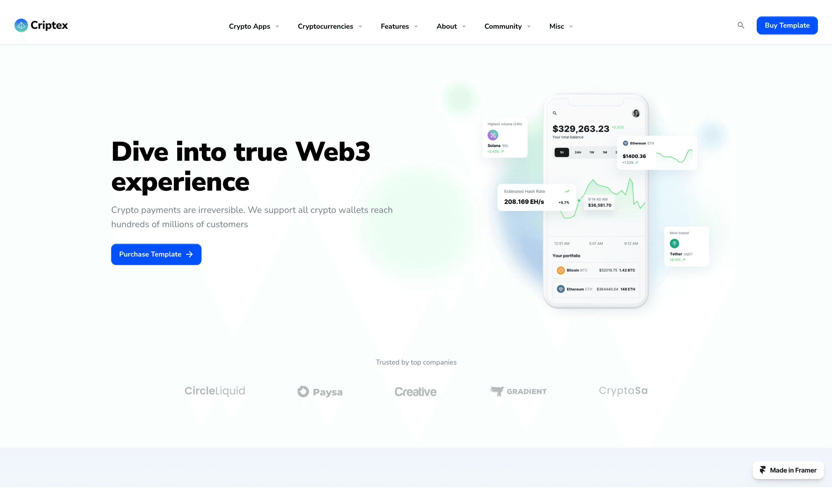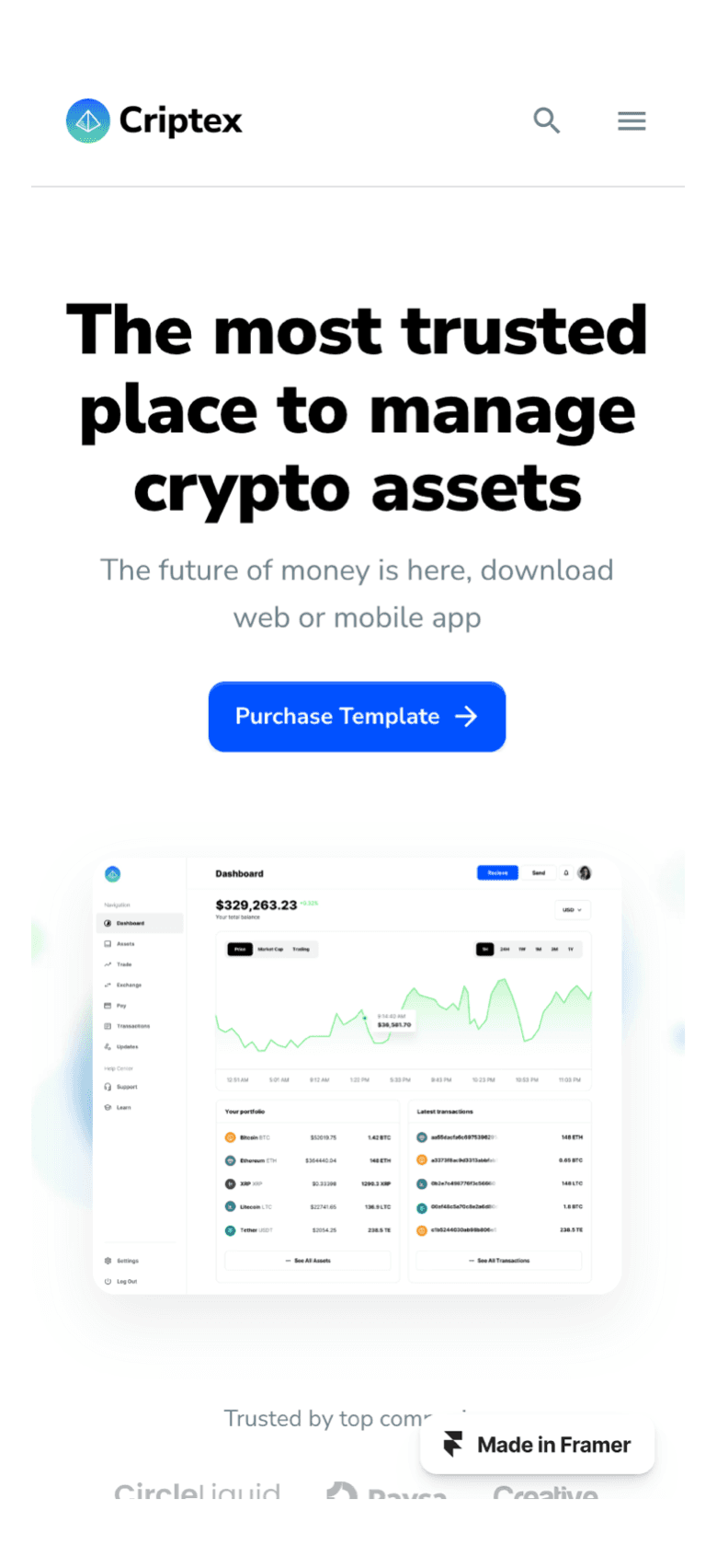Criptex is a multipurpose template for crypto and web3 startups made with Framer.