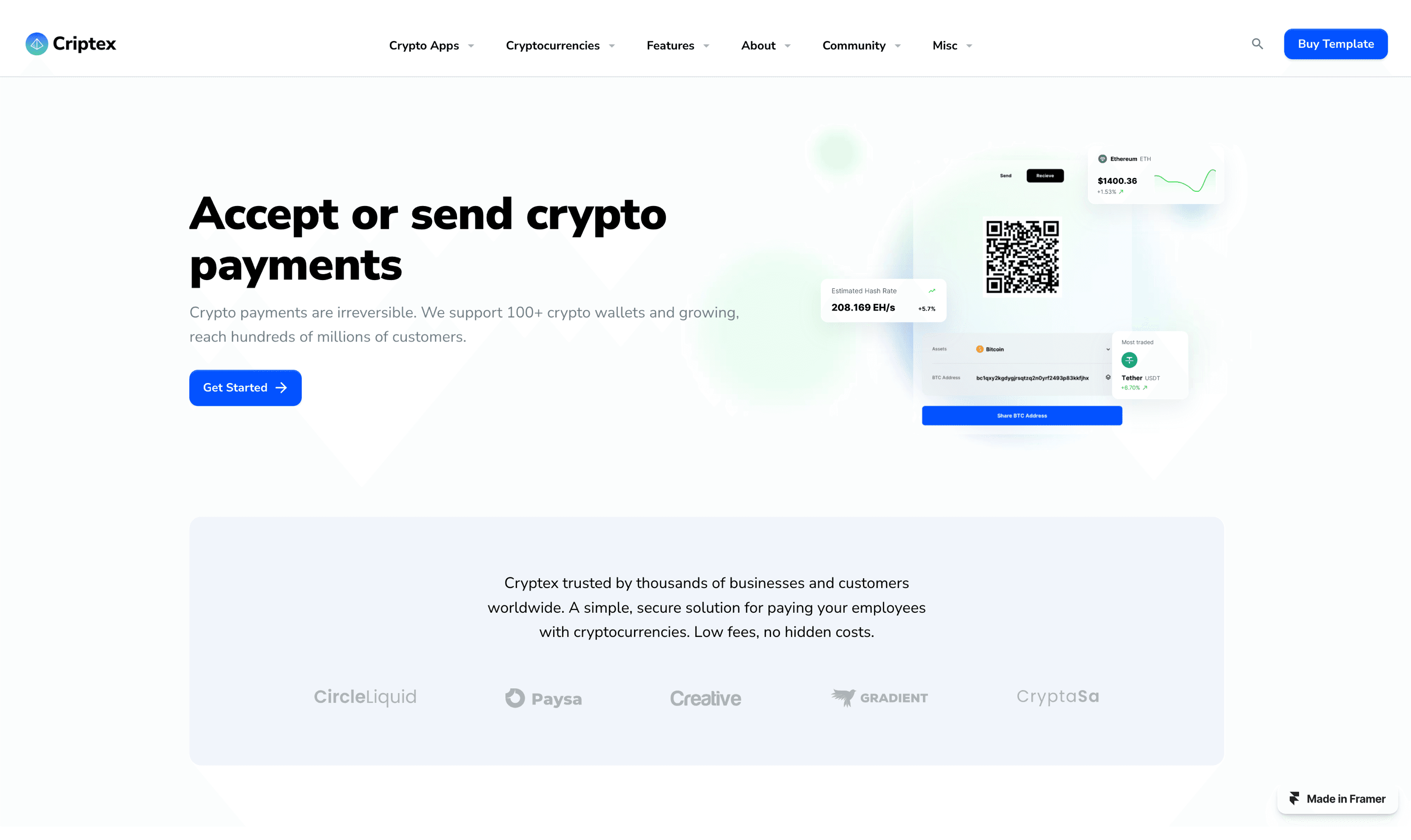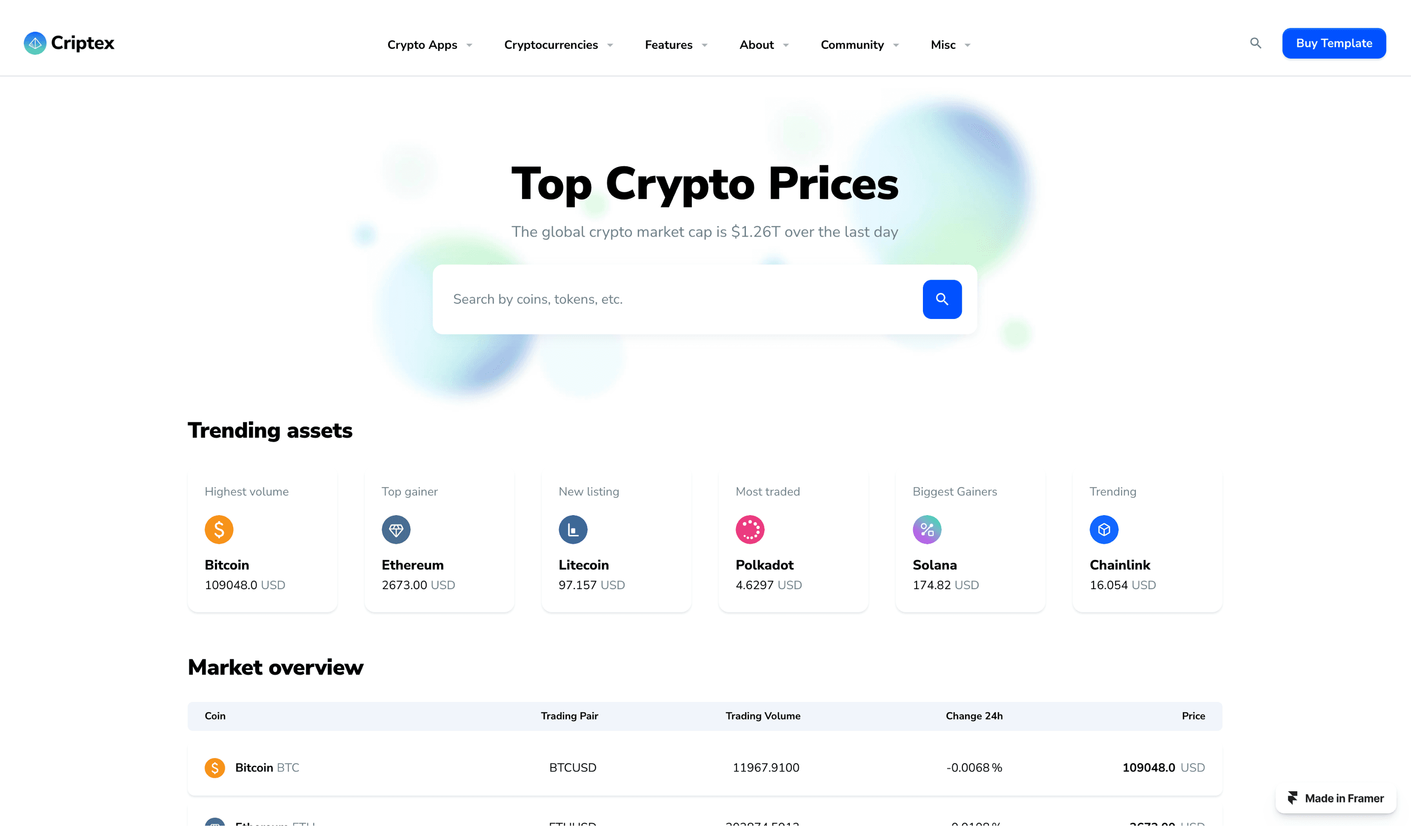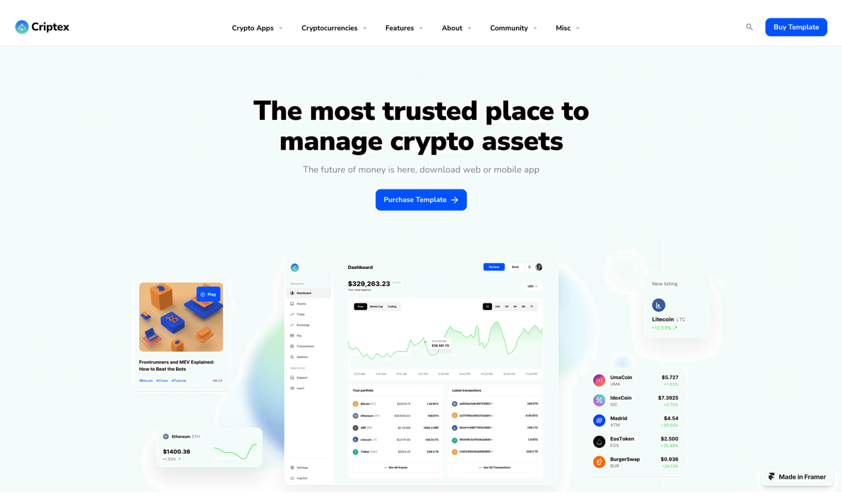 Criptex is a multipurpose template for crypto and web3 startups made with Framer.