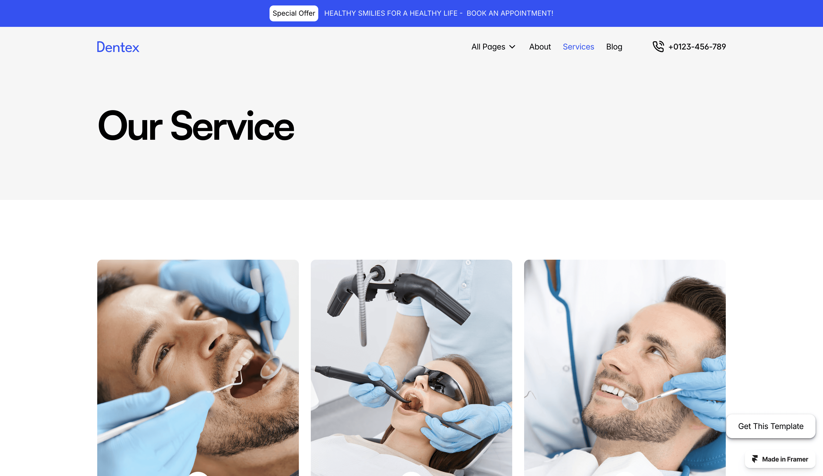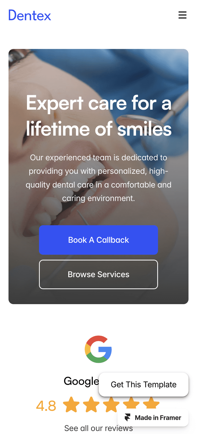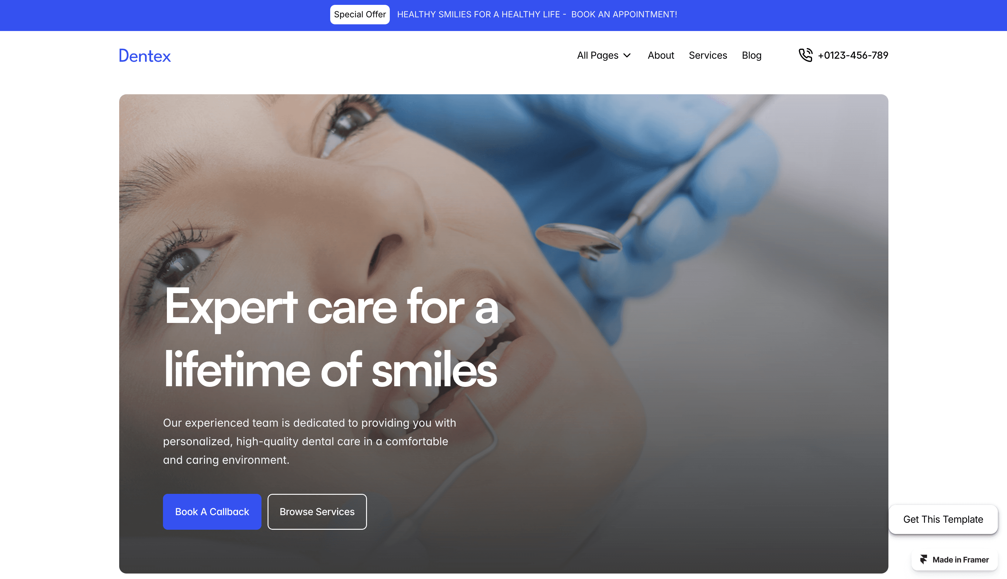 Dentex is a free Framer template crafted for dental professionals, blending modern design with seamless functionality.
