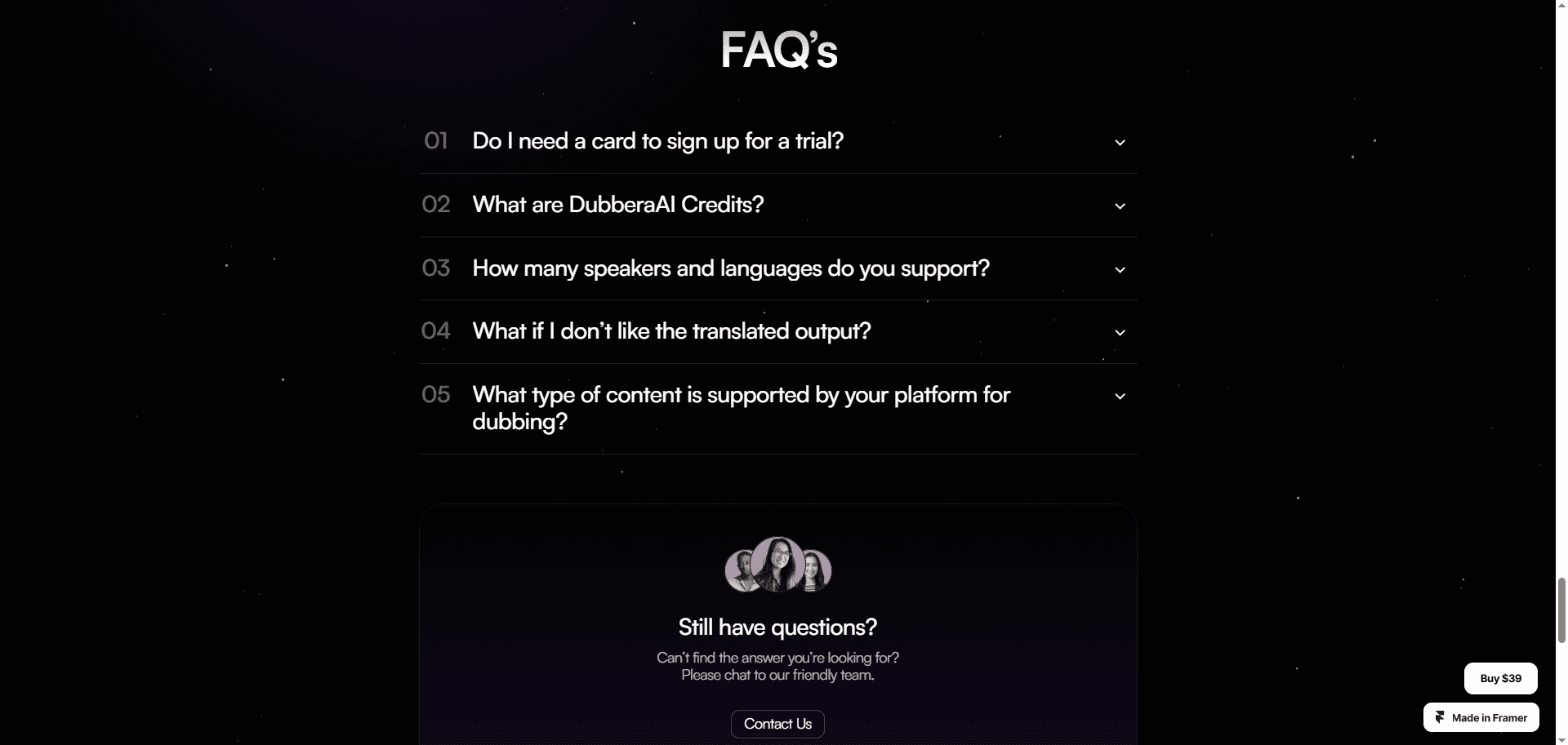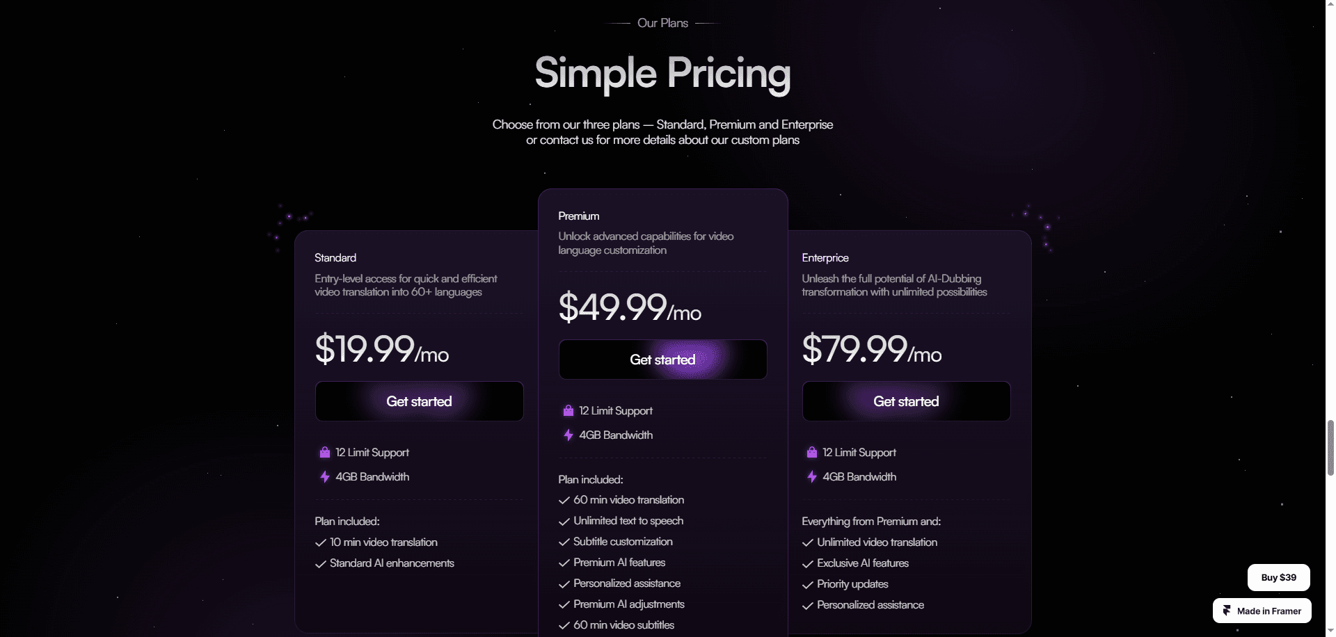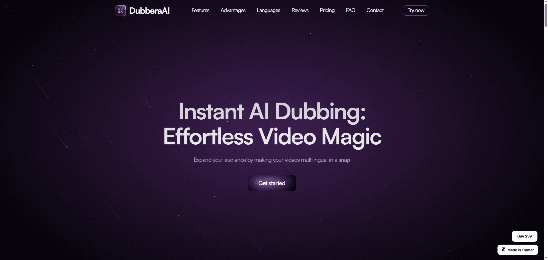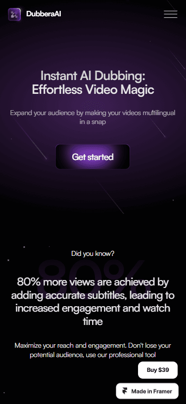 Dubber AI: Explore the cosmos of AI and web3 with this dark Framer template. Immerse in purple glow elements for a futuristic web experience. Elevate your digital presence now!