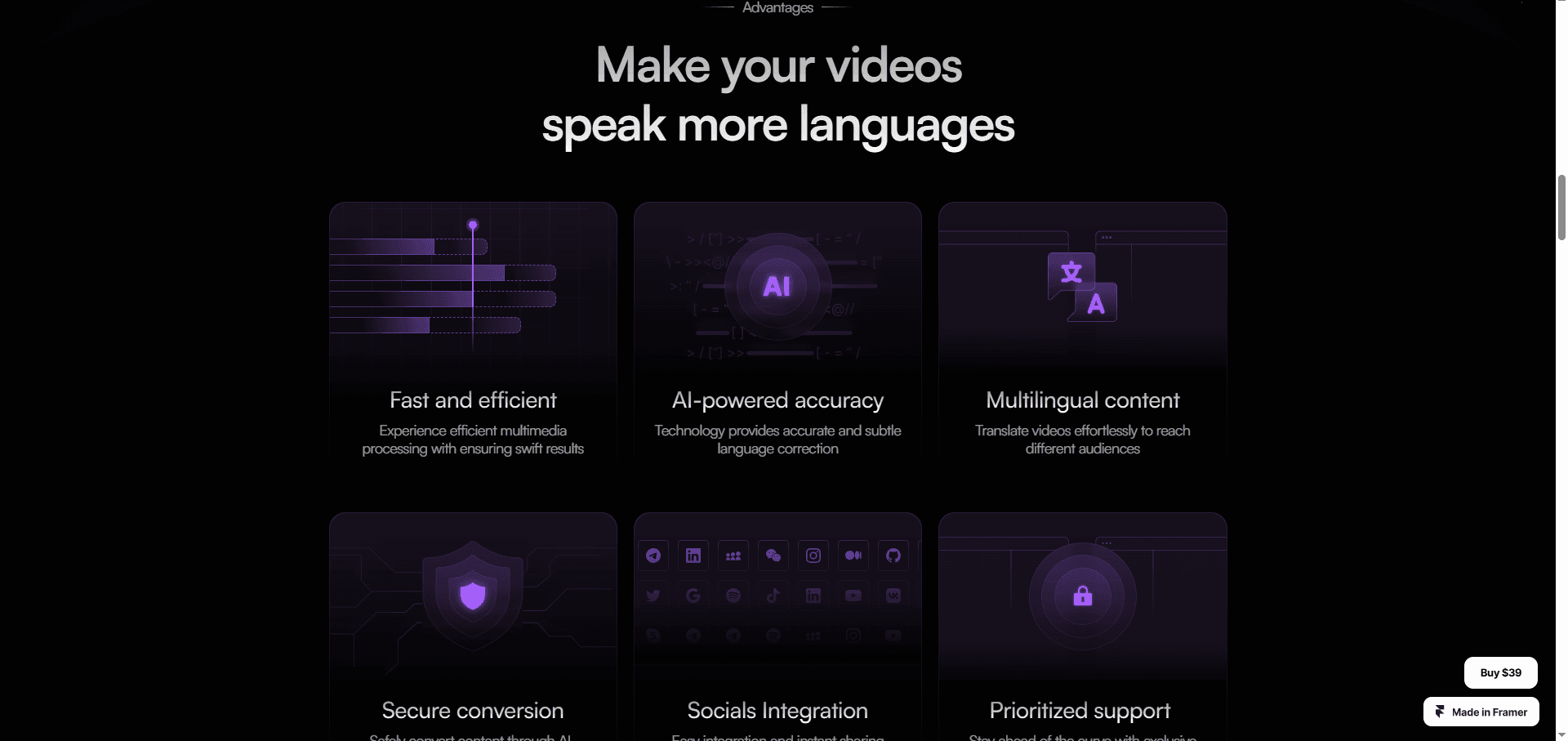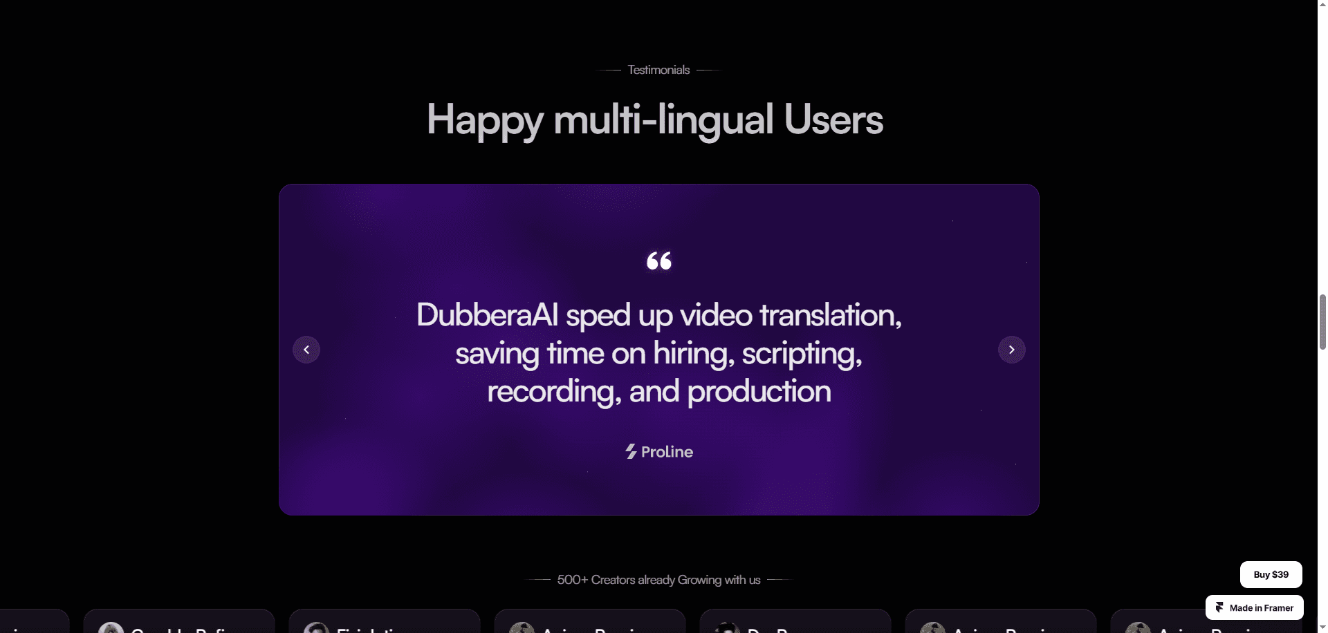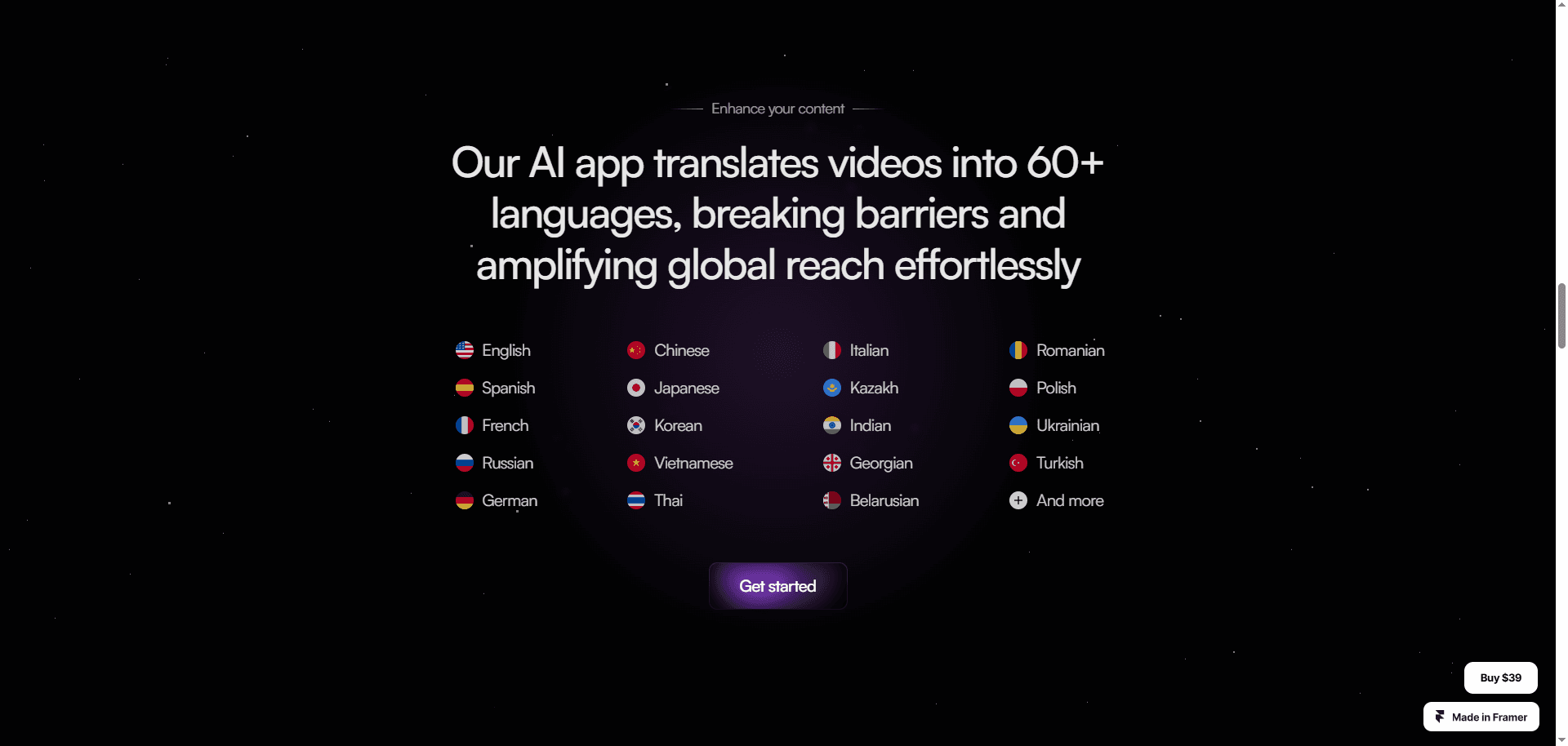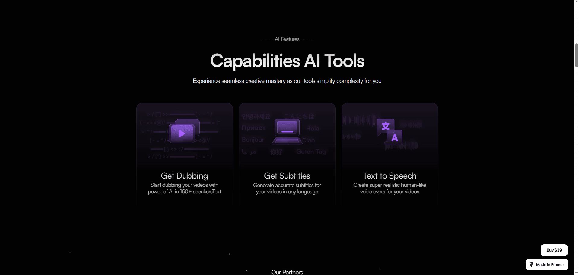 Dubber AI: Explore the cosmos of AI and web3 with this dark Framer template. Immerse in purple glow elements for a futuristic web experience. Elevate your digital presence now!