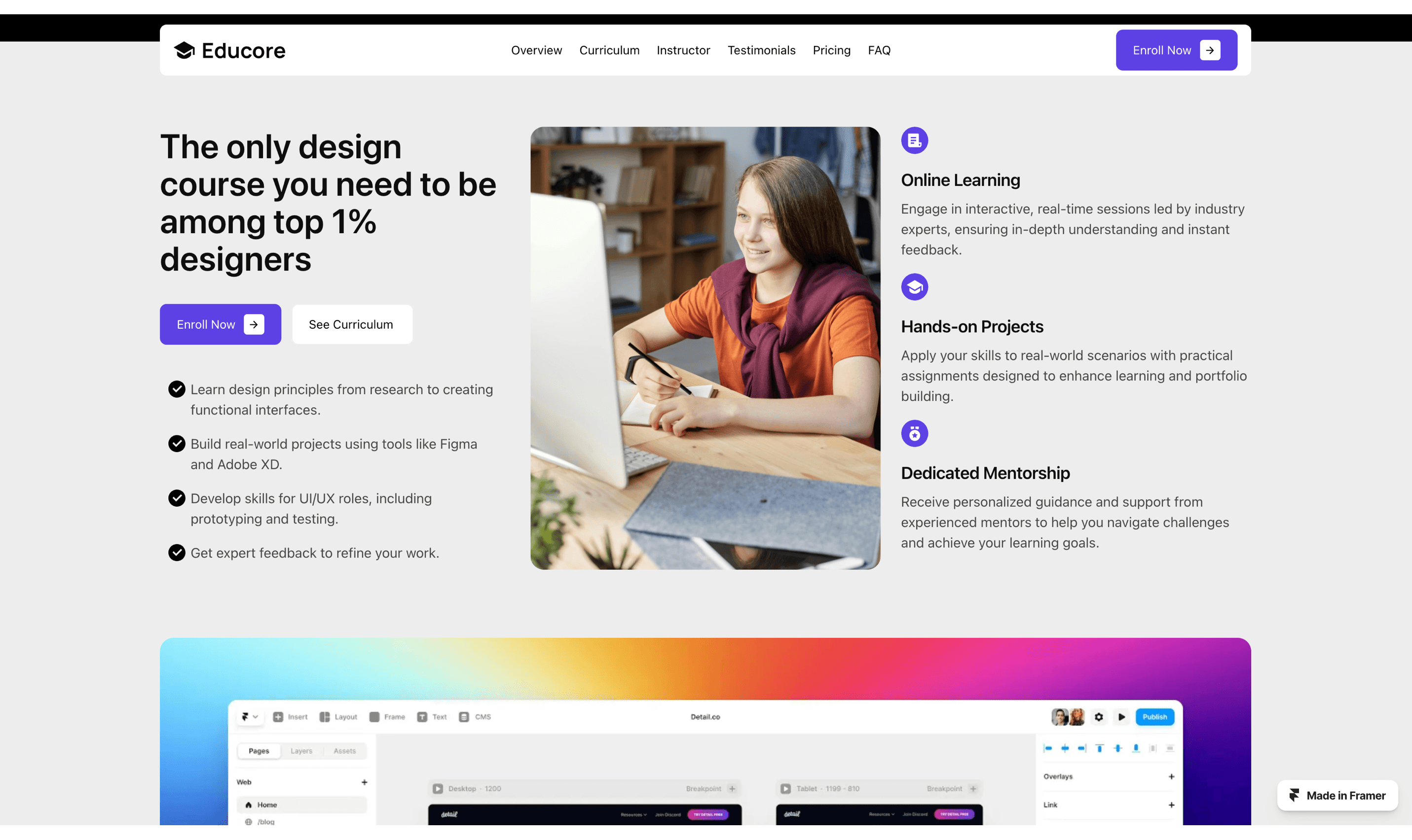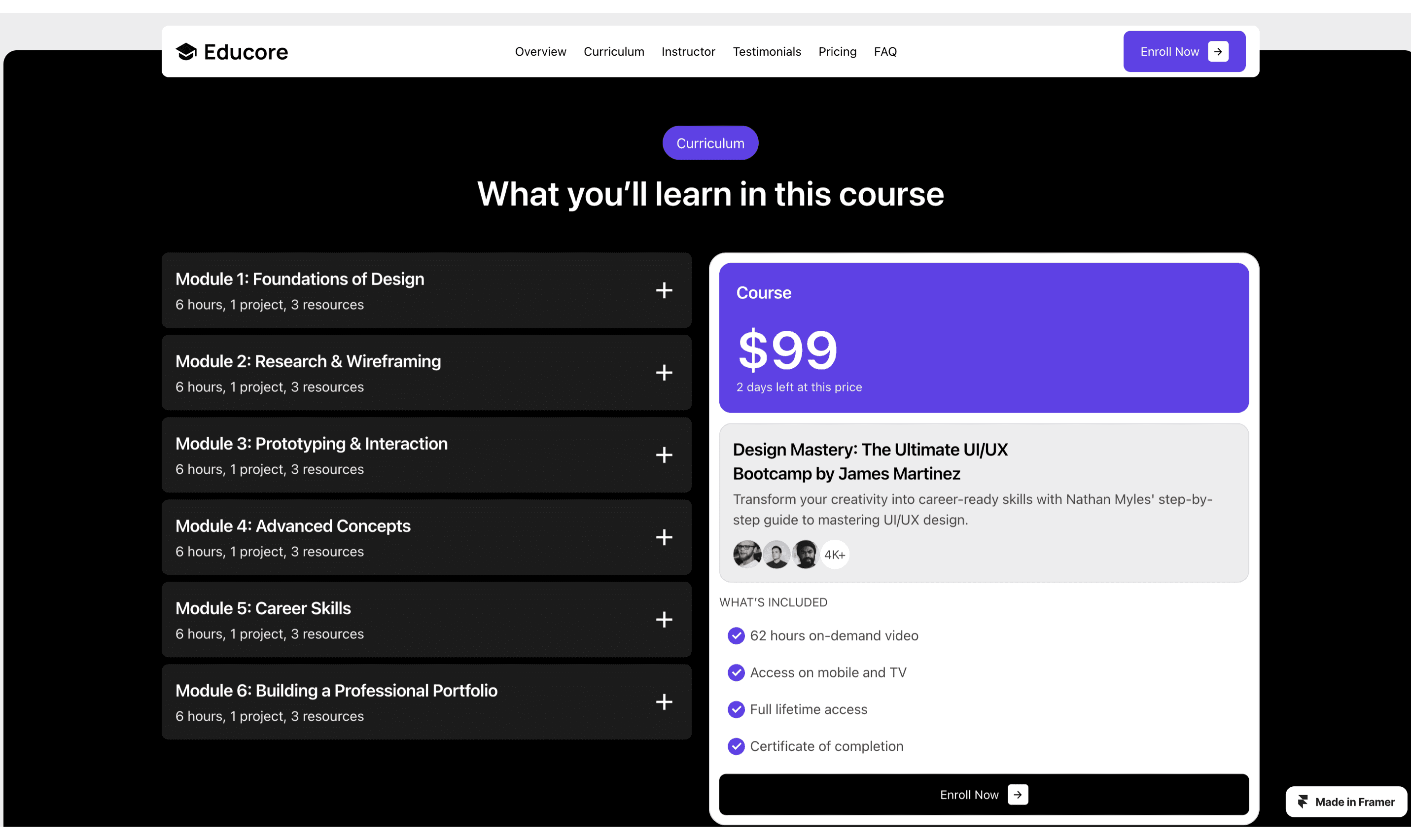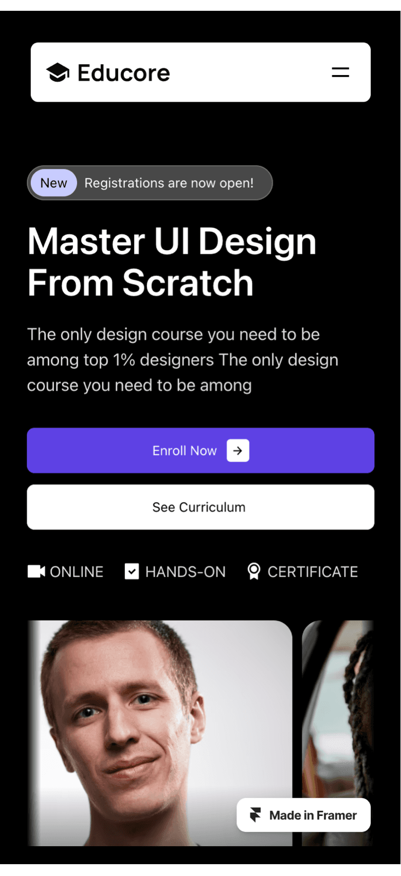 Educore is a feature-rich Framer template tailored for online education, specifically for UI/UX design courses.