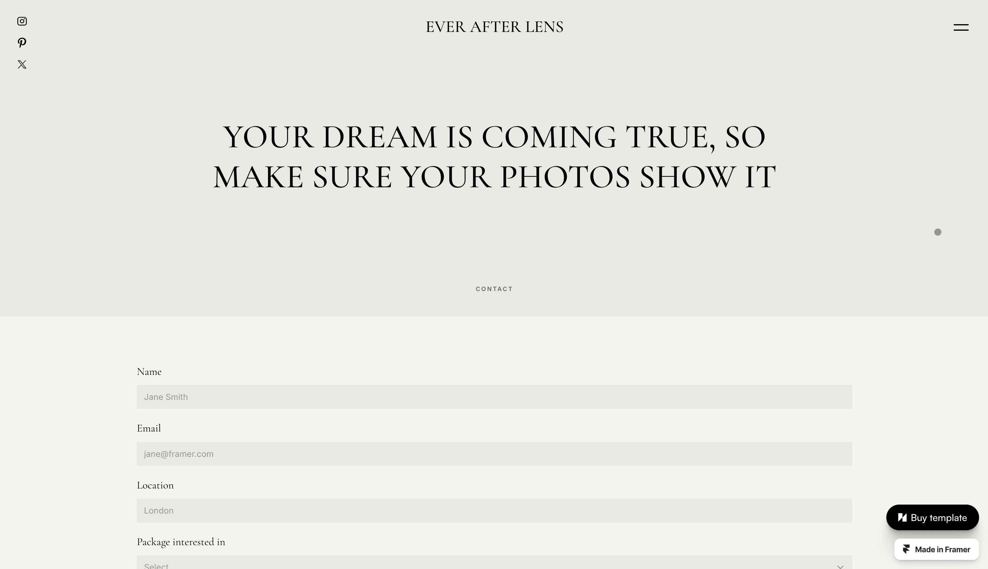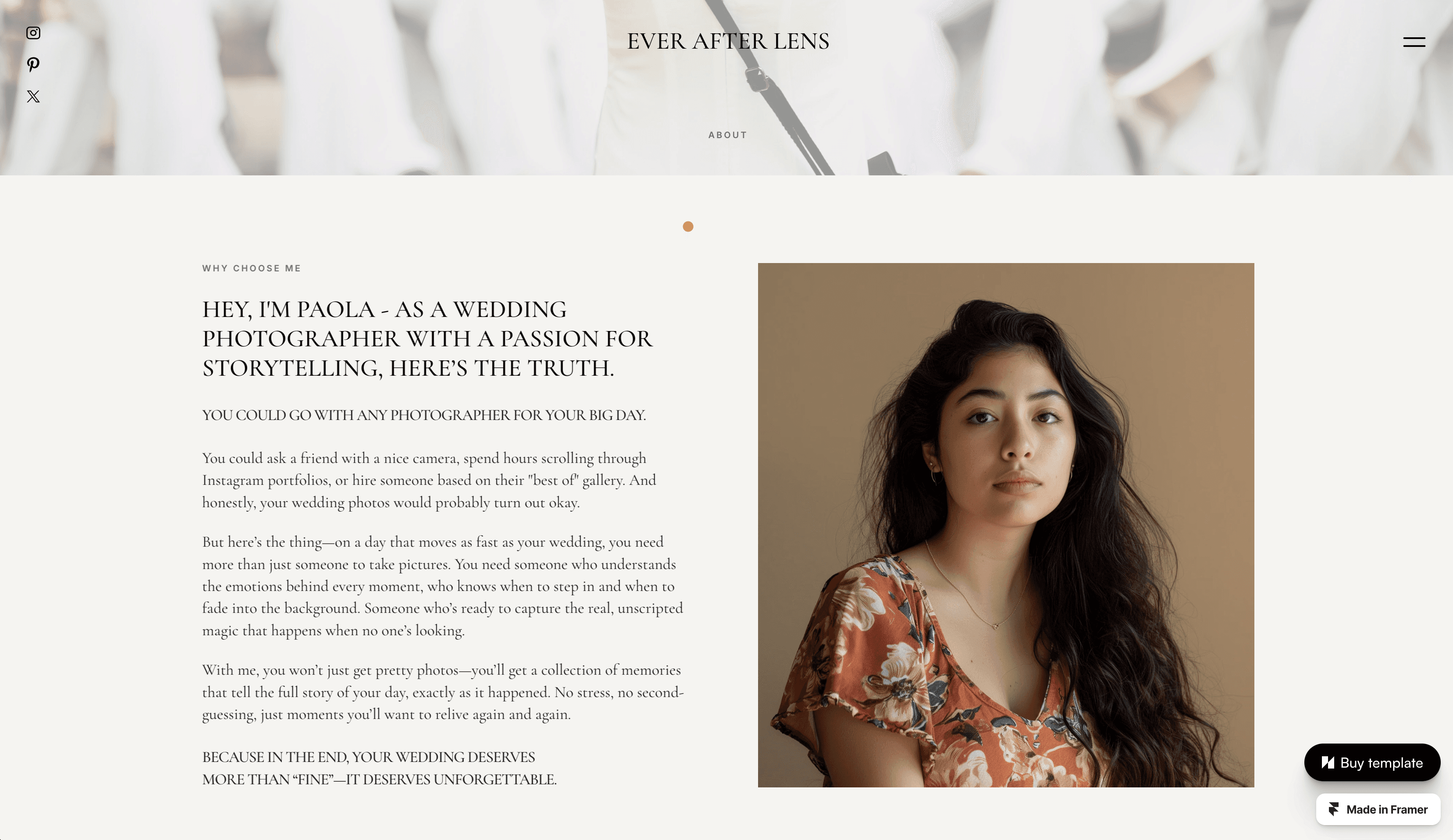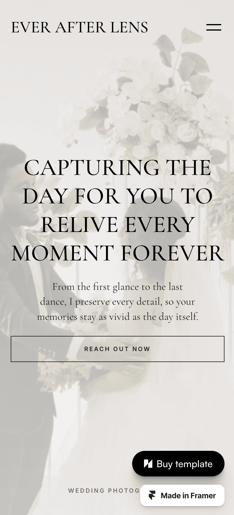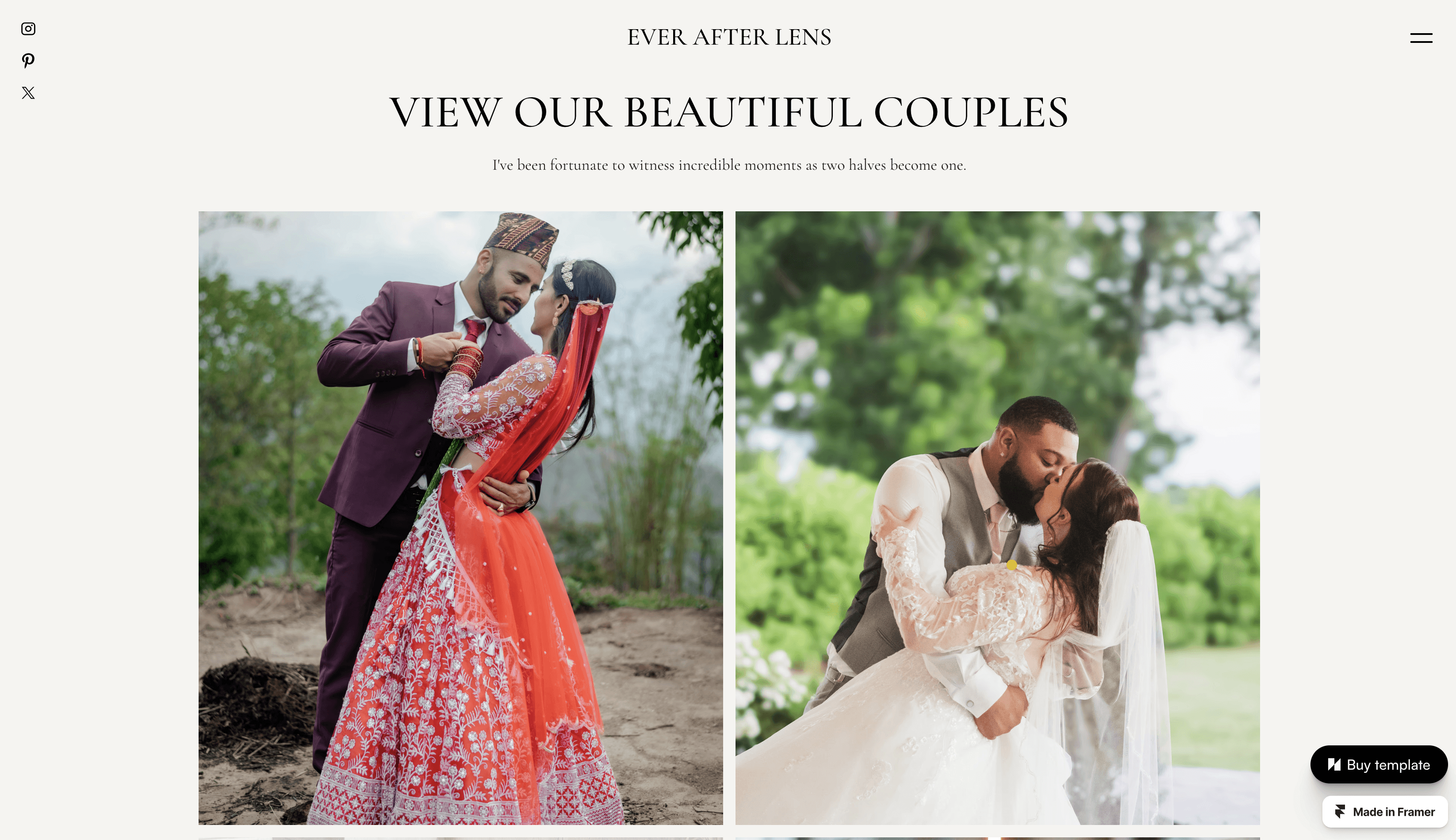 The Ever After Lens Framer template is perfect for wedding photographers who want a timeless, beautifully designed website to highlight their portfolio and services, connecting with couples effortlessly.
