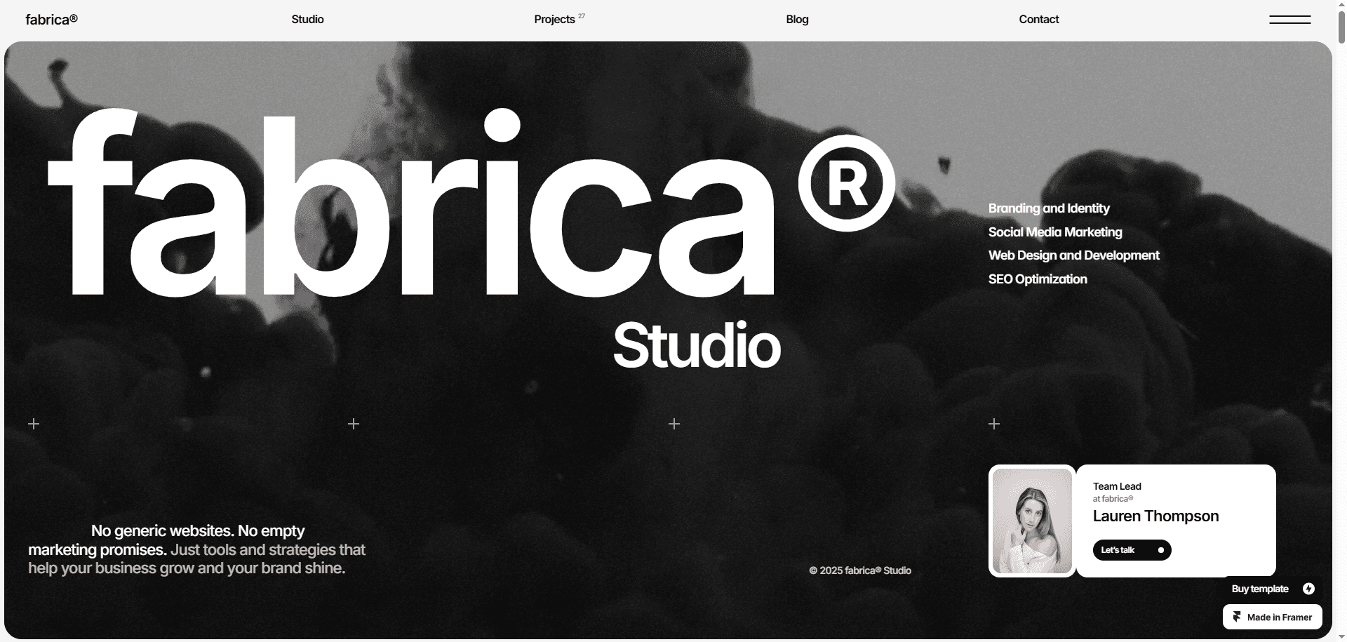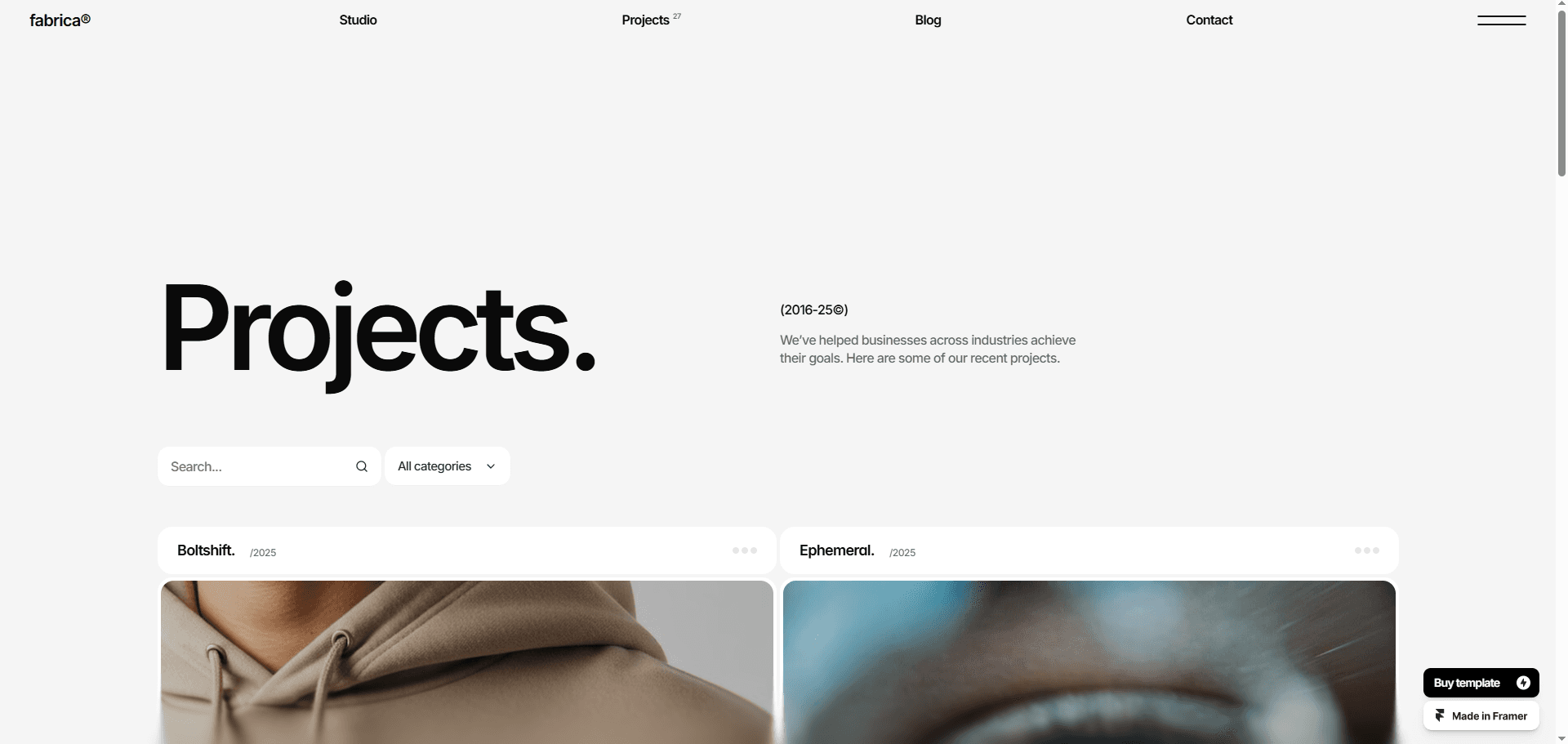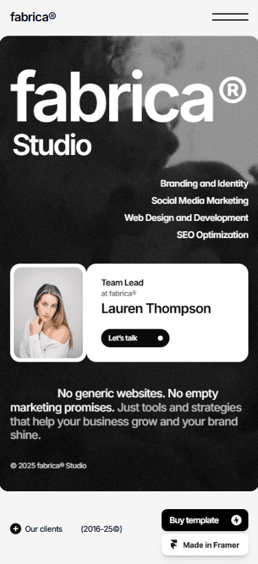 FABRICA® is a sleek, monochrome Framer website template designed for creative studios.