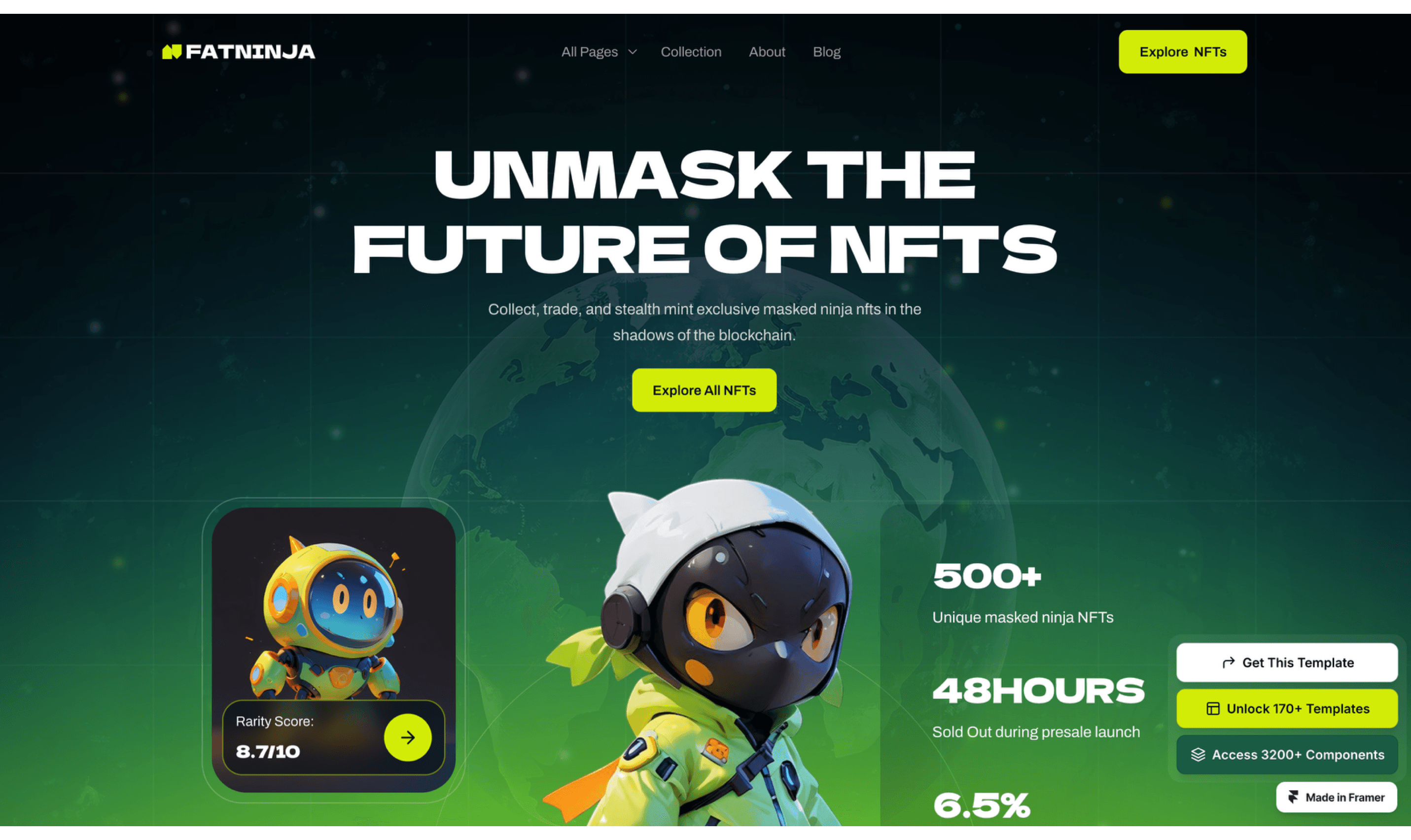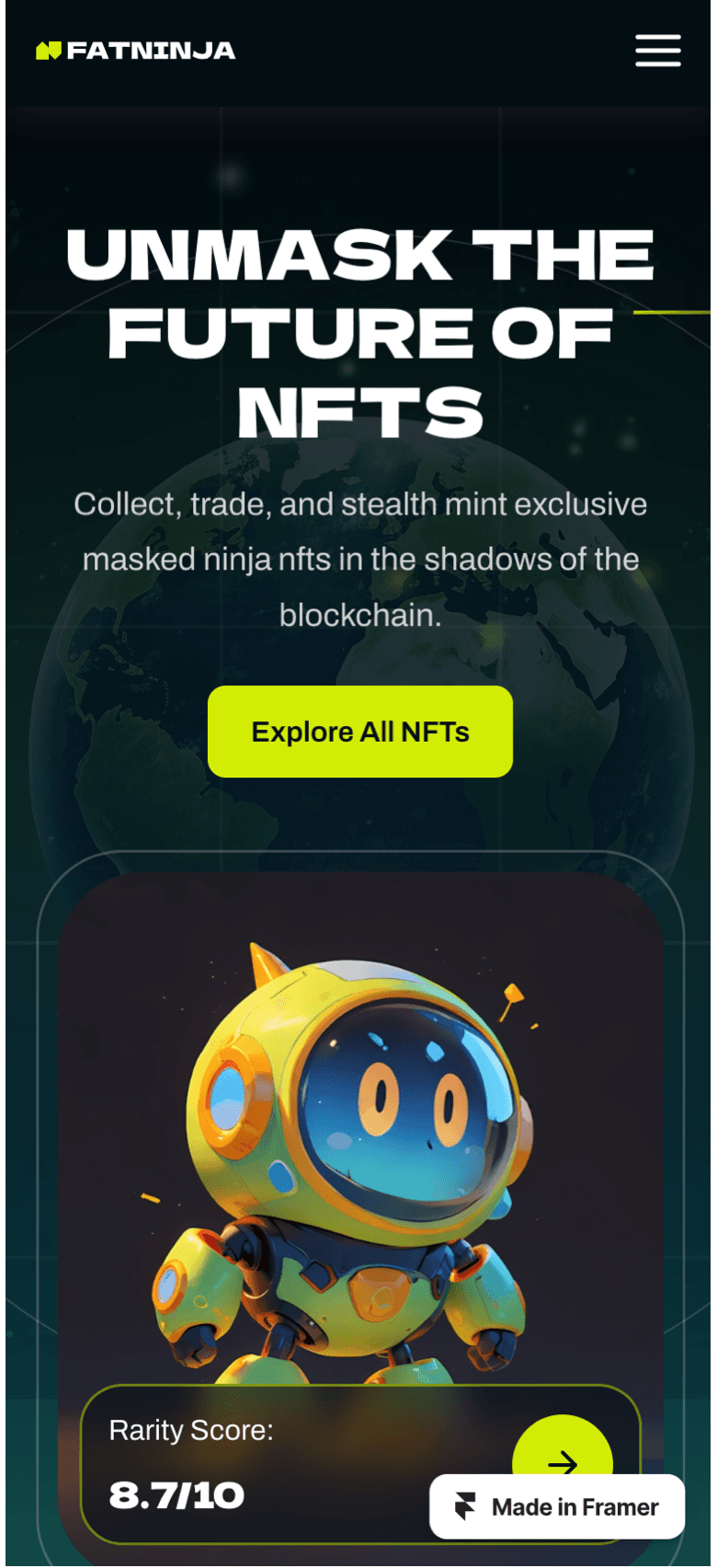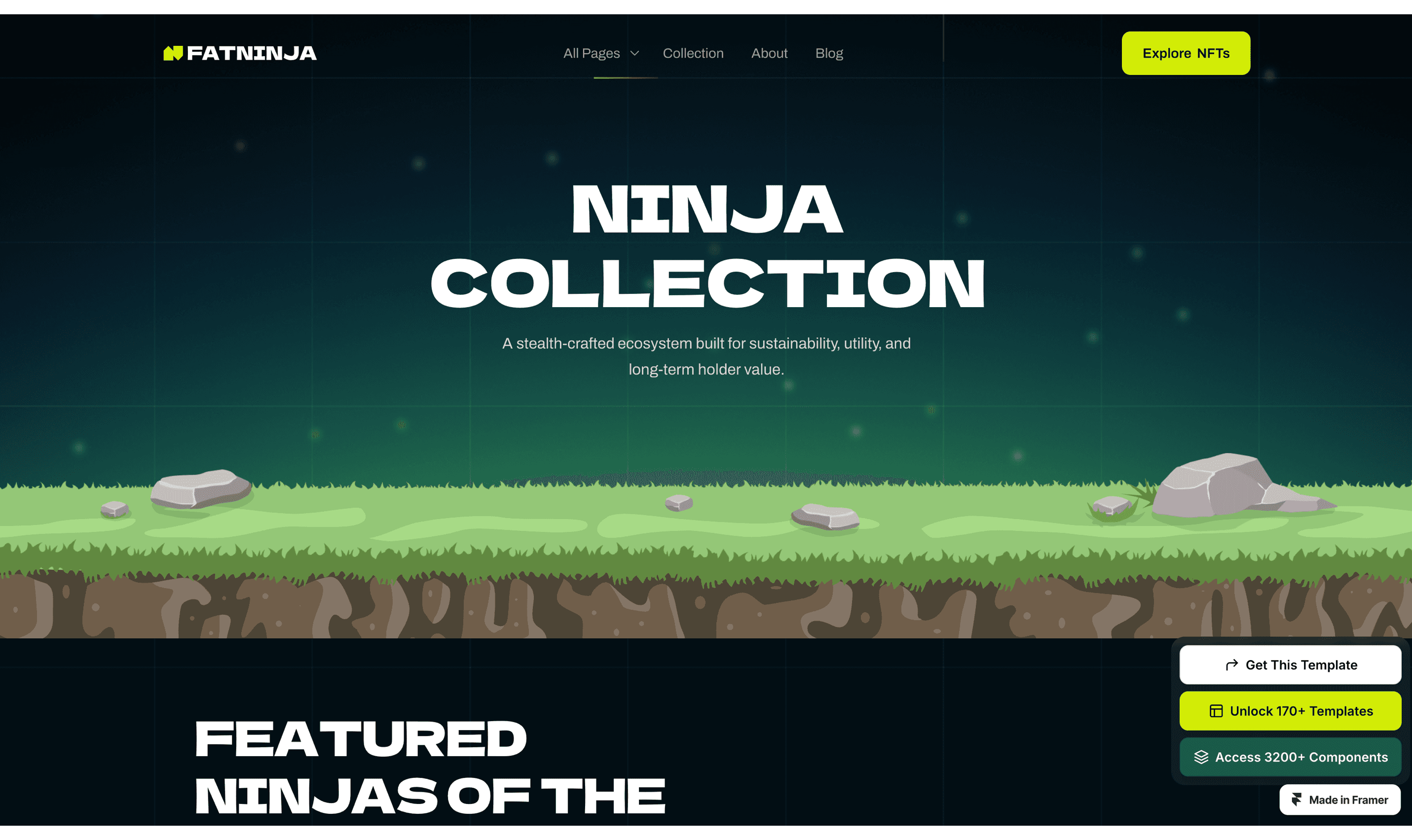 FatNinja is a futuristic and eye-catching Framer template crafted for NFT projects, Cryptocurrency. digital collectibles, blockchain and Web3 ventures.