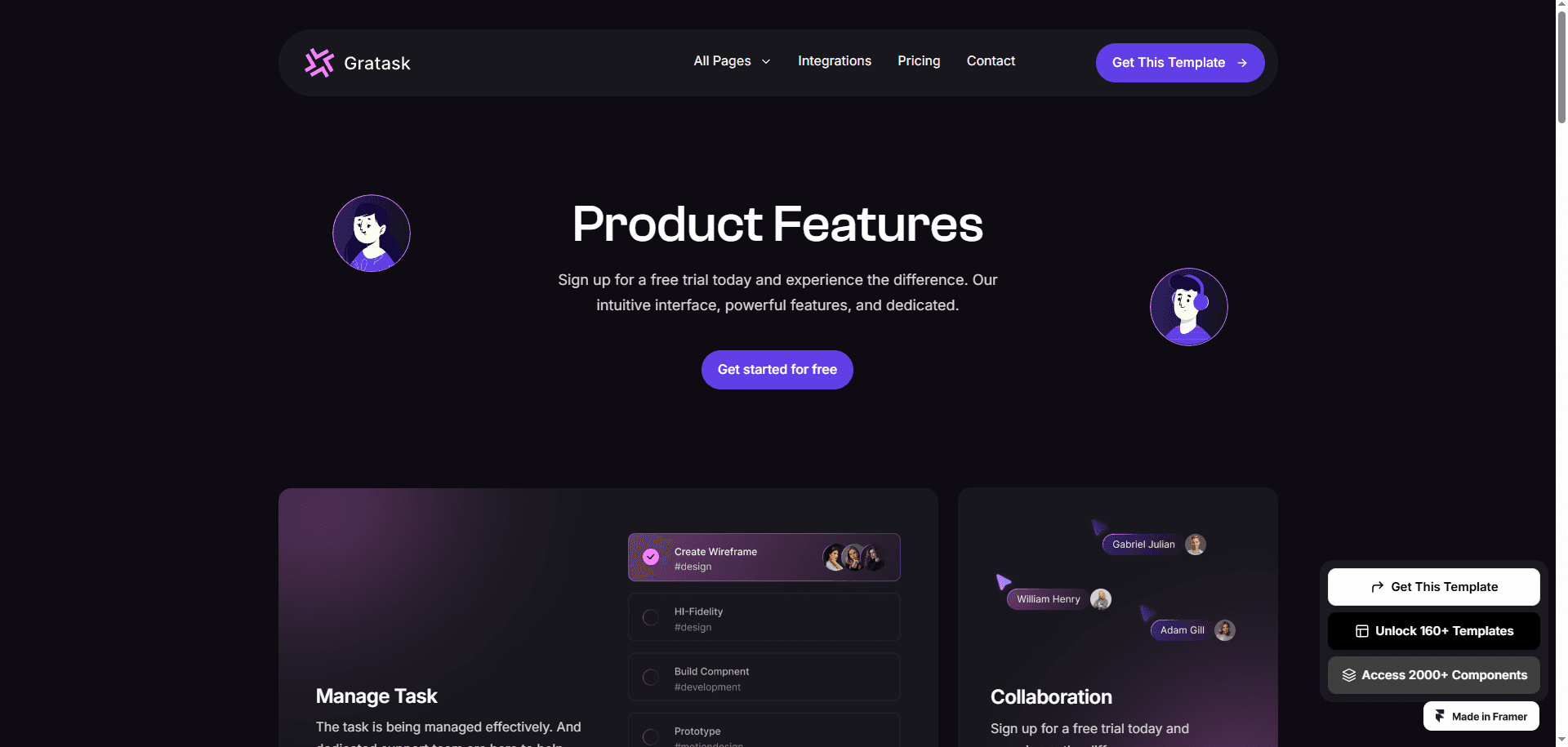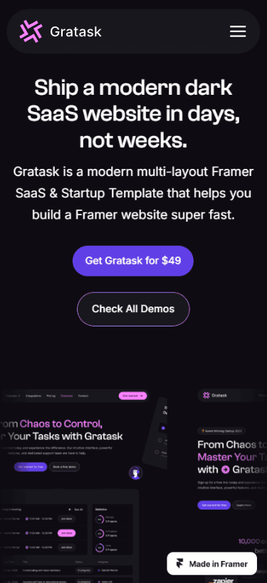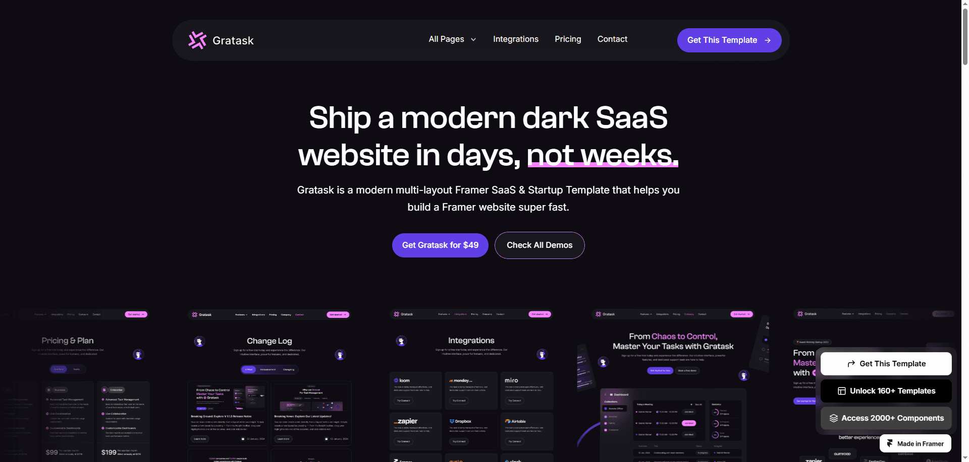 Gratask is a high-quality multi-layout dark Framer template designed for SaaS and startup websites.