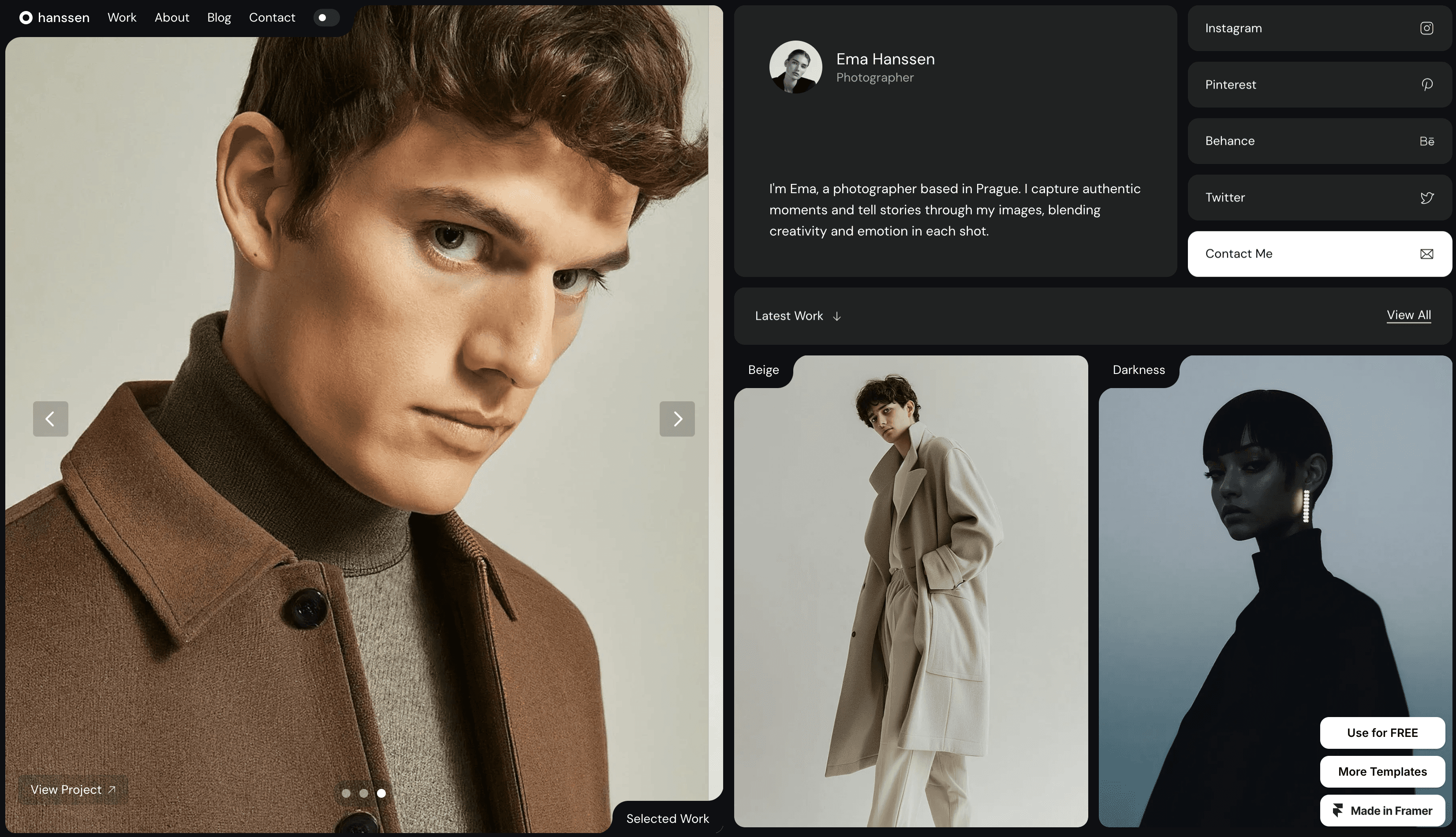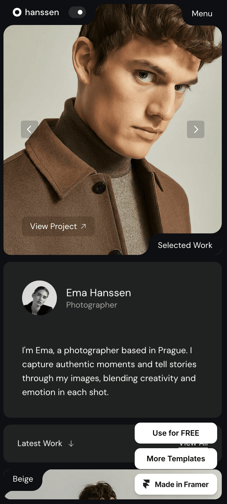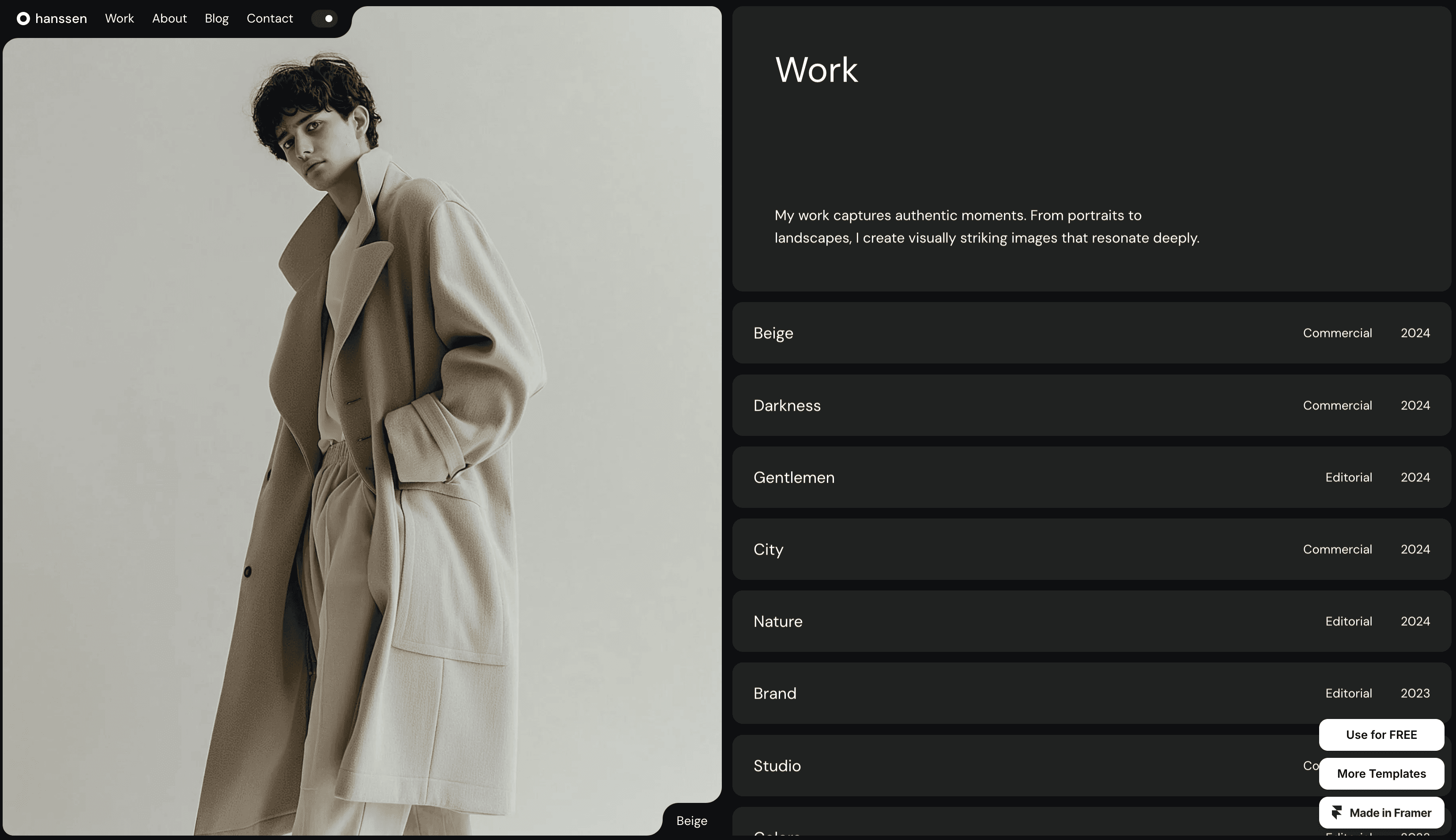 Hanssen is a minimal Framer template tailored for personal portfolios, allowing you to display your work in both light and dark modes.