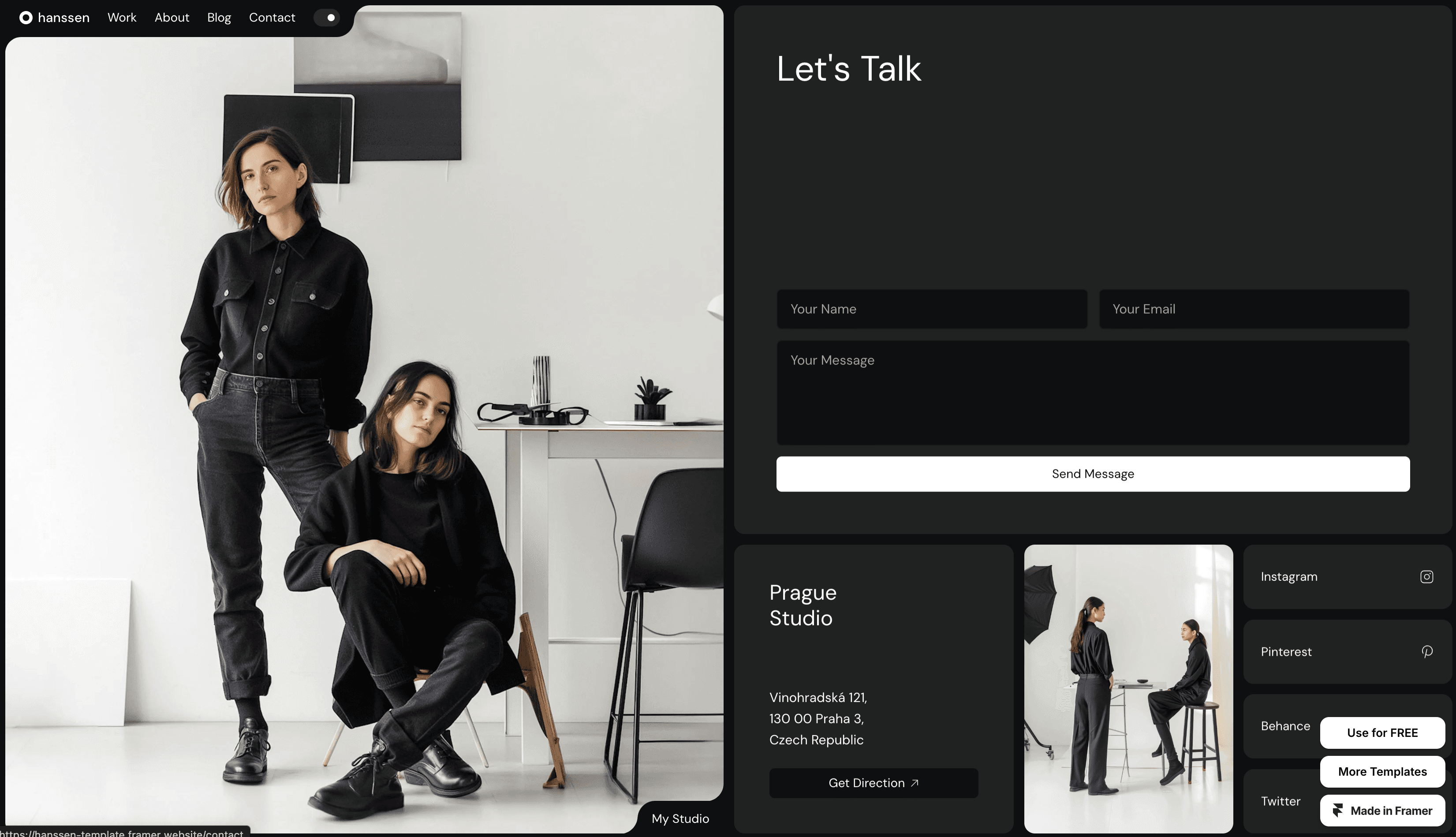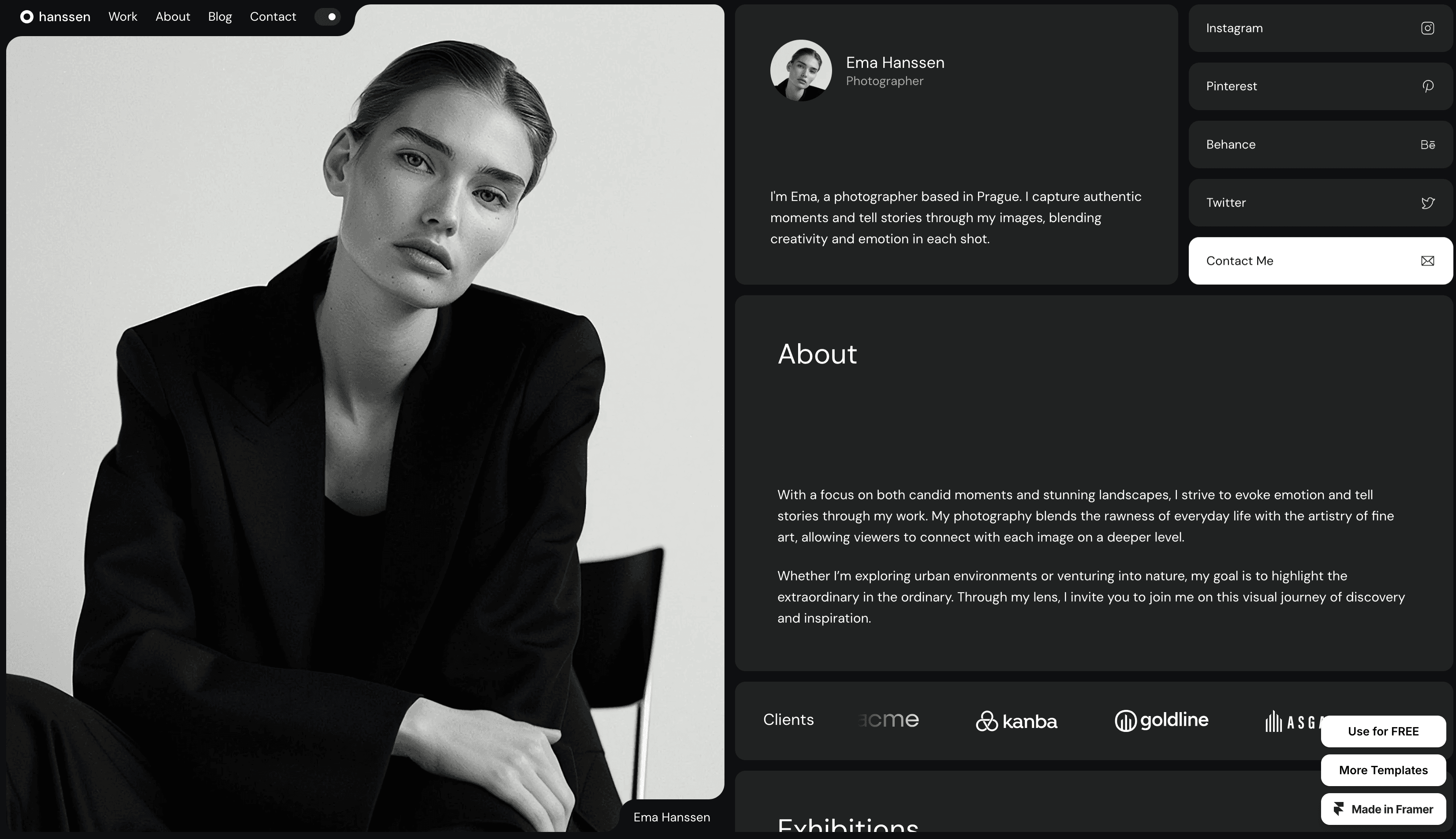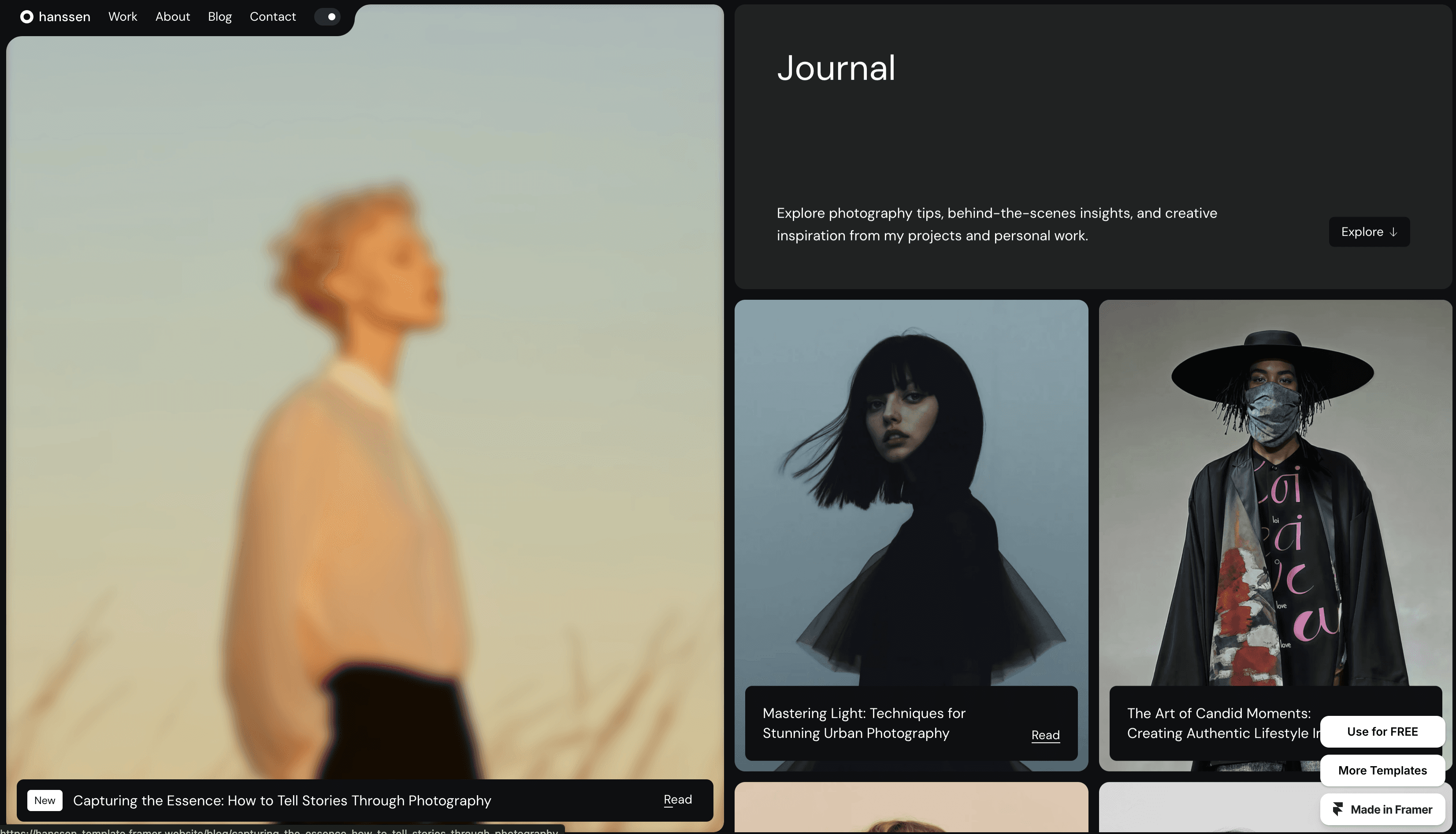 Hanssen is a minimal Framer template tailored for personal portfolios, allowing you to display your work in both light and dark modes.