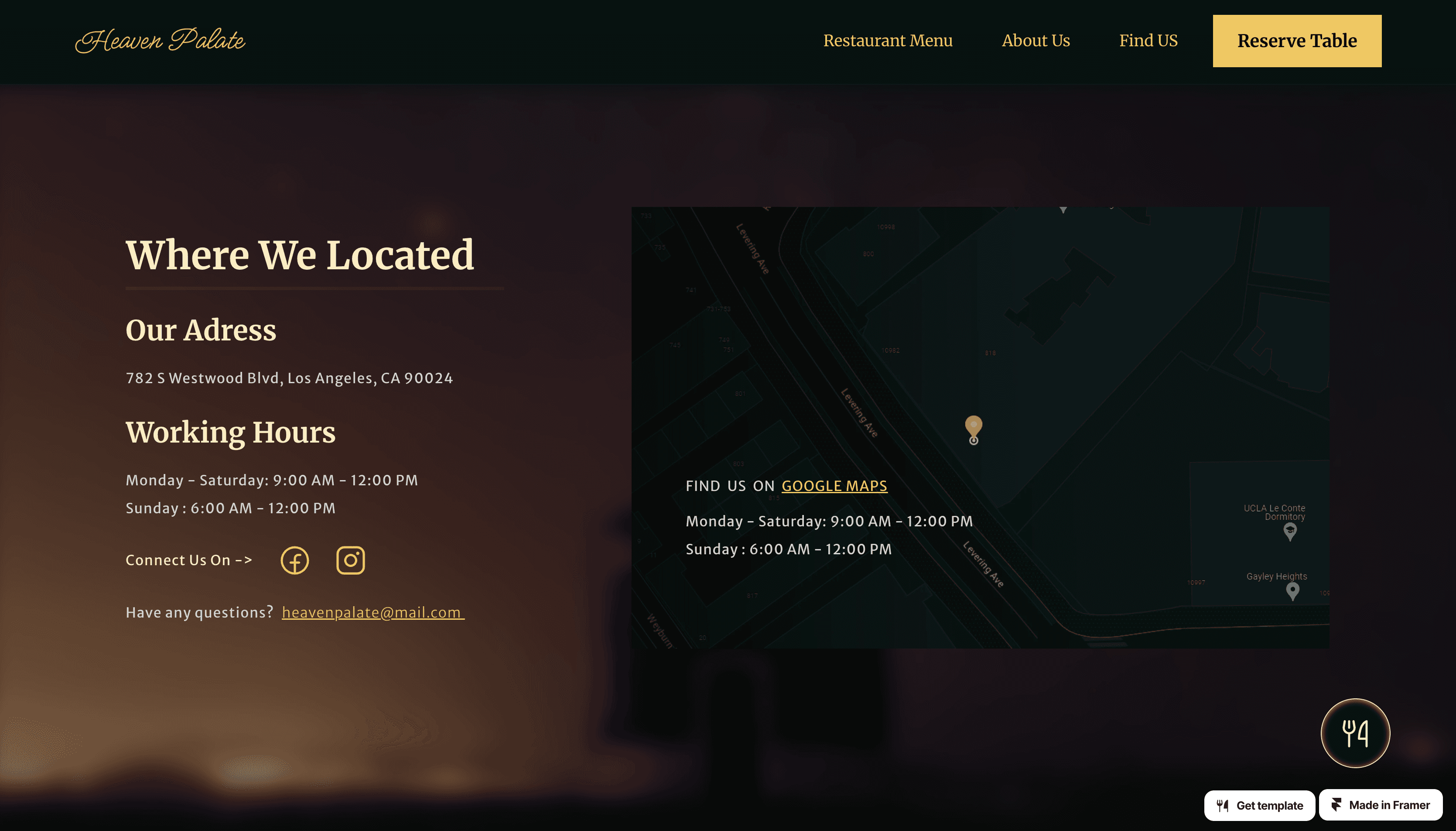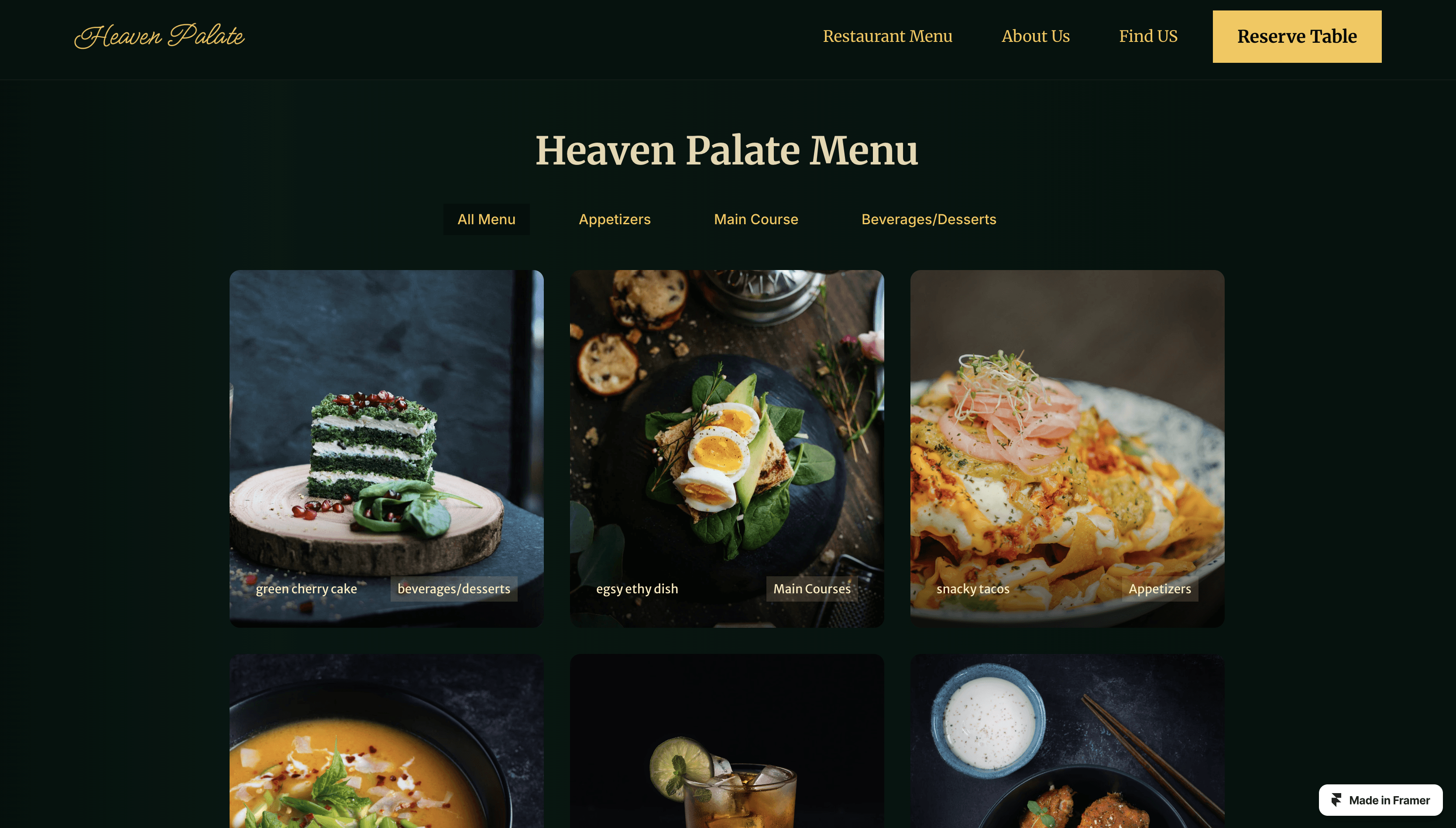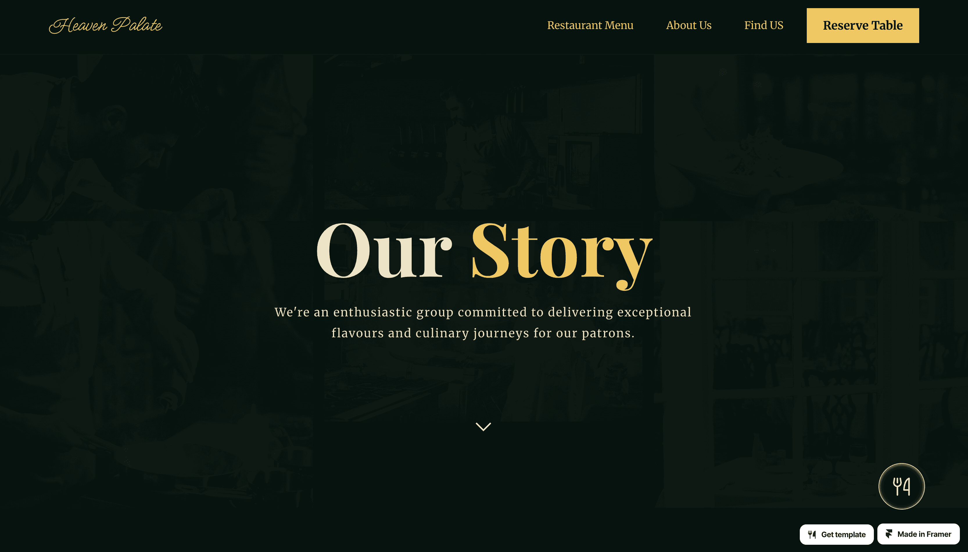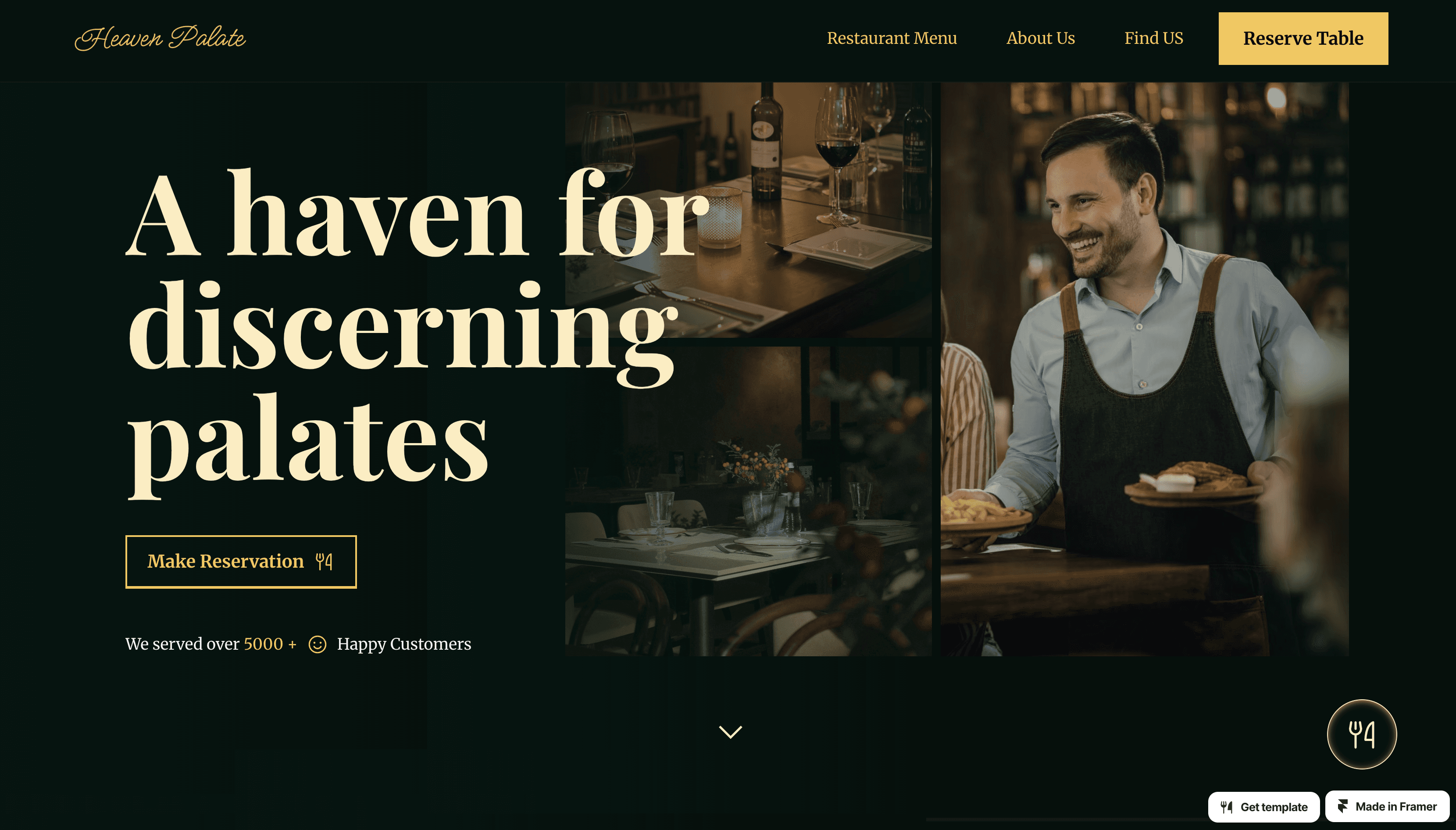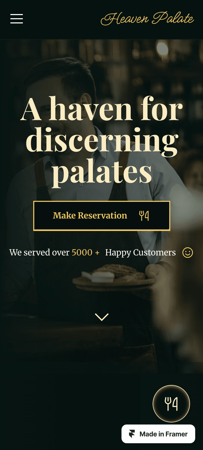 Heaven Palate is a premium restaurant Framer template designed with rich colors specifically for restaurants, dining establishments, bars, cafes, and food or beverage businesses.