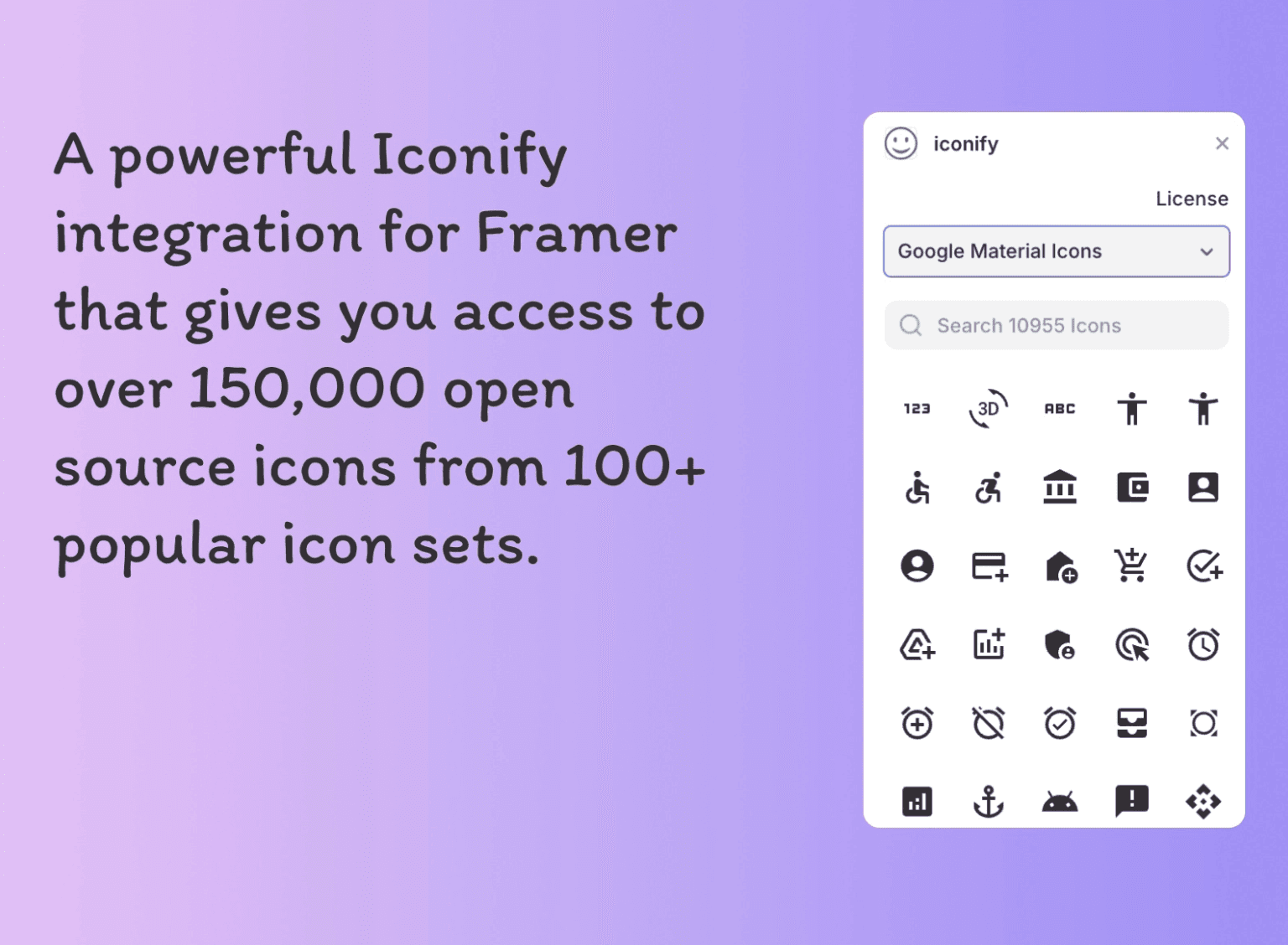 A powerful Iconify integration for Framer that gives you access to over 150,000 open source icons from 100+ popular icon sets.