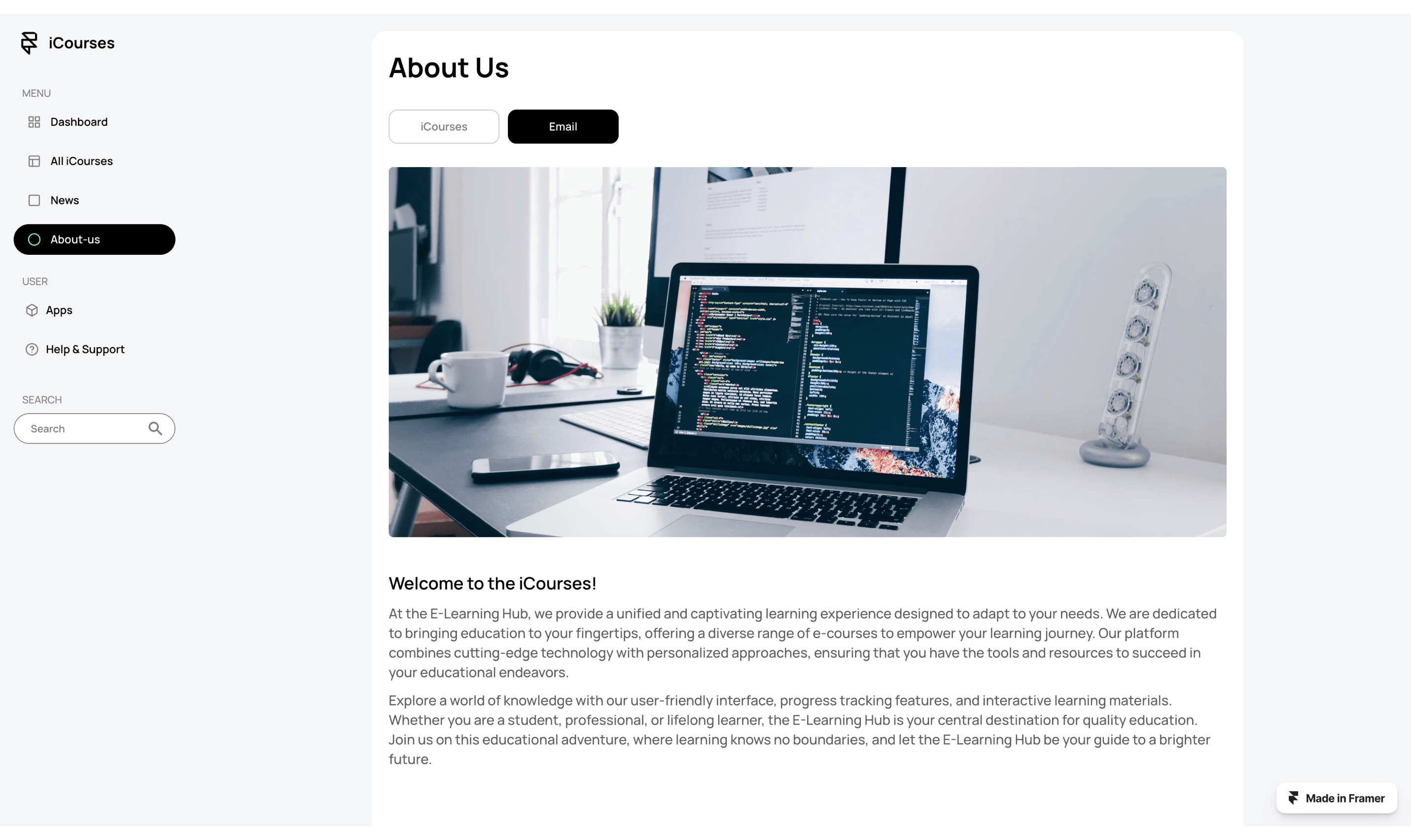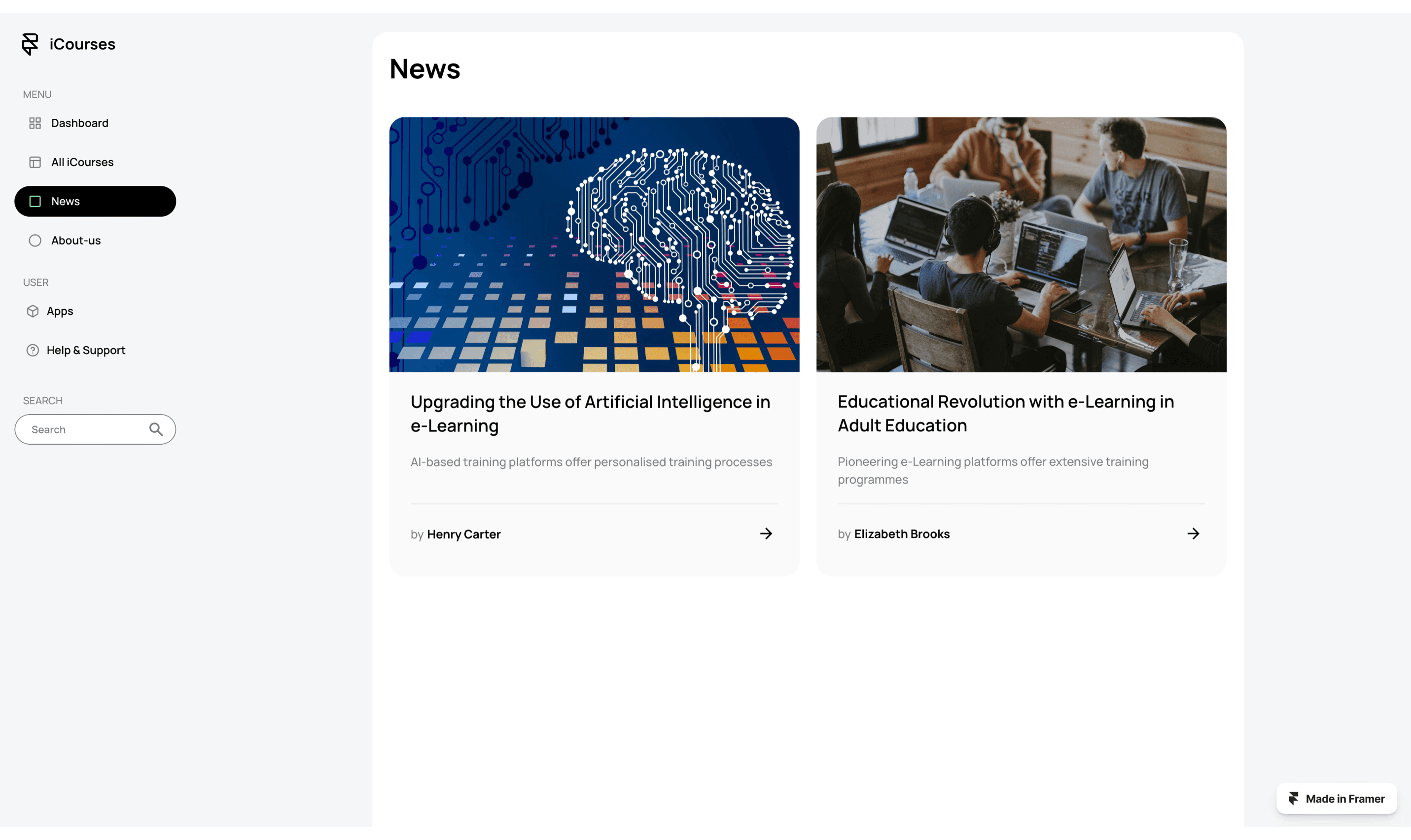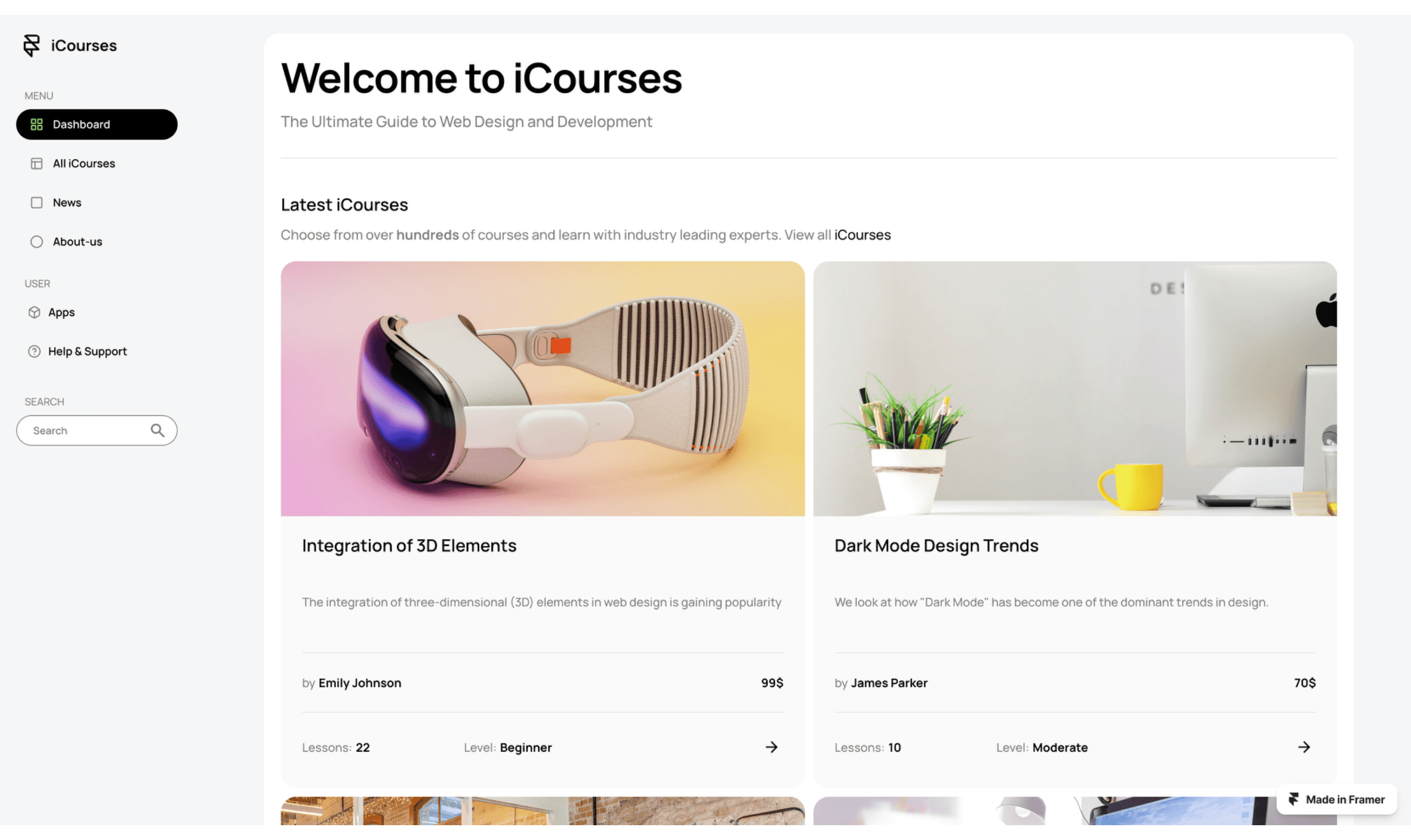 Experience the future of e-learning with iCourses Dashboard made in Framer! CMS Ready for iCourses and News