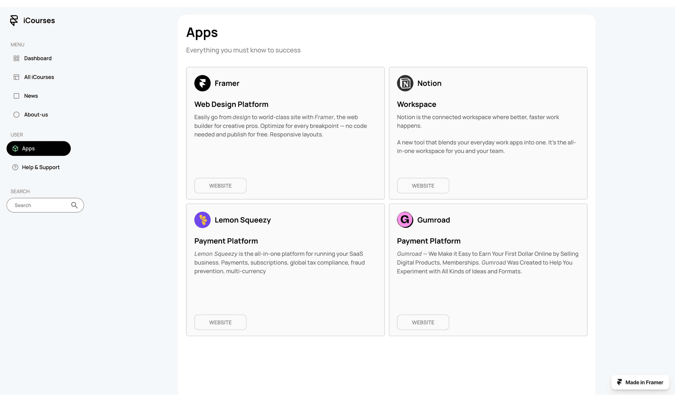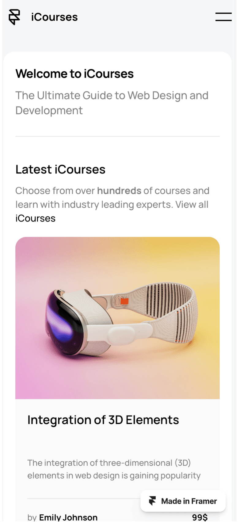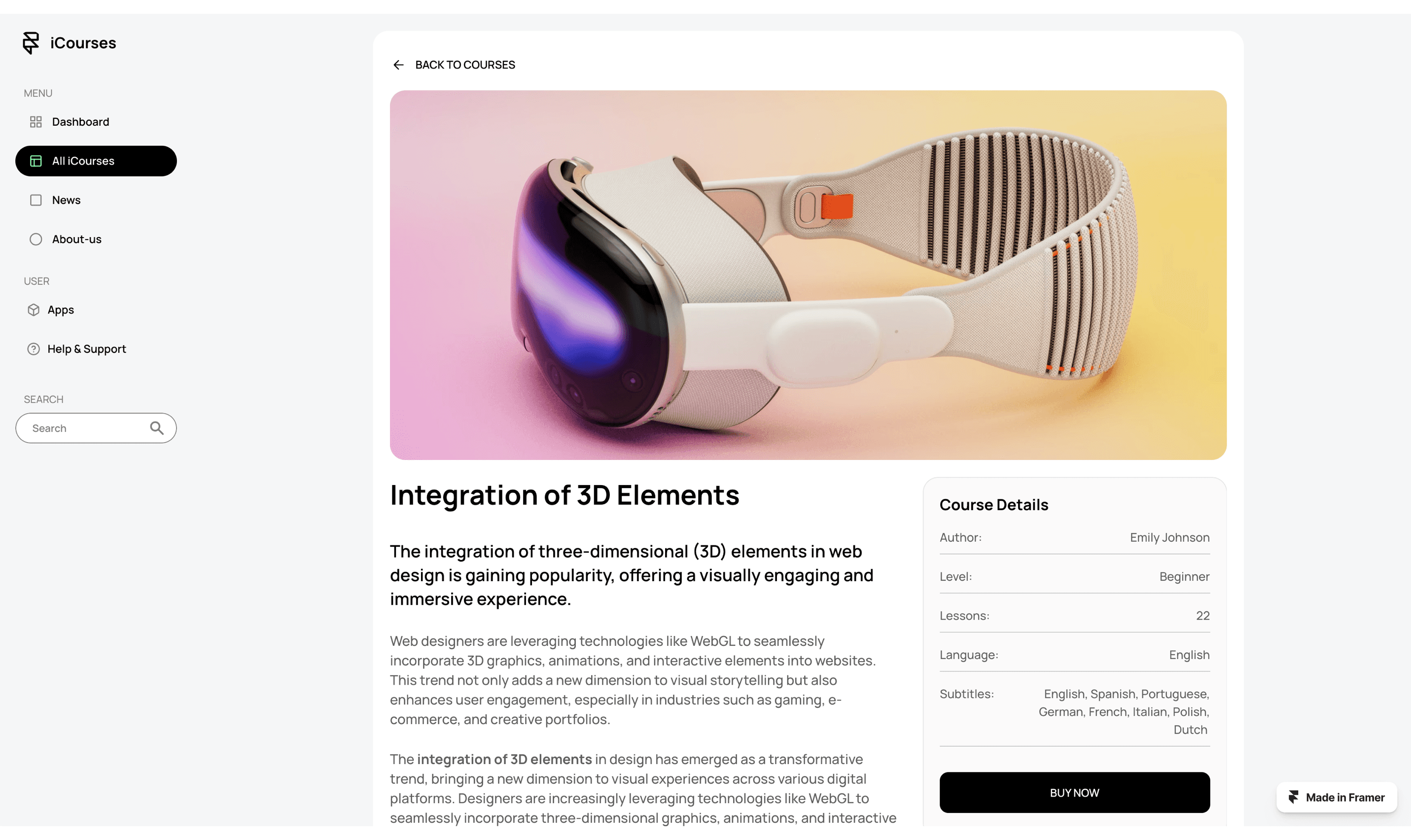 Experience the future of e-learning with iCourses Dashboard made in Framer! CMS Ready for iCourses and News