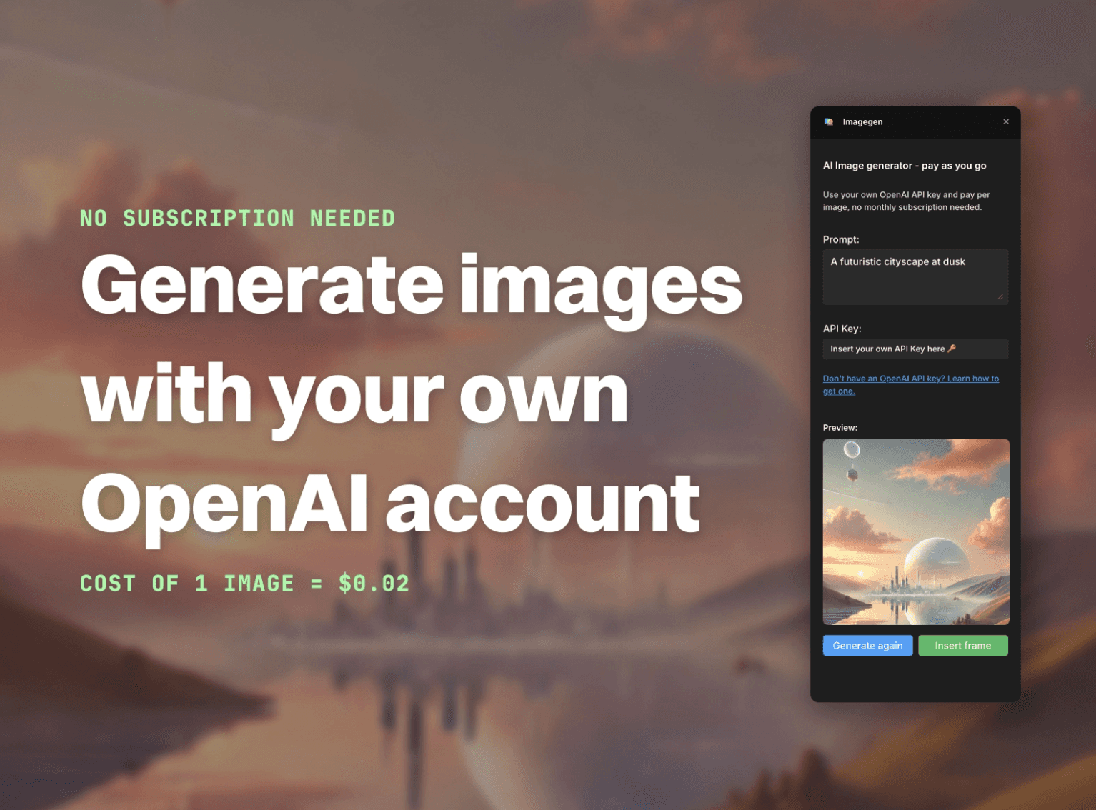 Generate images with your own OpenAI account for $0.02/image - no subscription needed!