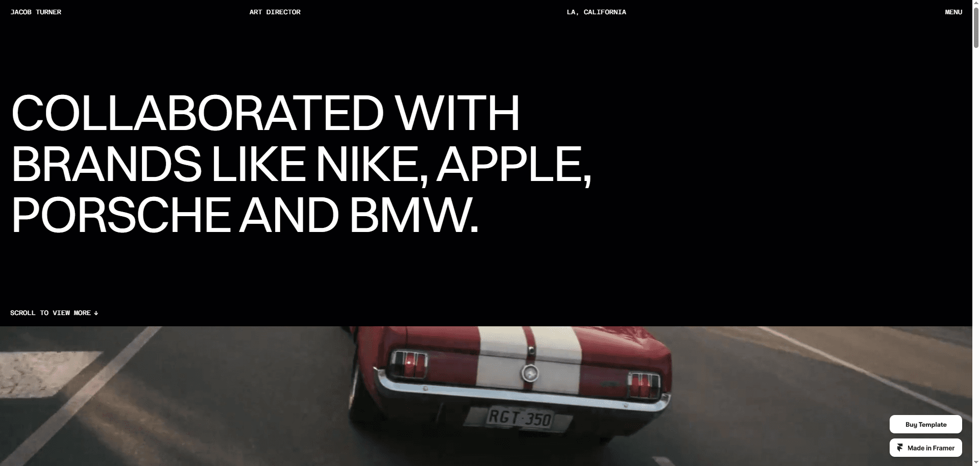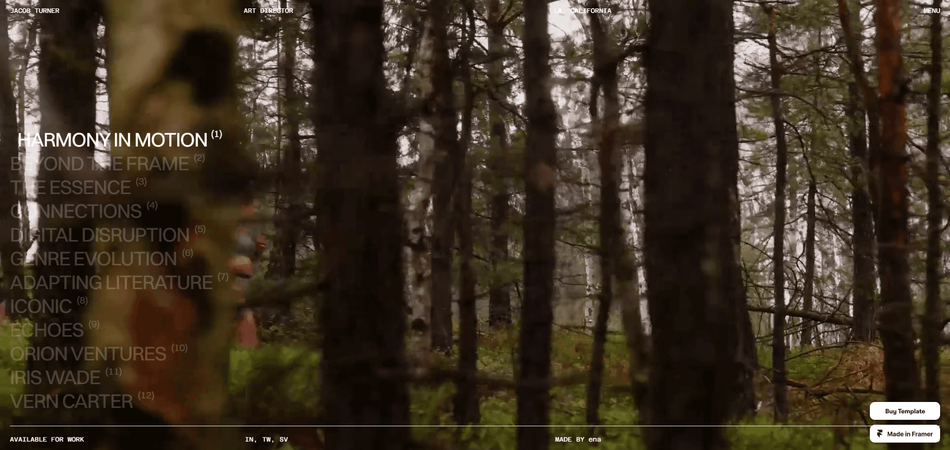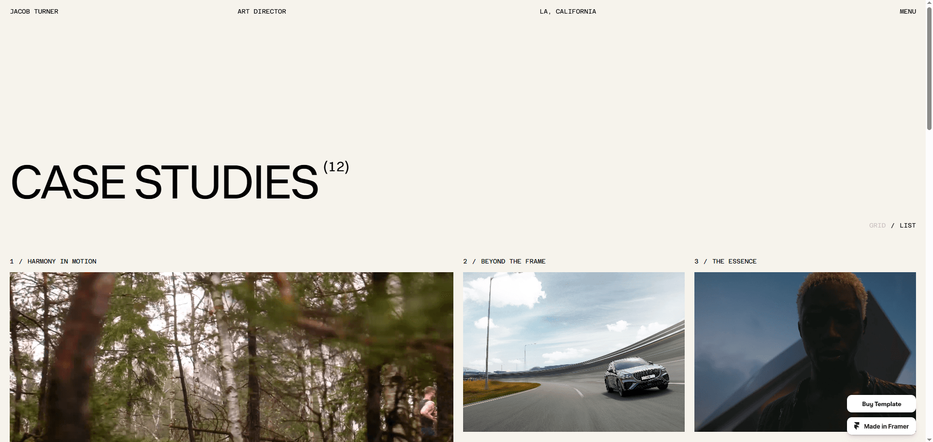 Explore Jacob Turner's Art Director Portfolio, a carefully designed Framer Website template ideal for presenting your creative projects with unique character and class.
