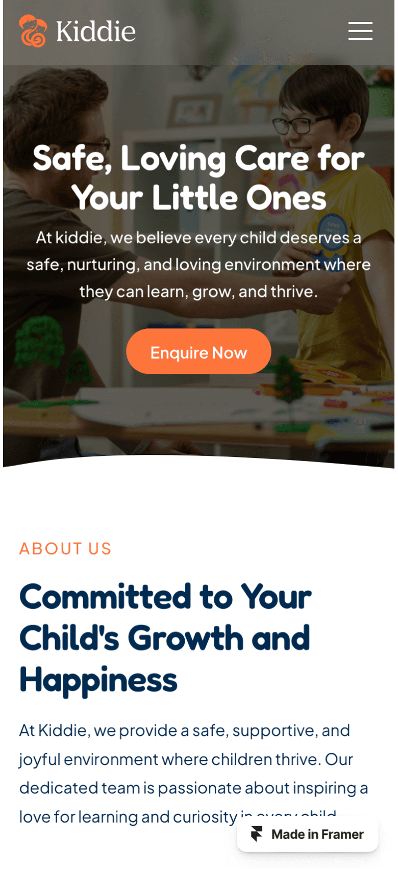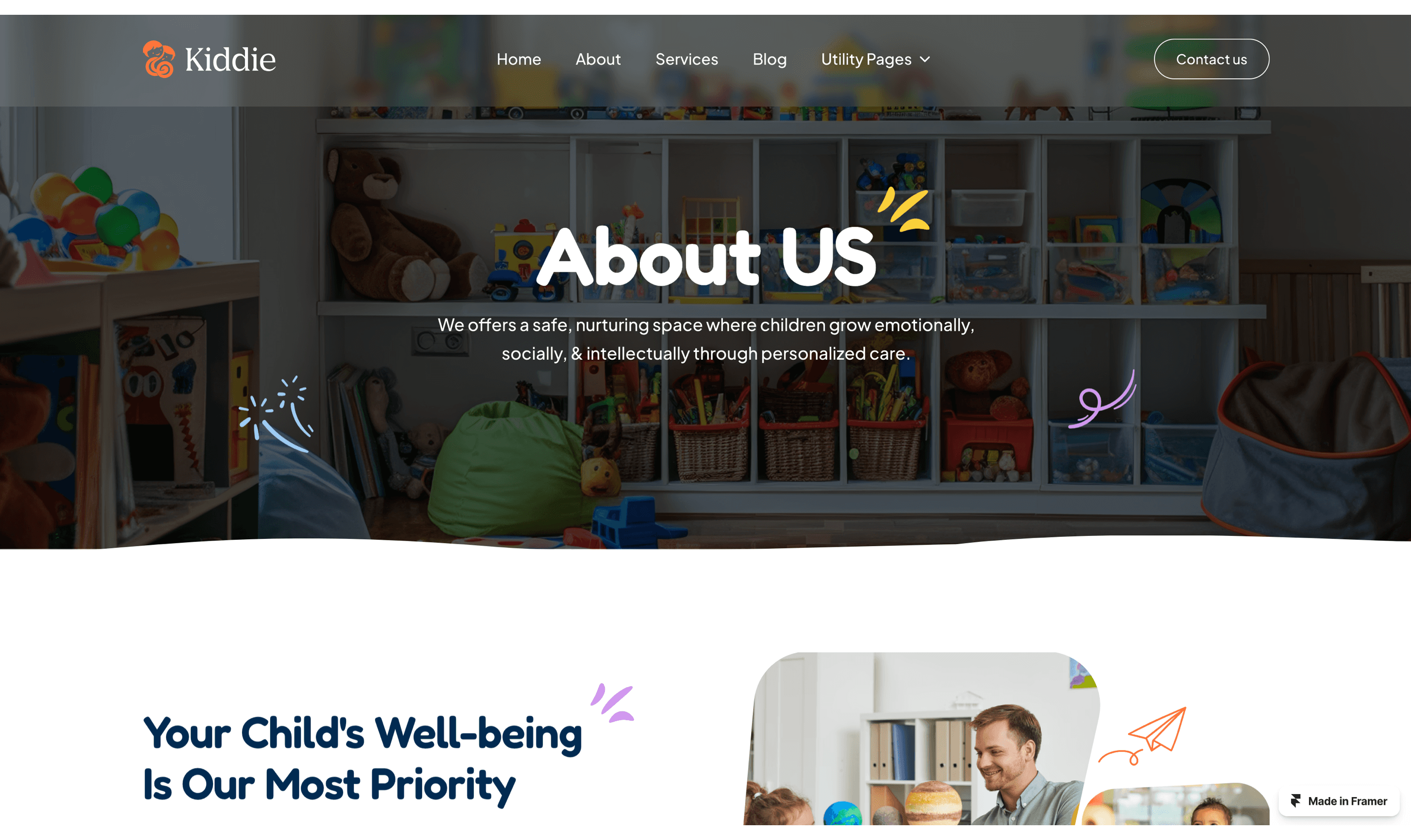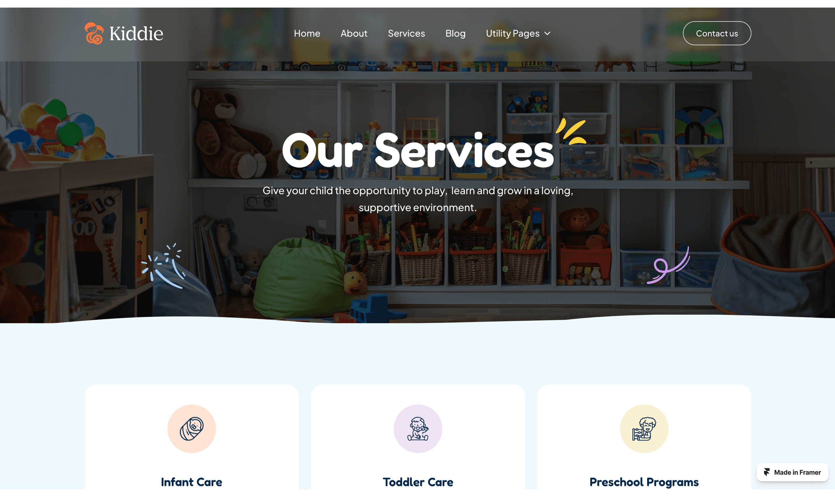 Kiddie is a lively and engaging Framer template designed for kindergartens, preschools, and child-focused organizations.