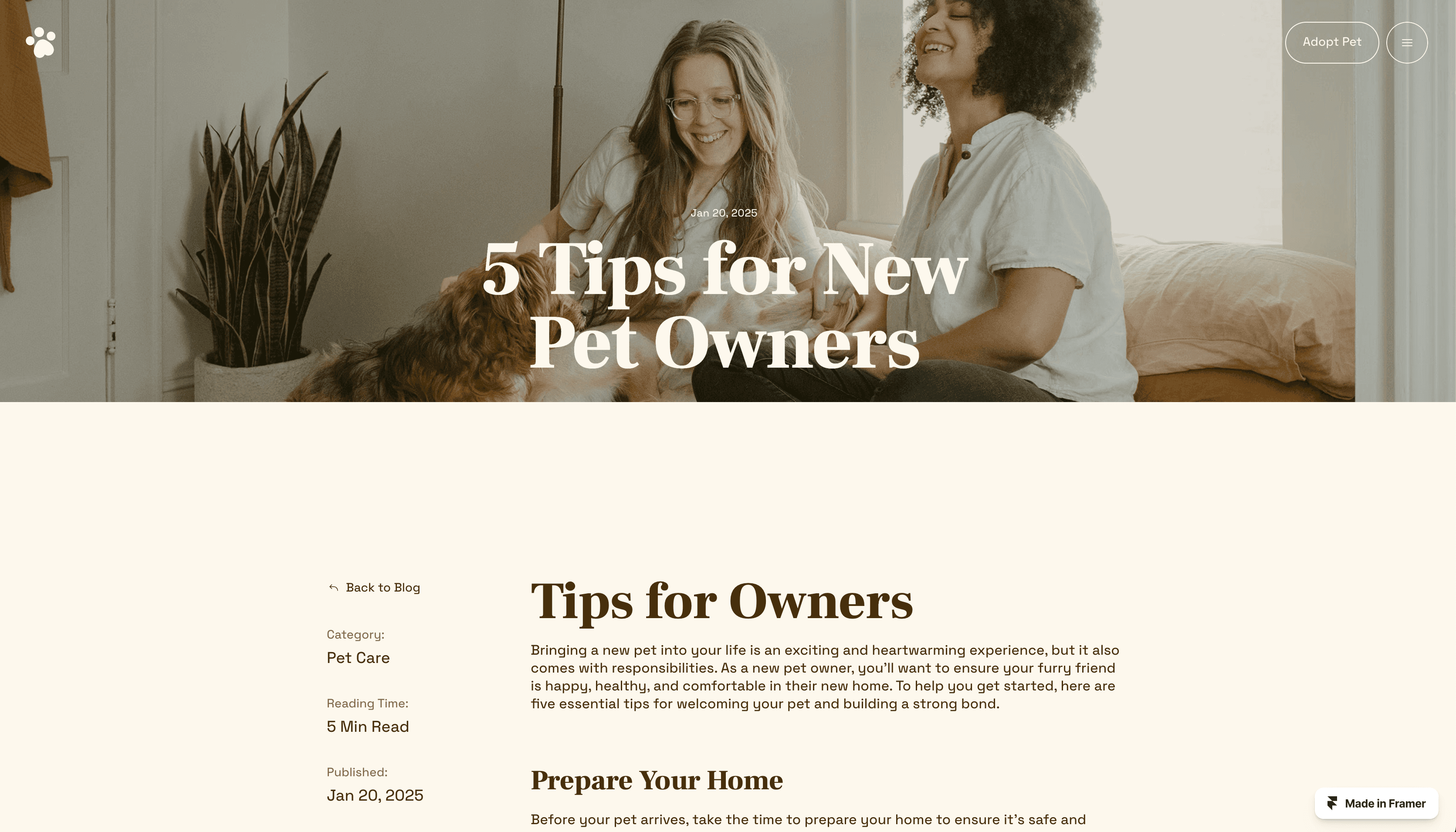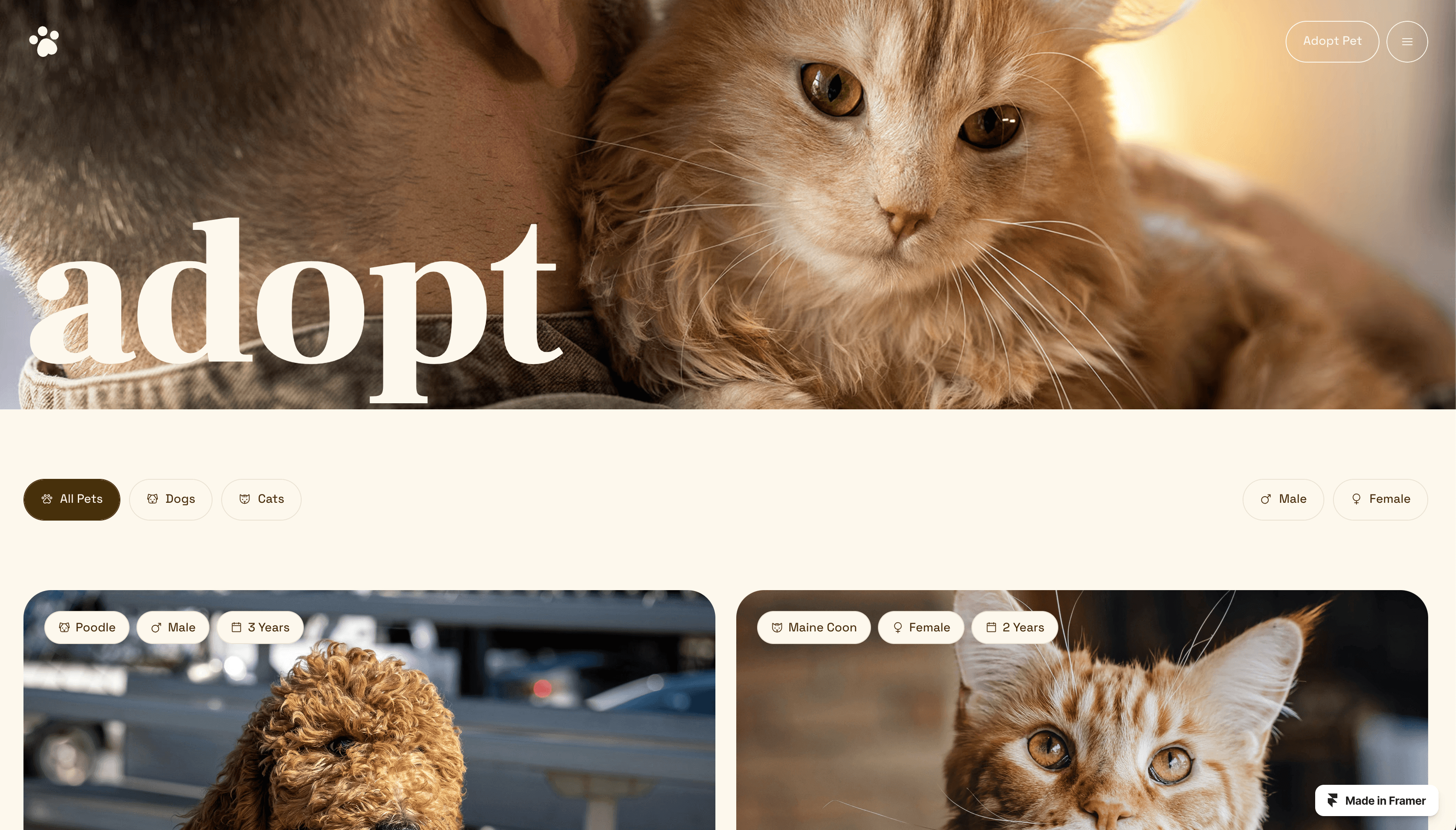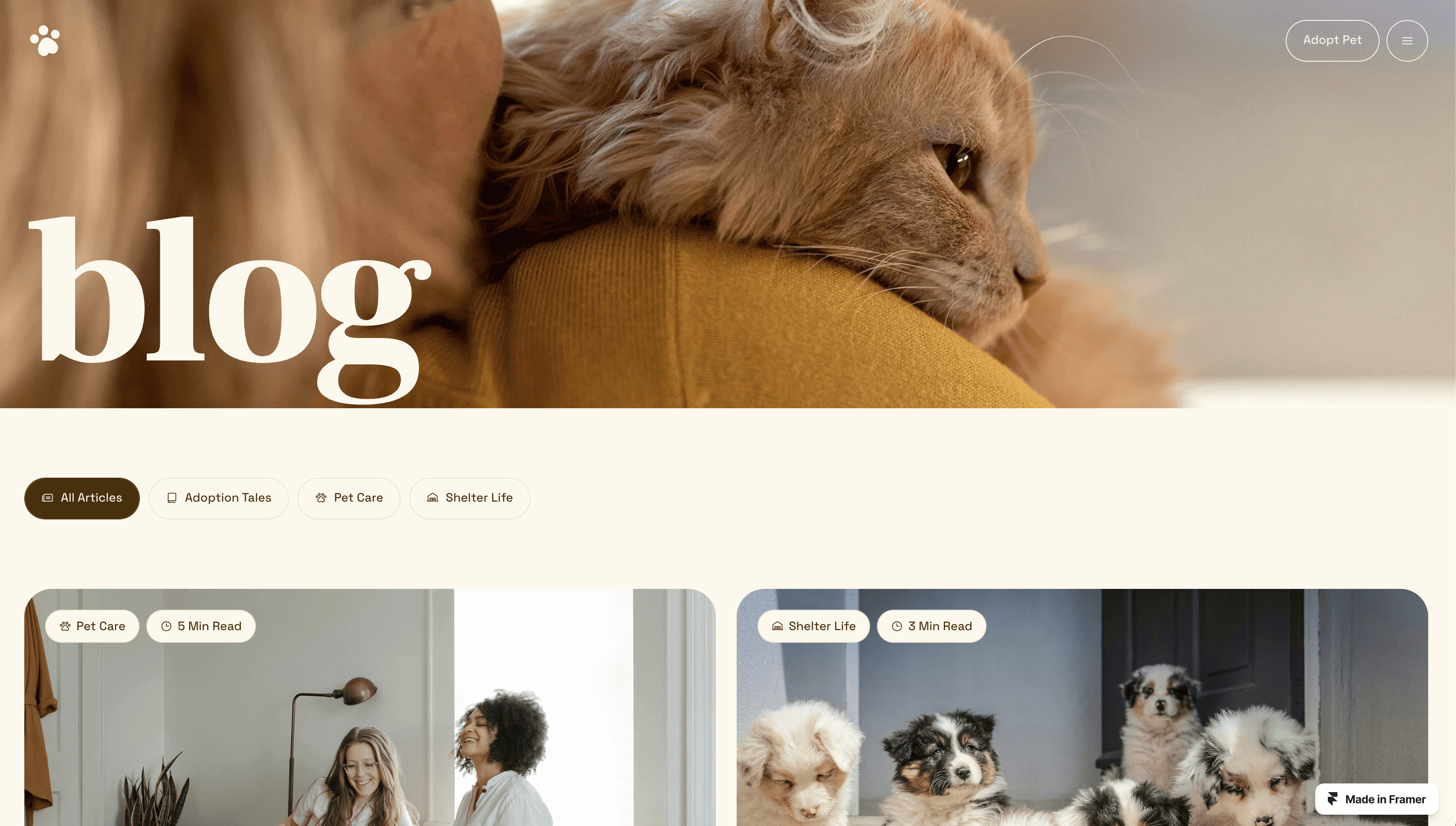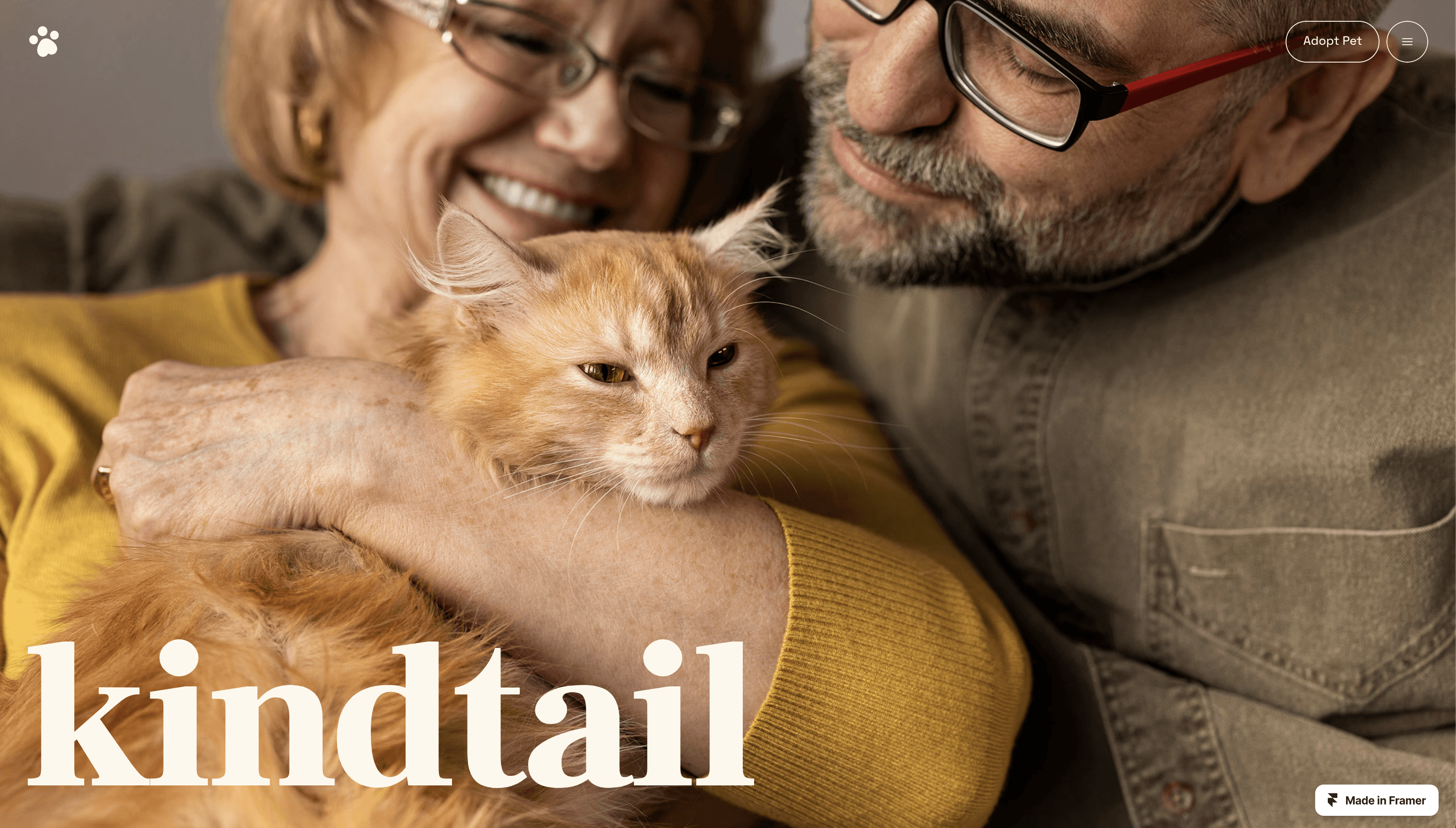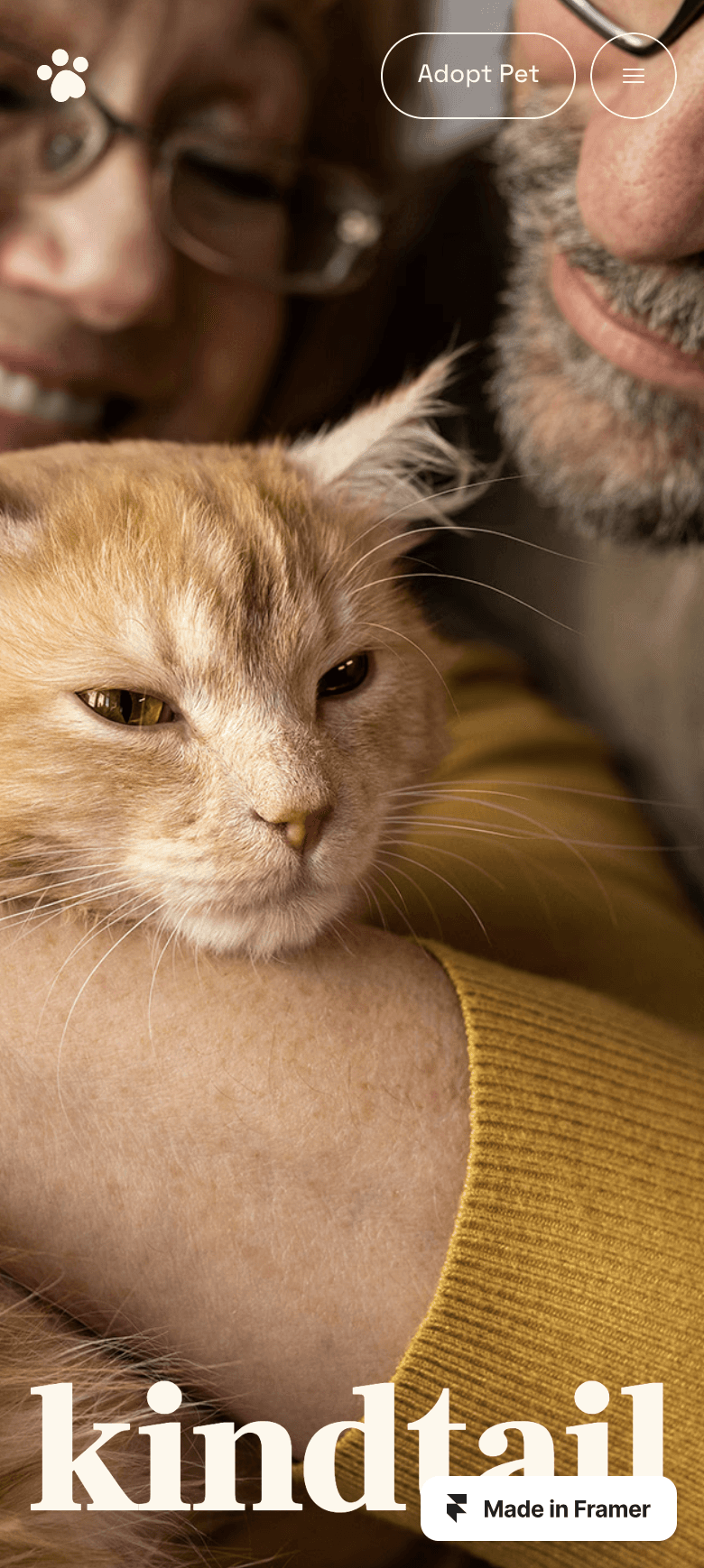 Kindtail is a beautifully designed website template for animal shelters, featuring customizable pages for pet profiles, adoption details, and showcasing your mission to connect pets with loving homes.