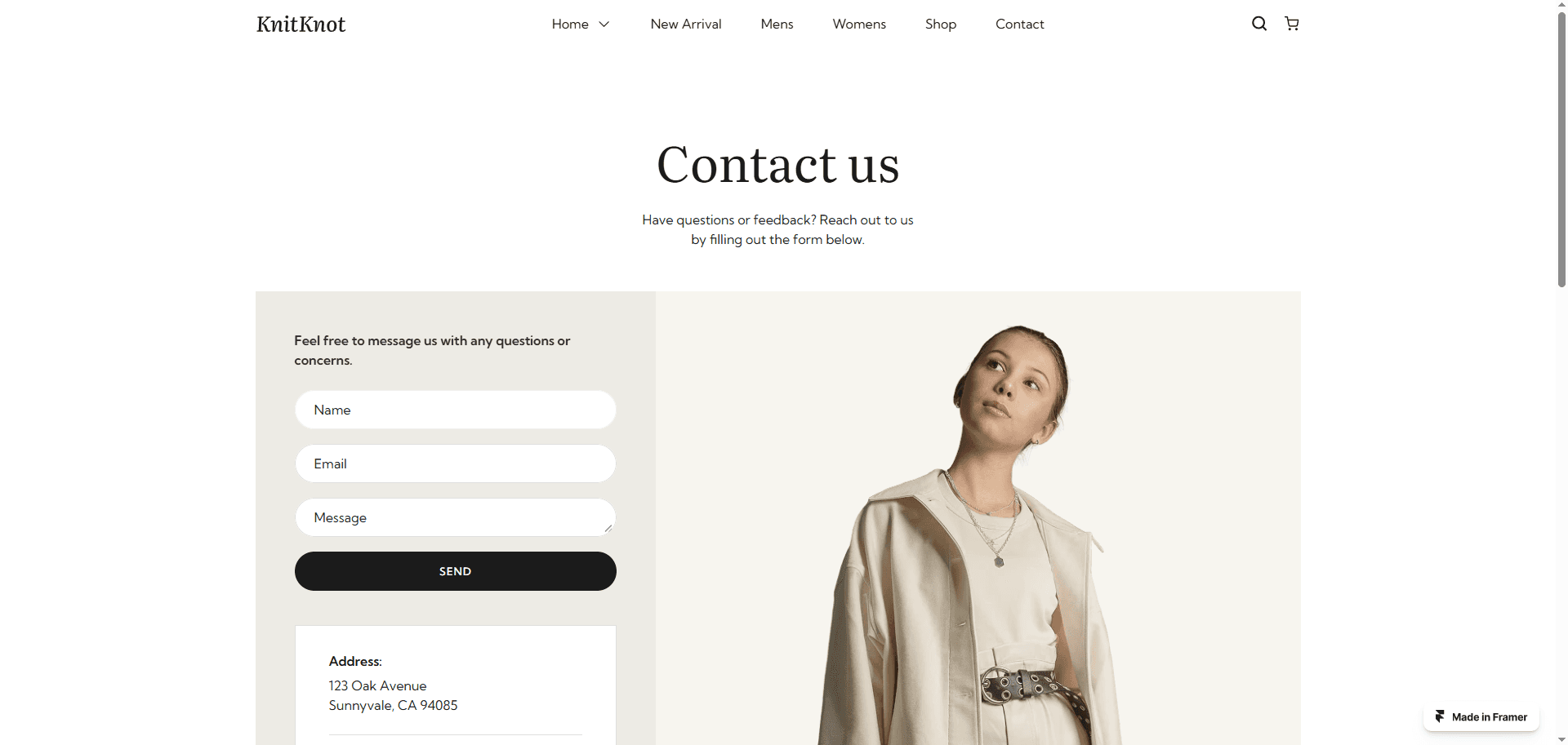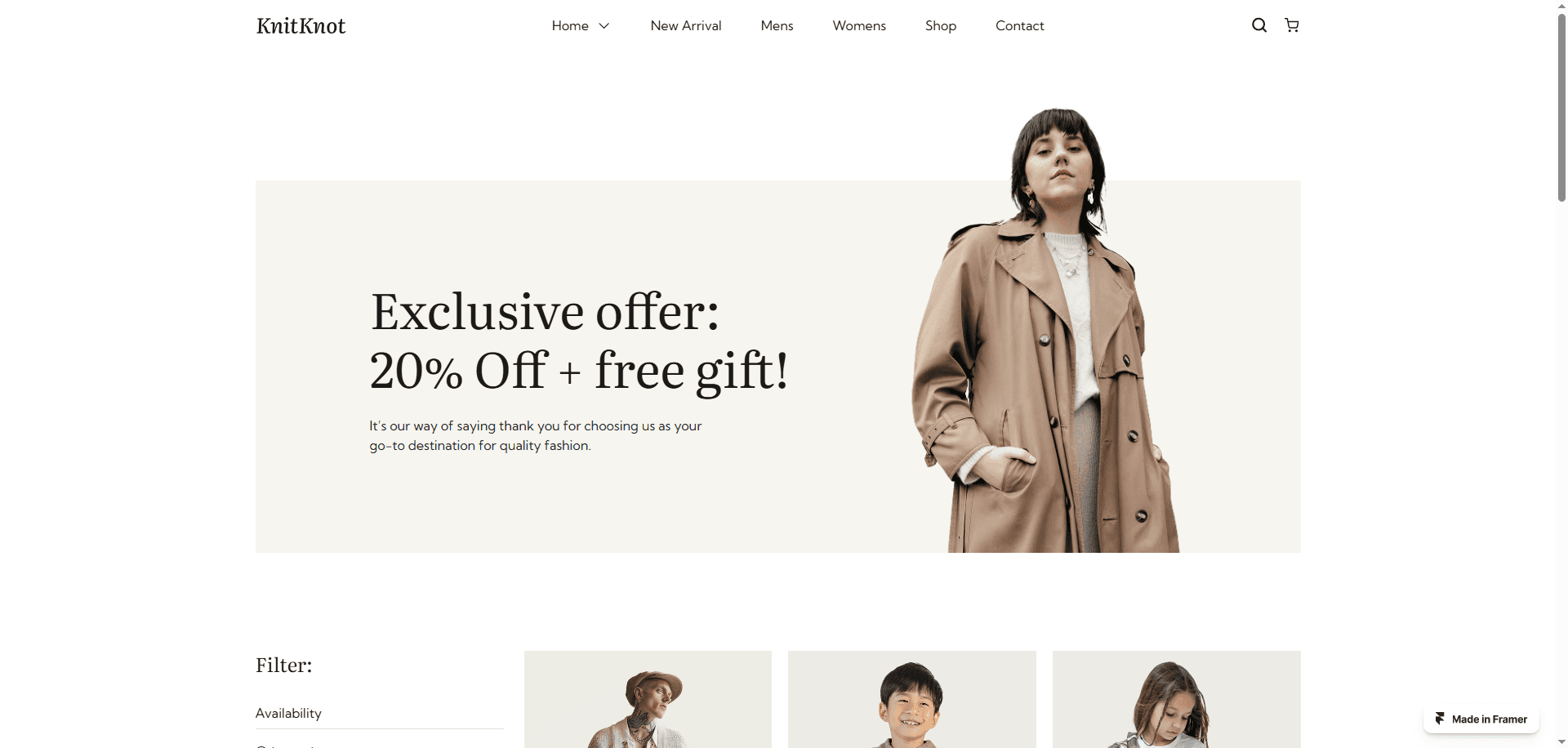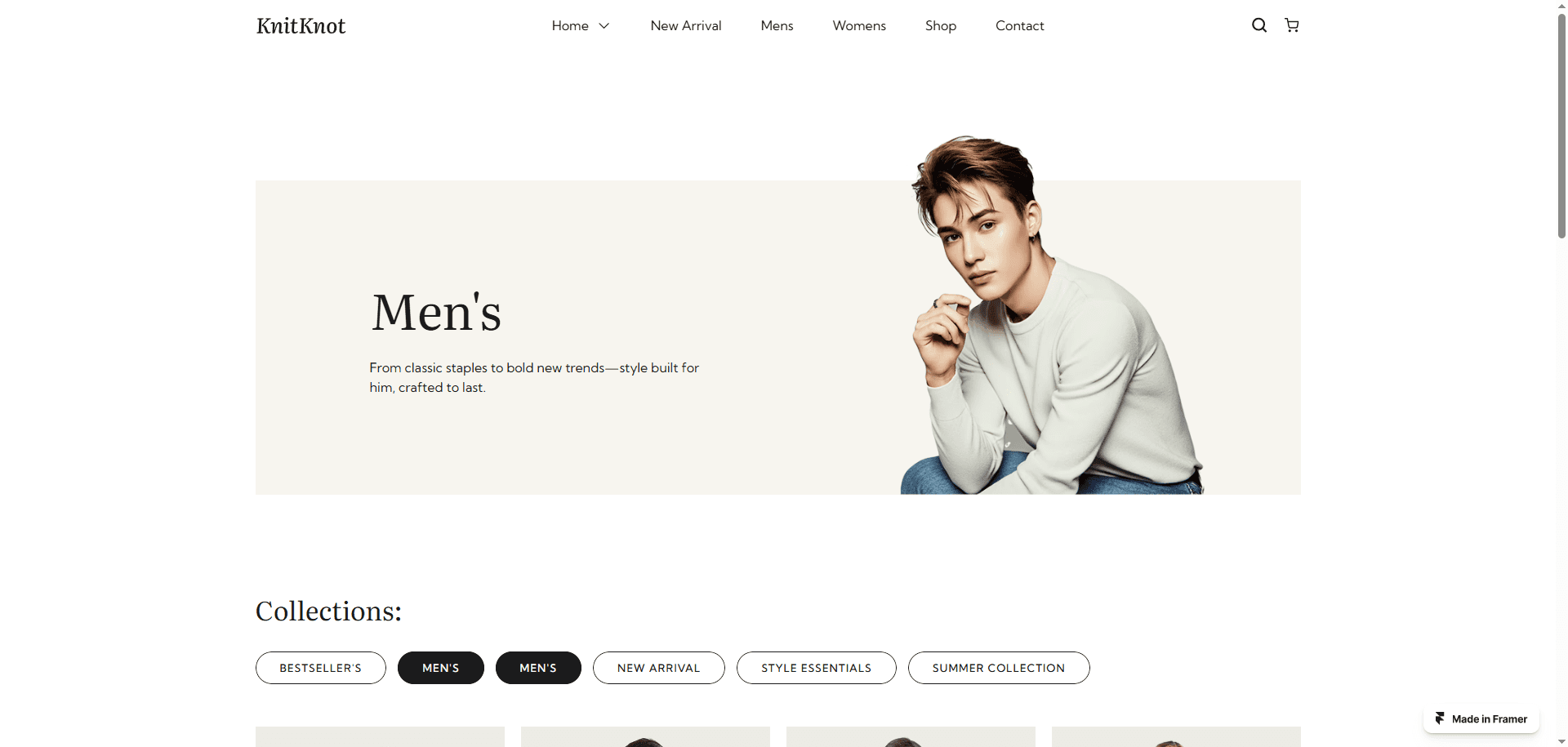 KnitKnot is a sleek eCommerce template built on Framer and powered by Shopify.