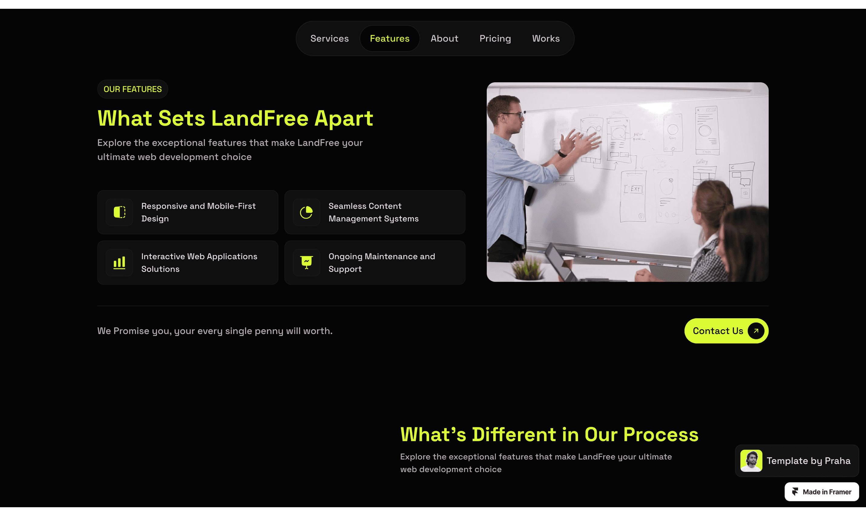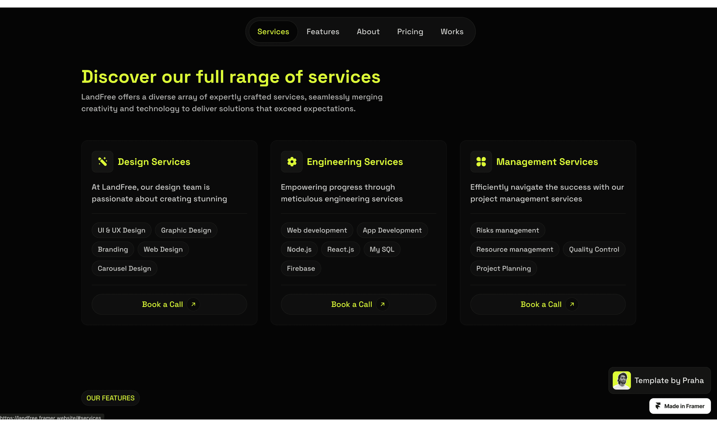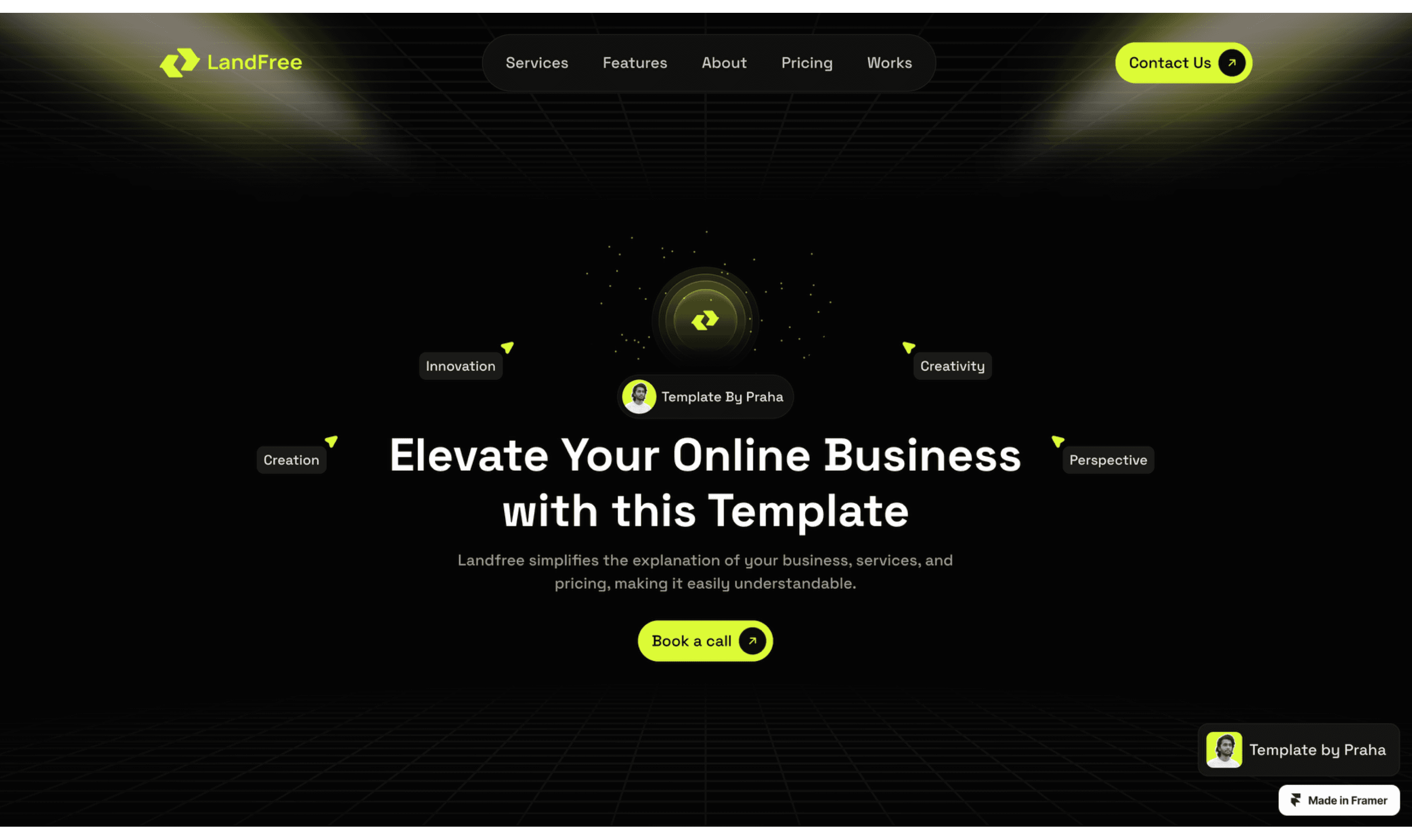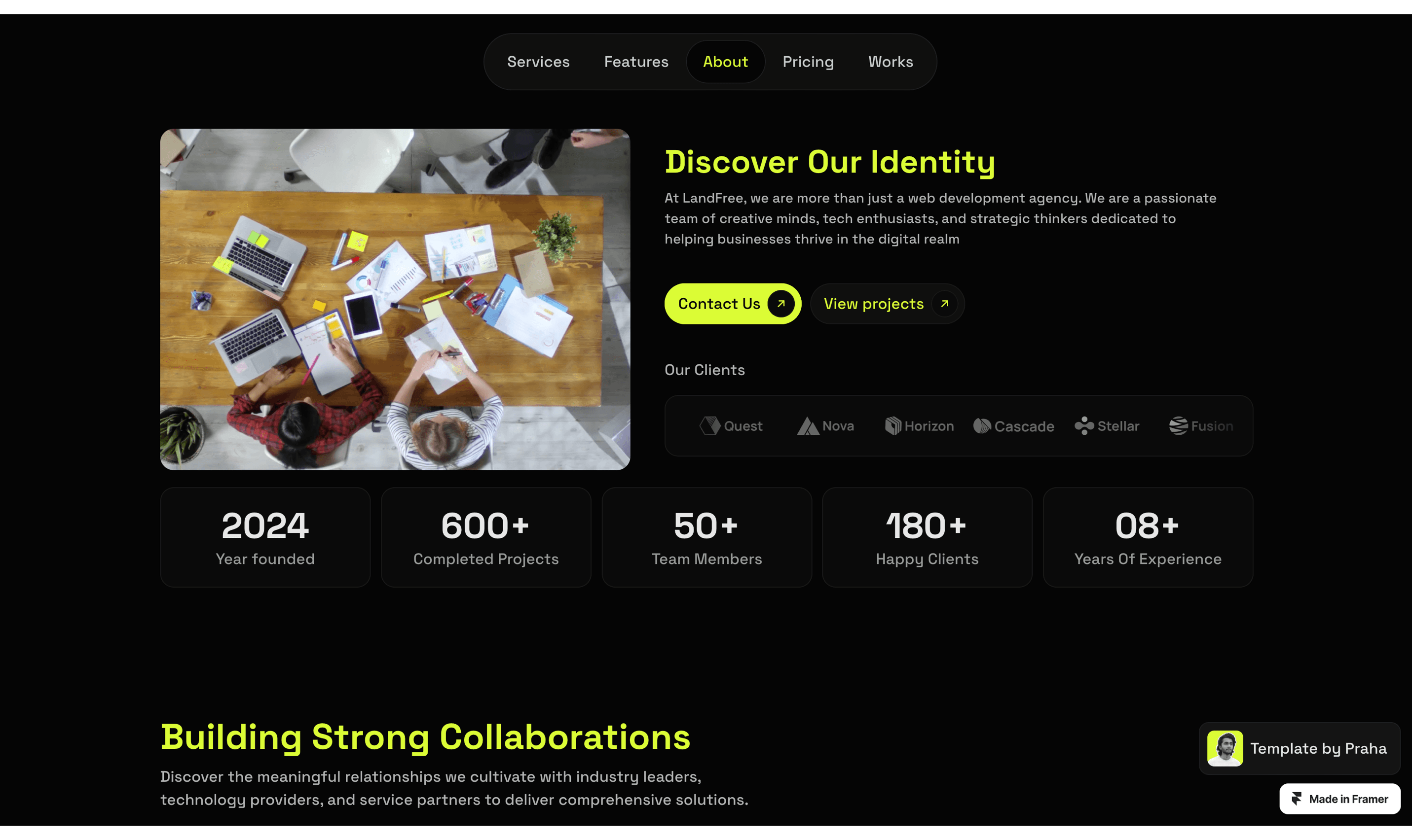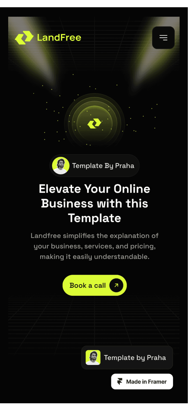 LandFree is a Dark Landing Page website template, tailor-made for presenting your company's vital information, projects, and more.