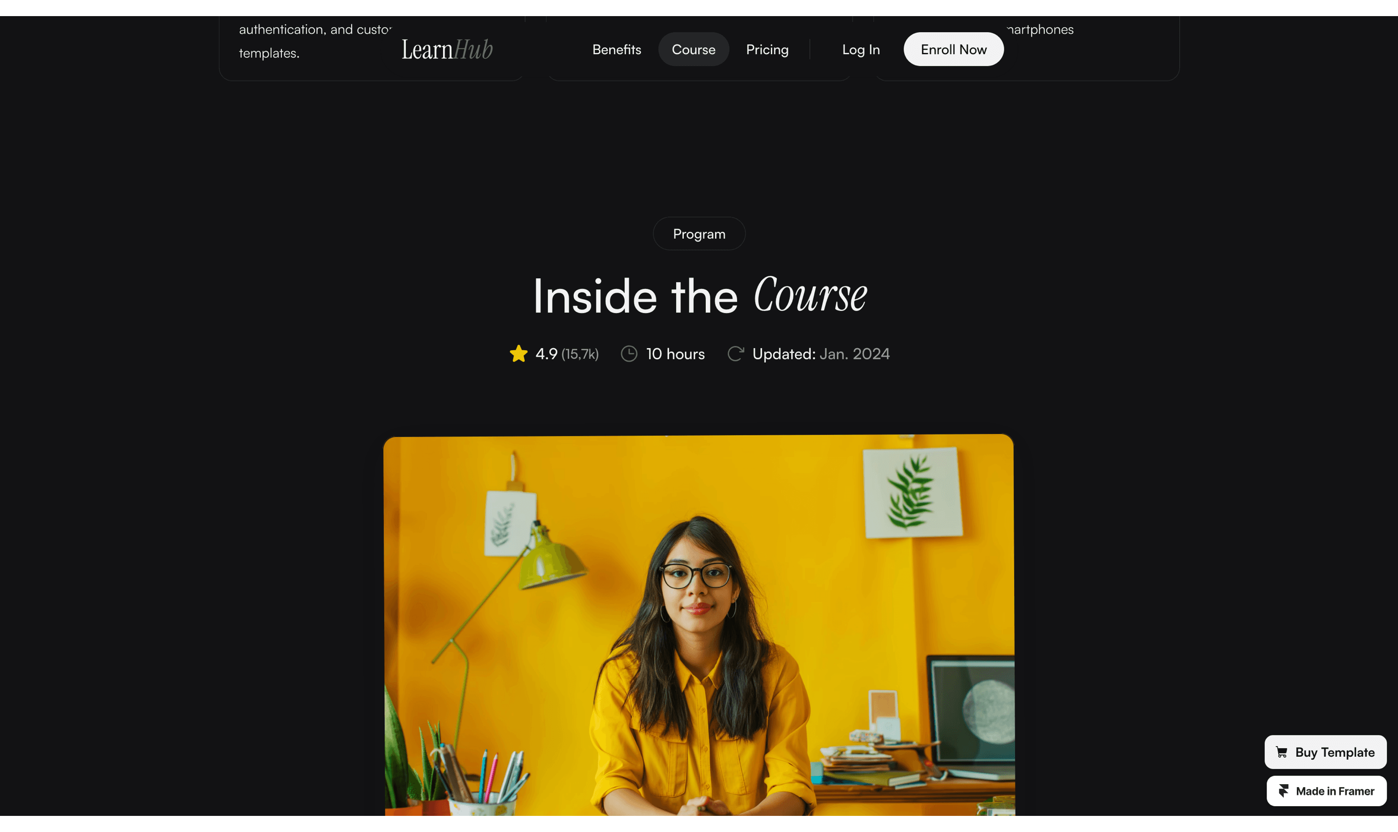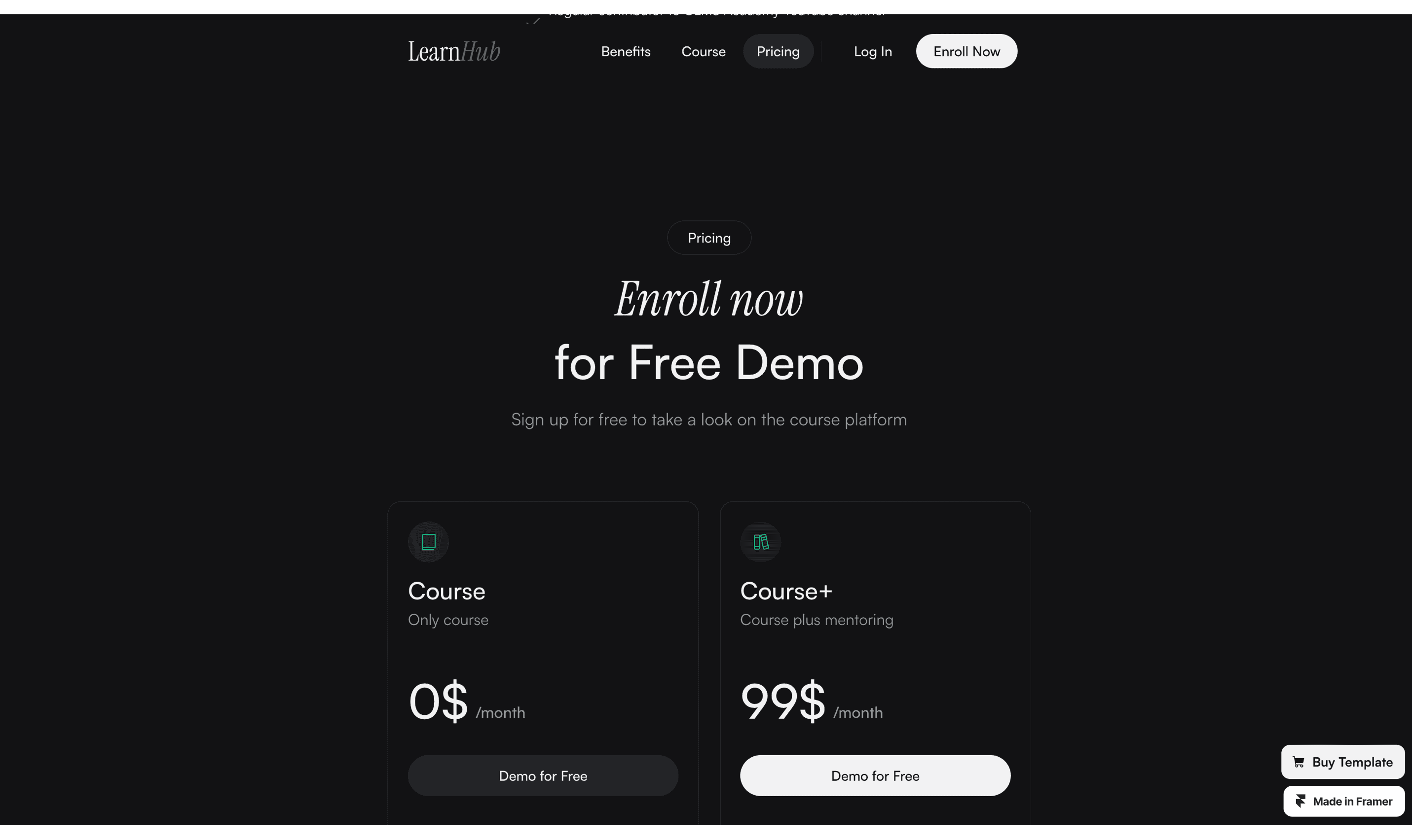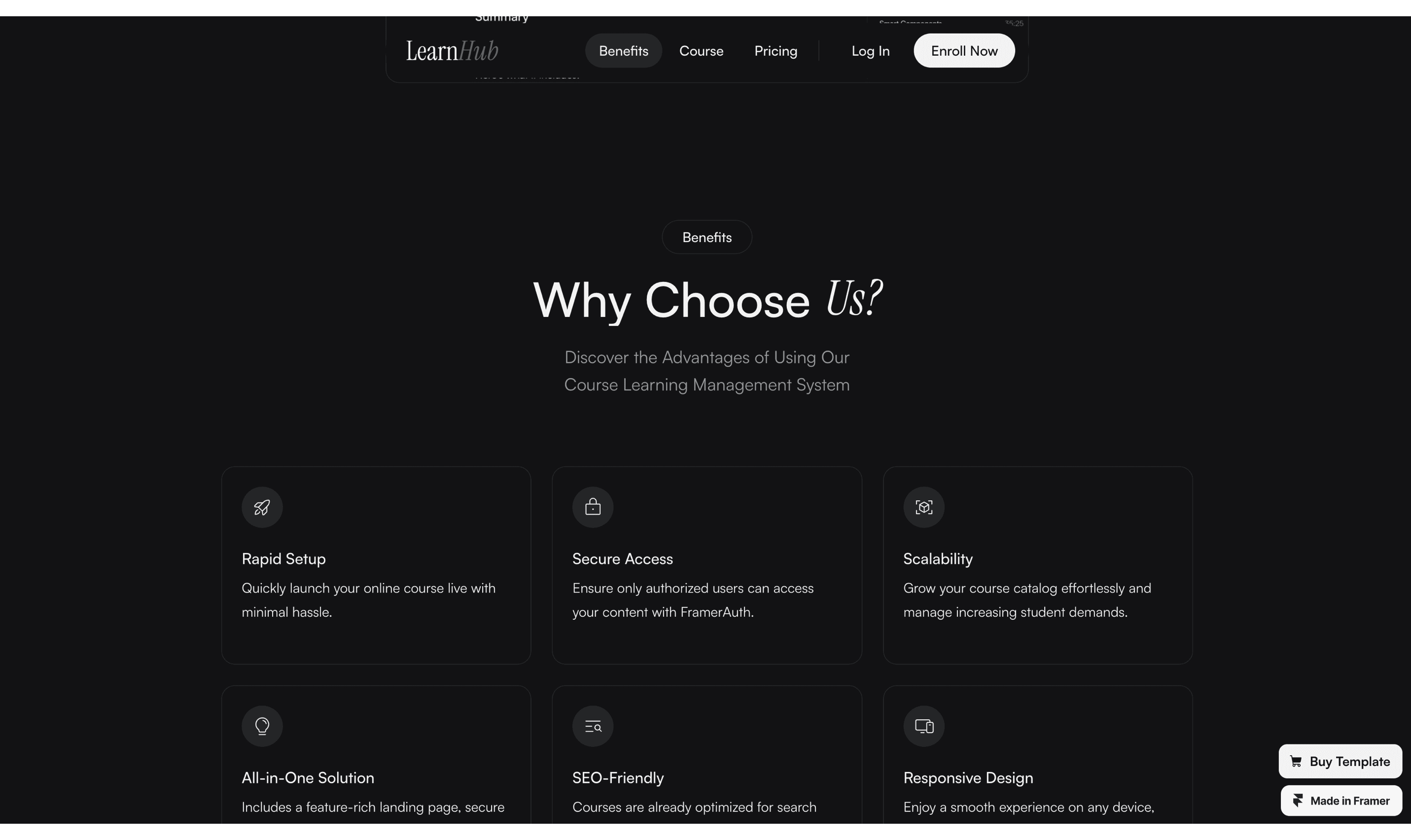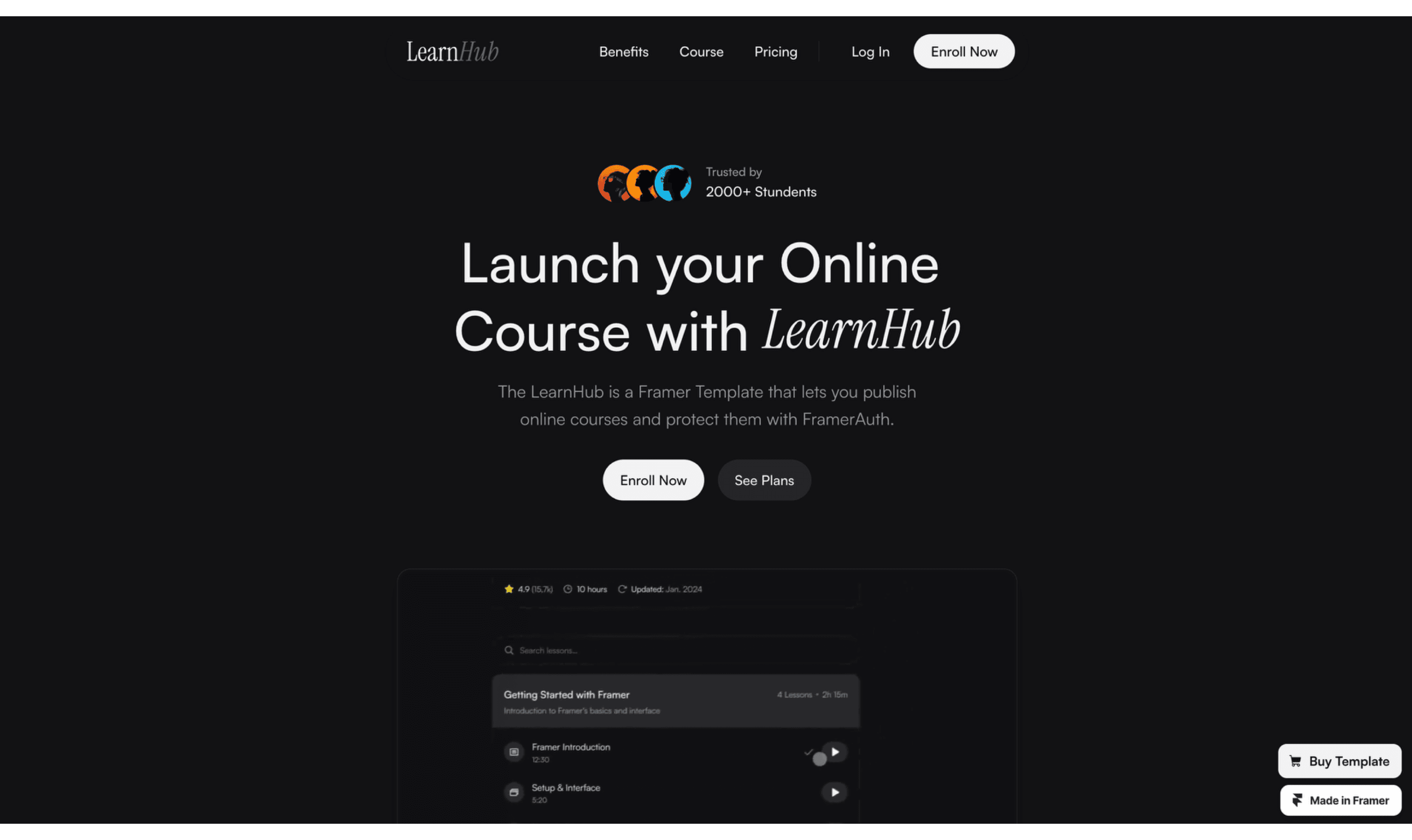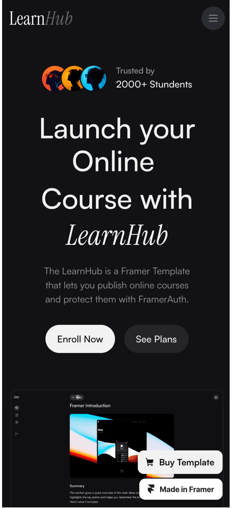 LearnHub is a versatile Learning Management System (LMS) Framer template designed for course creators. Featuring a multifunctional landing page, intuitive course management platform, and easily customizable,