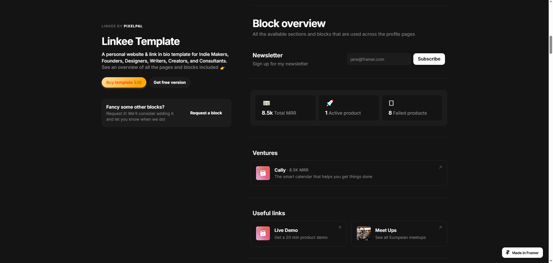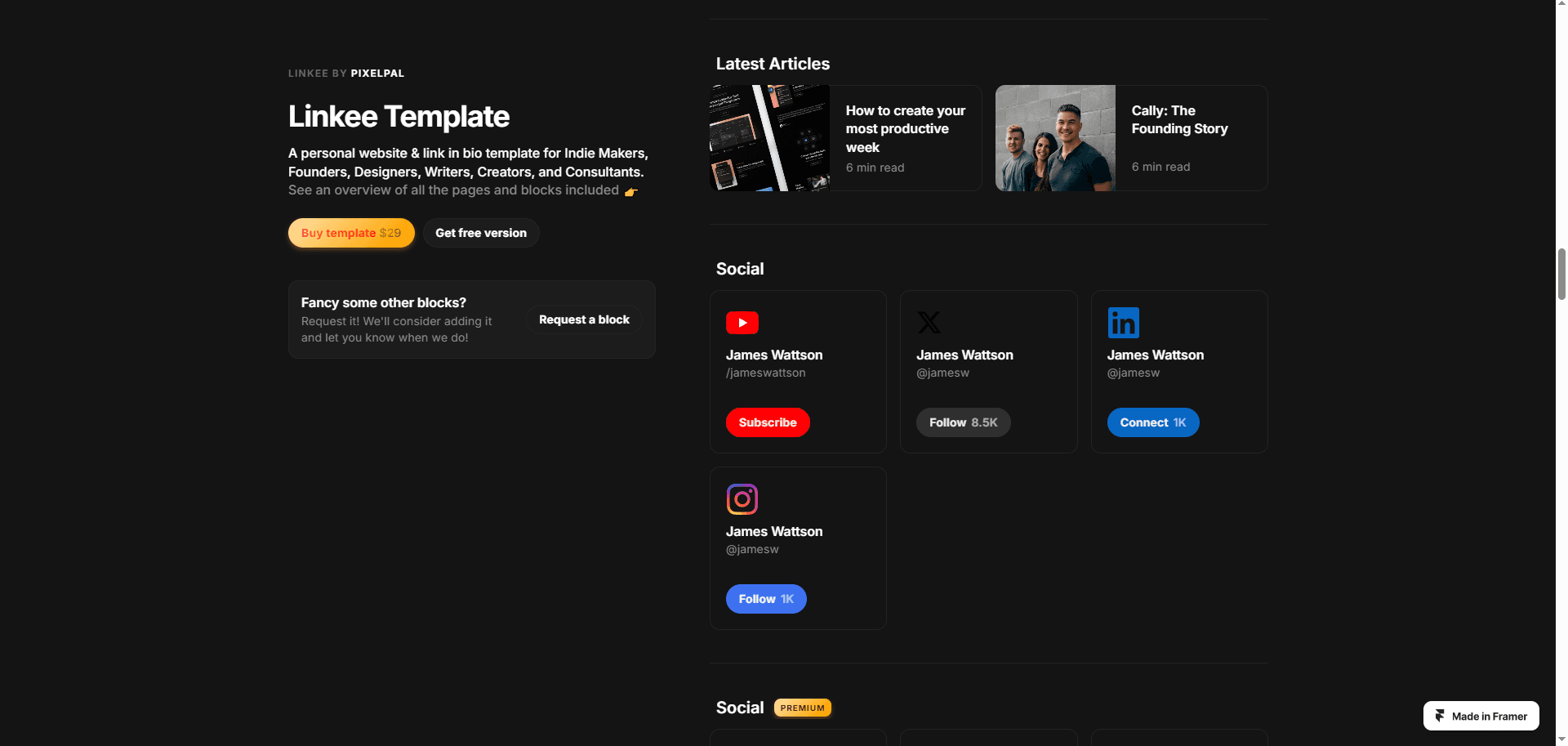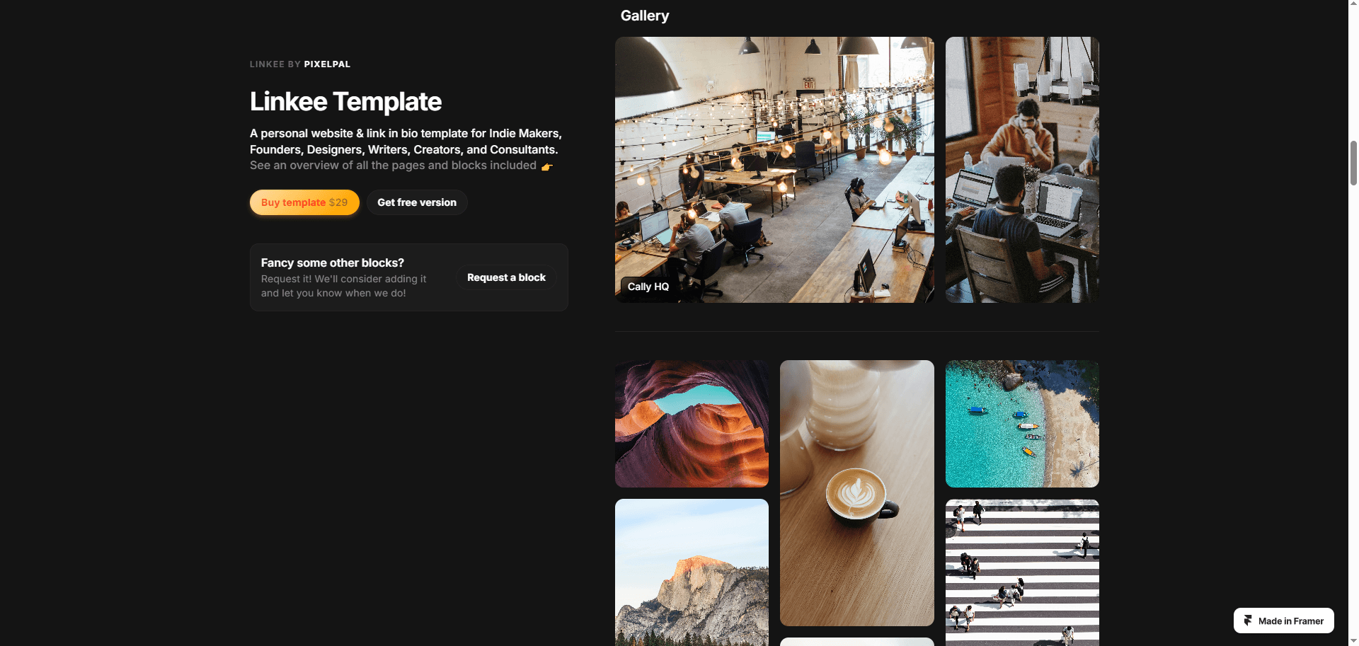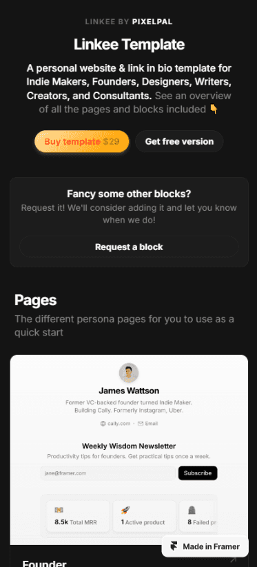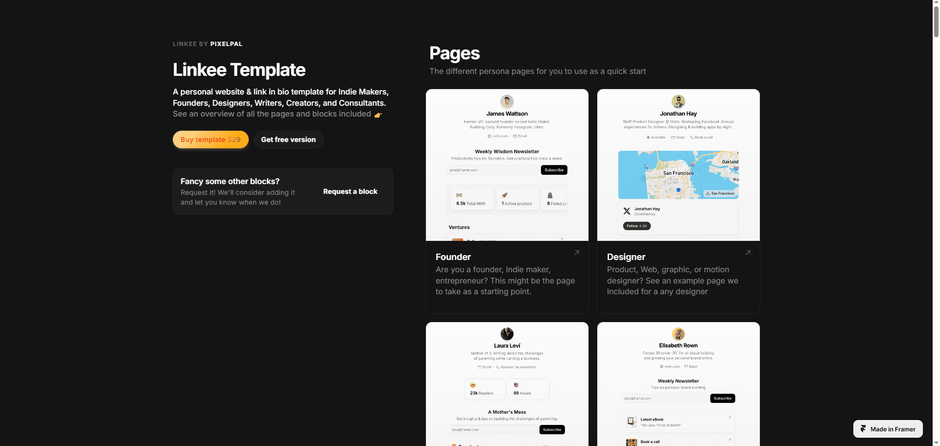 Linkee is a minimal but high quality personal website & link in bio Framer template.