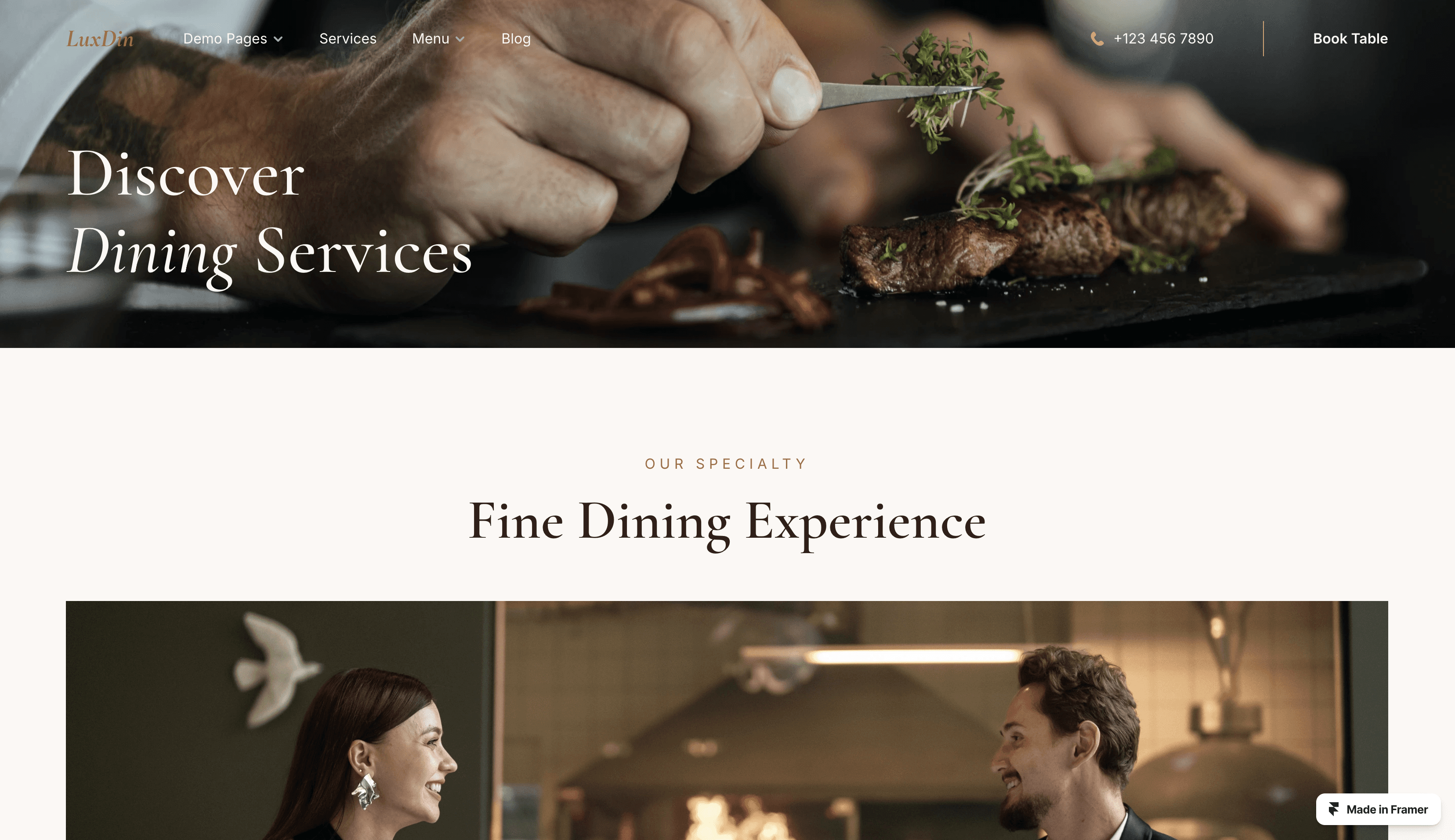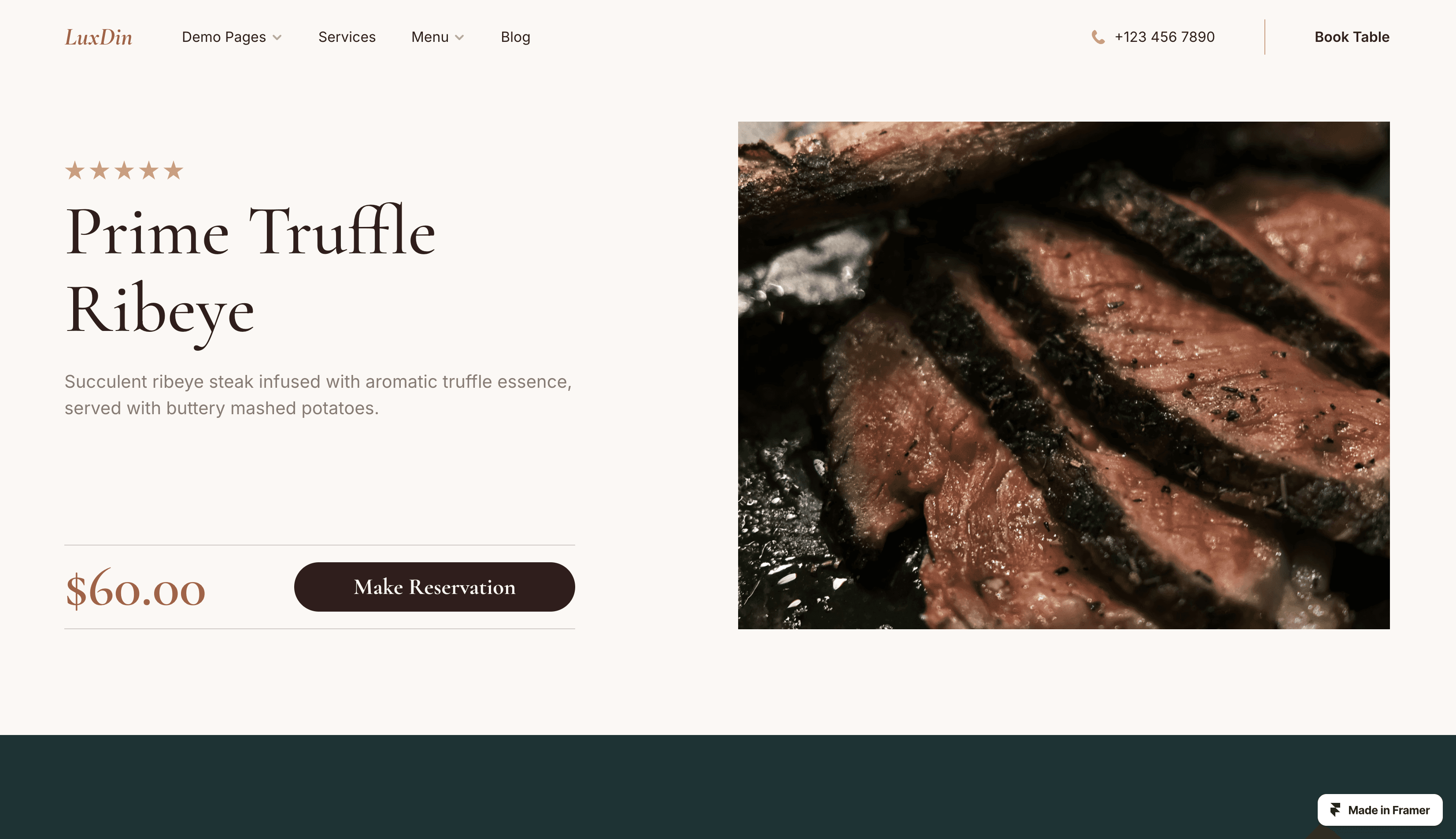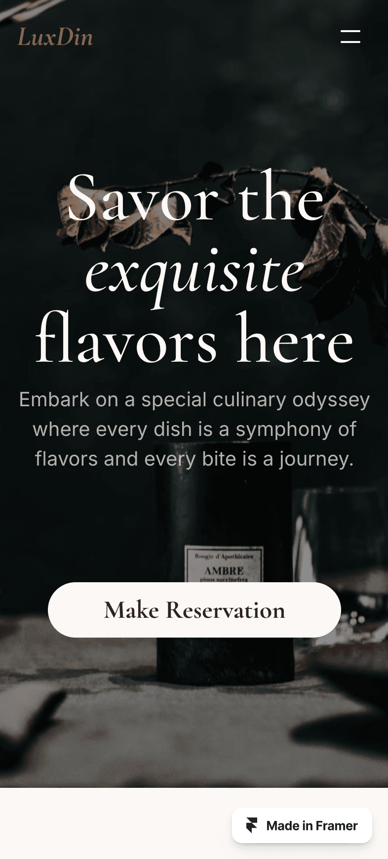 Indulge prospective customers with a delightful view of your services and offers using LuxDin, a minimalist and elegant restaurant website with a framer template