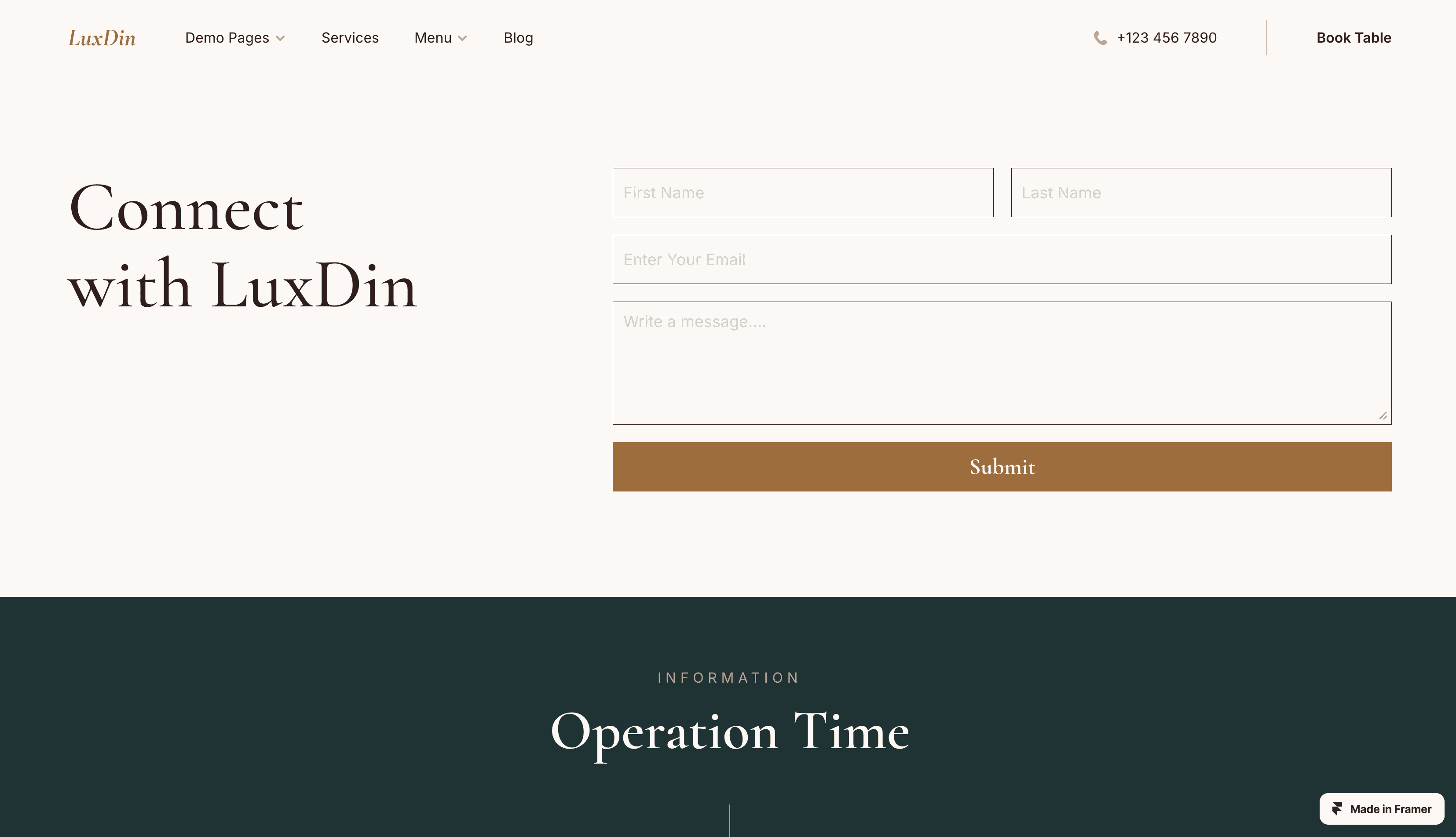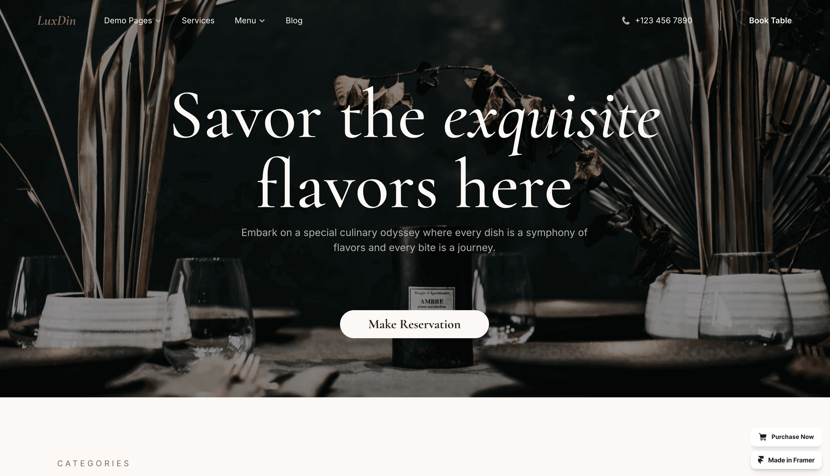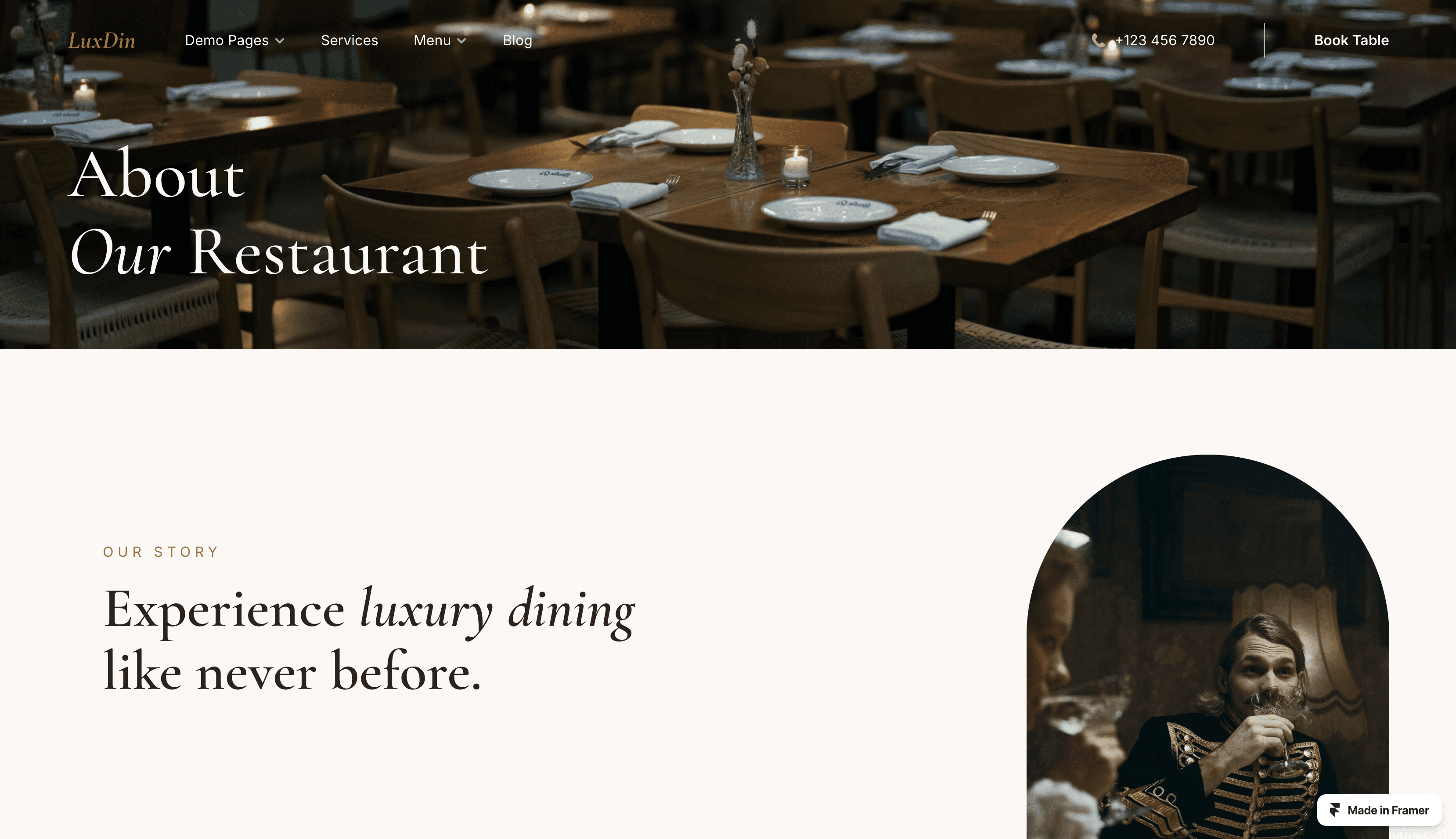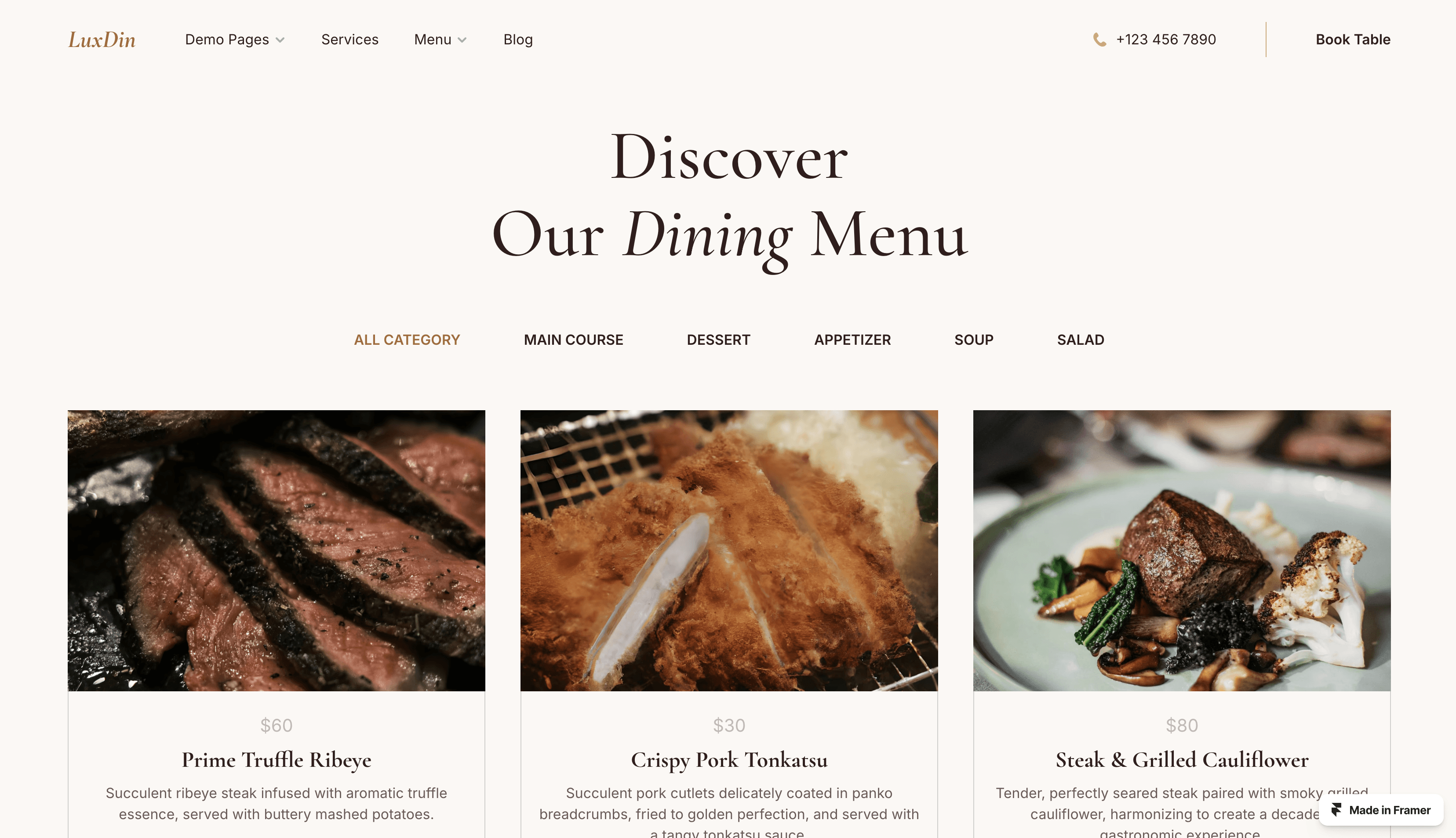 Indulge prospective customers with a delightful view of your services and offers using LuxDin, a minimalist and elegant restaurant website with a framer template