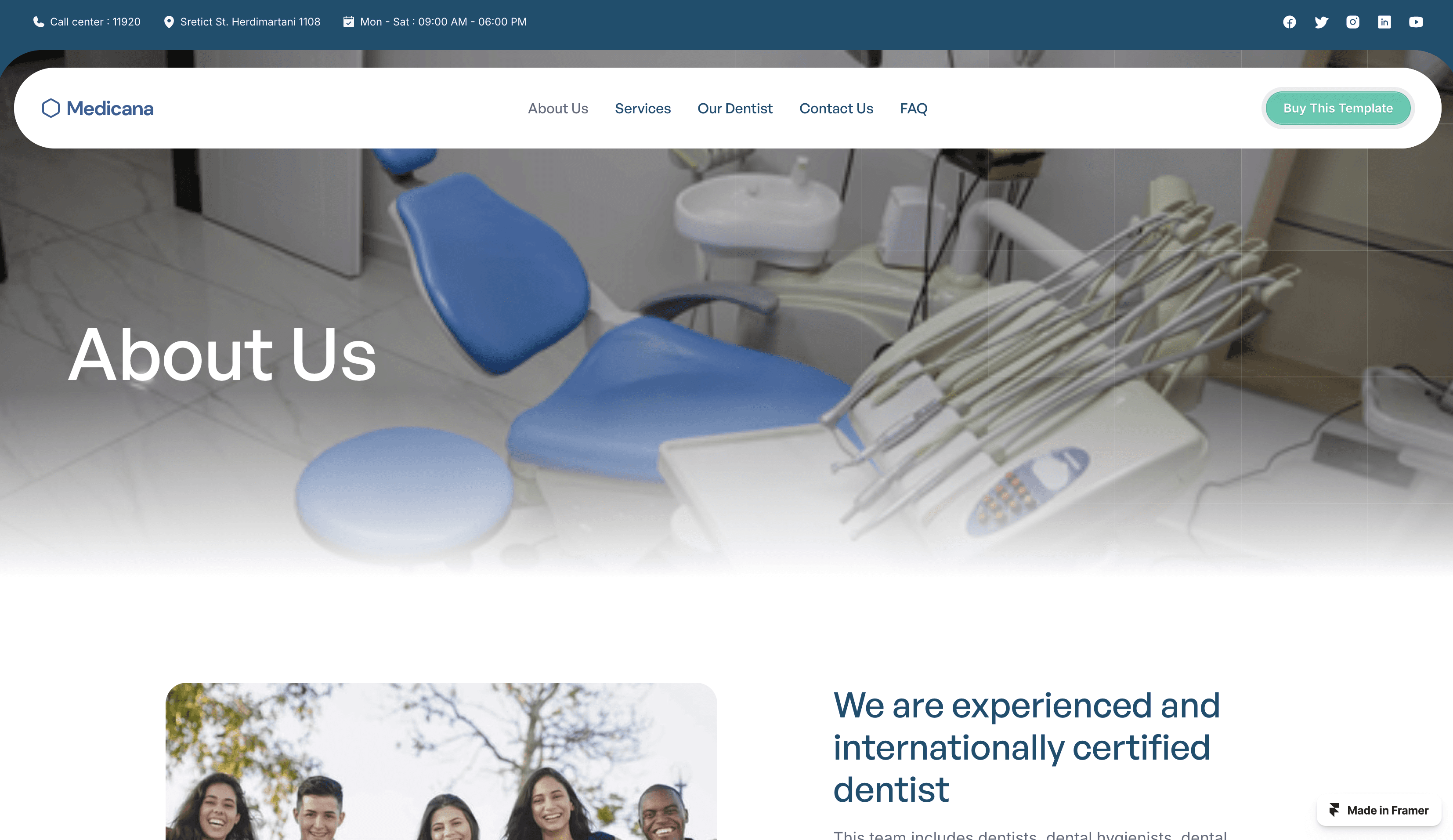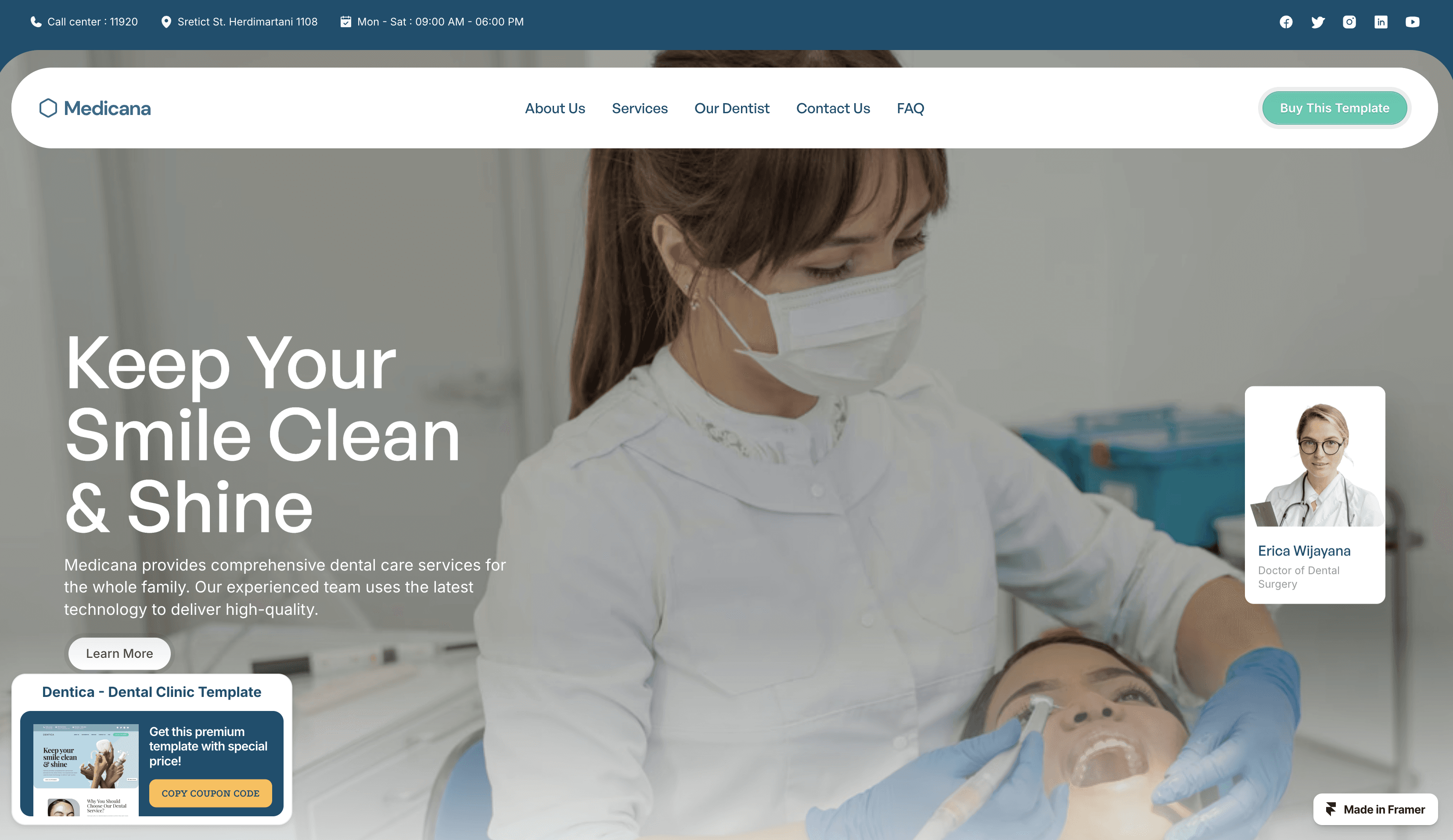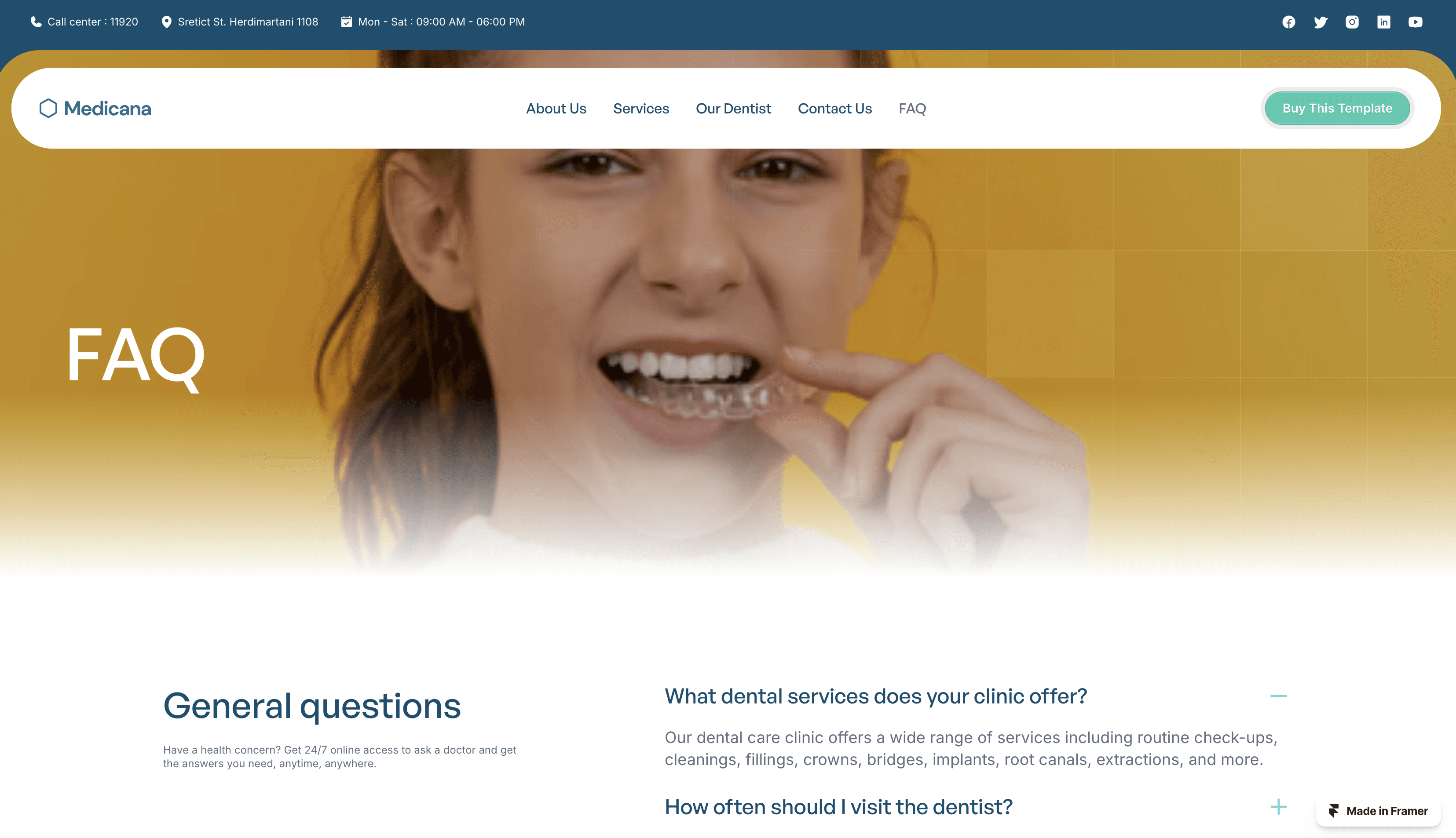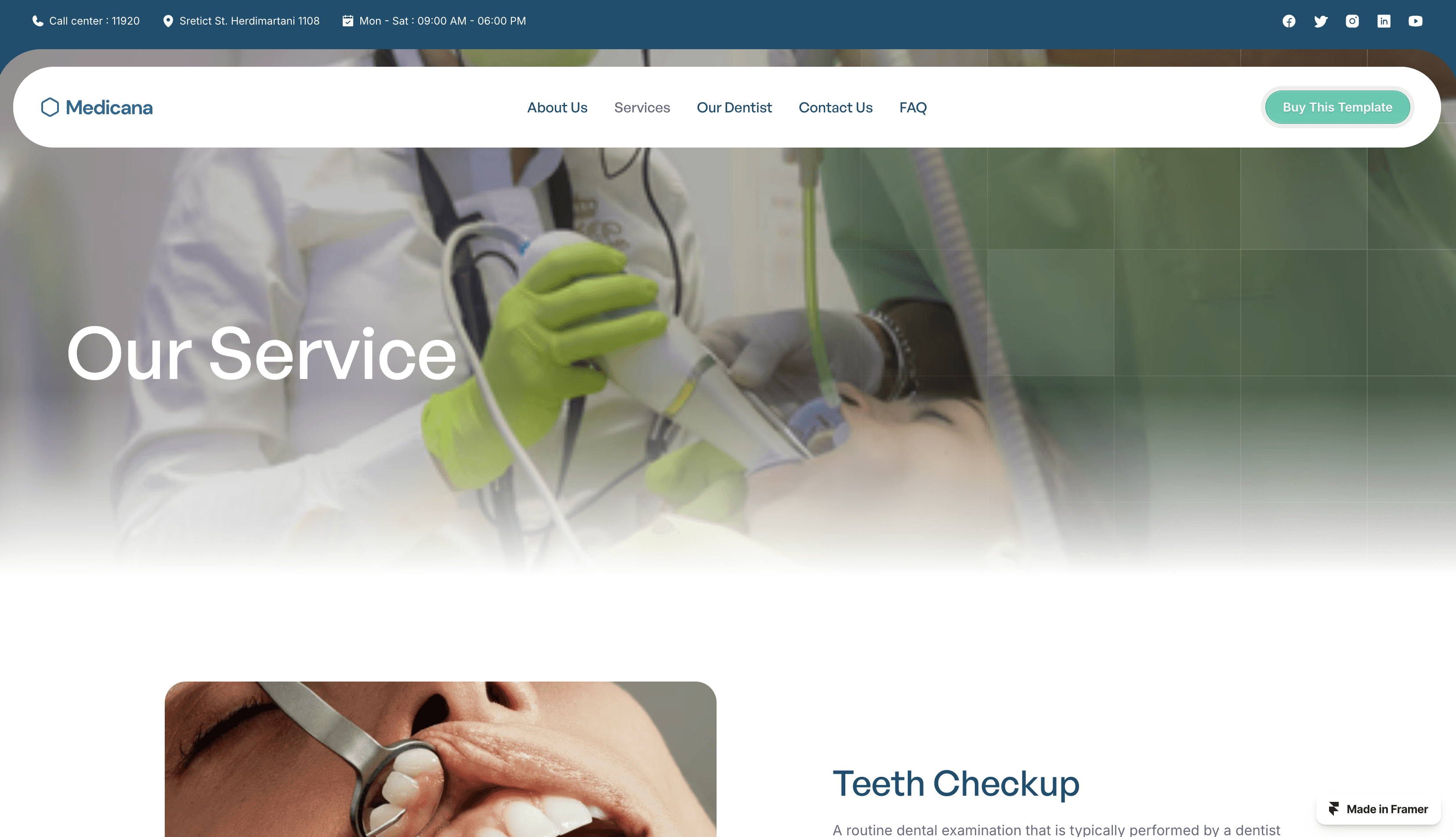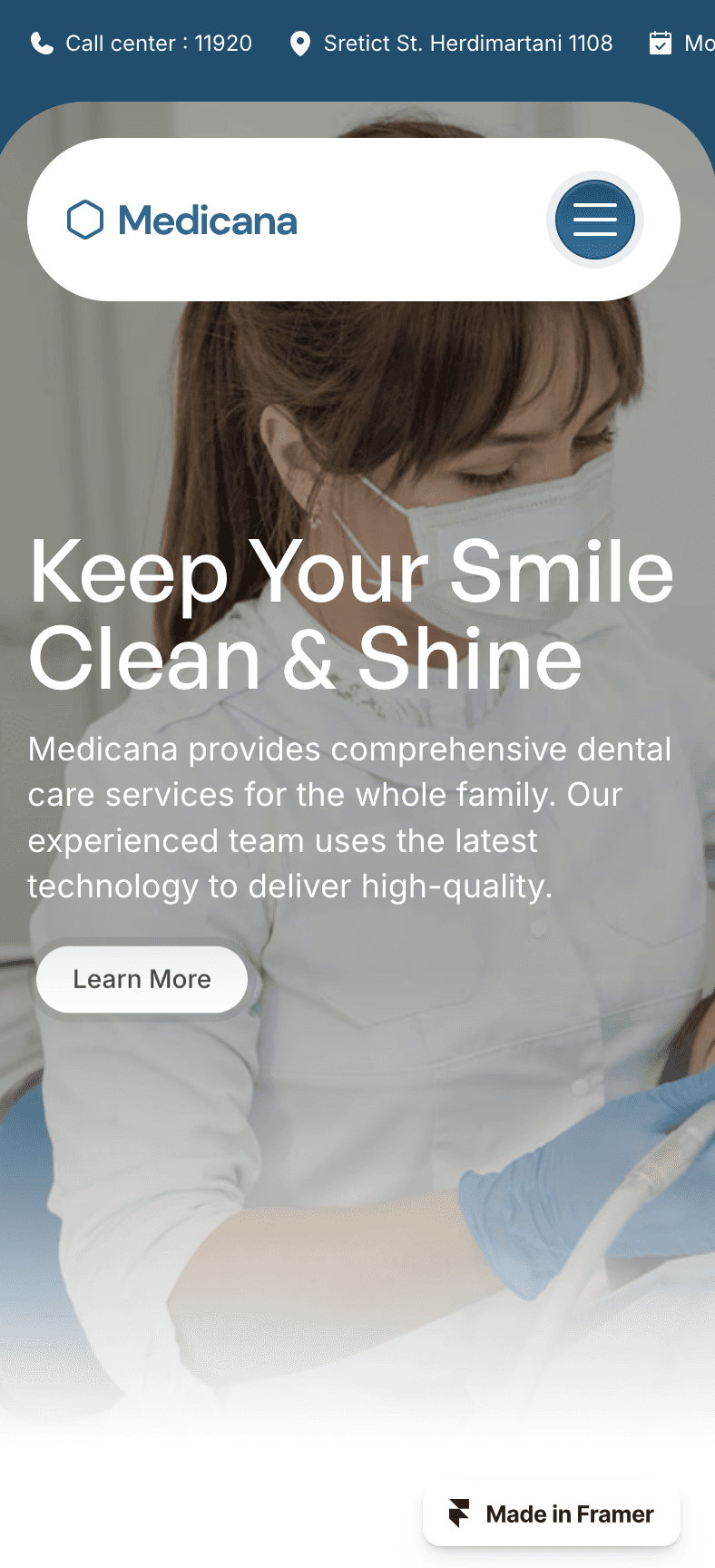 Smile brighter with Medicana, a dental clinic Framer website template. Modern, responsive, and designed to attract new patients to your dental practice.