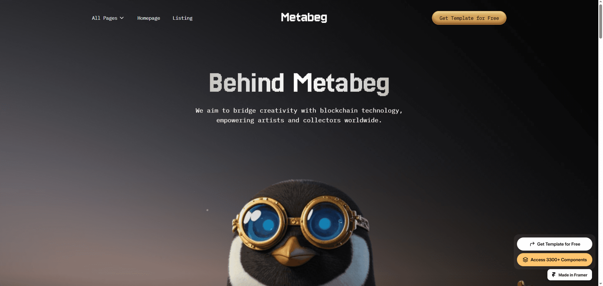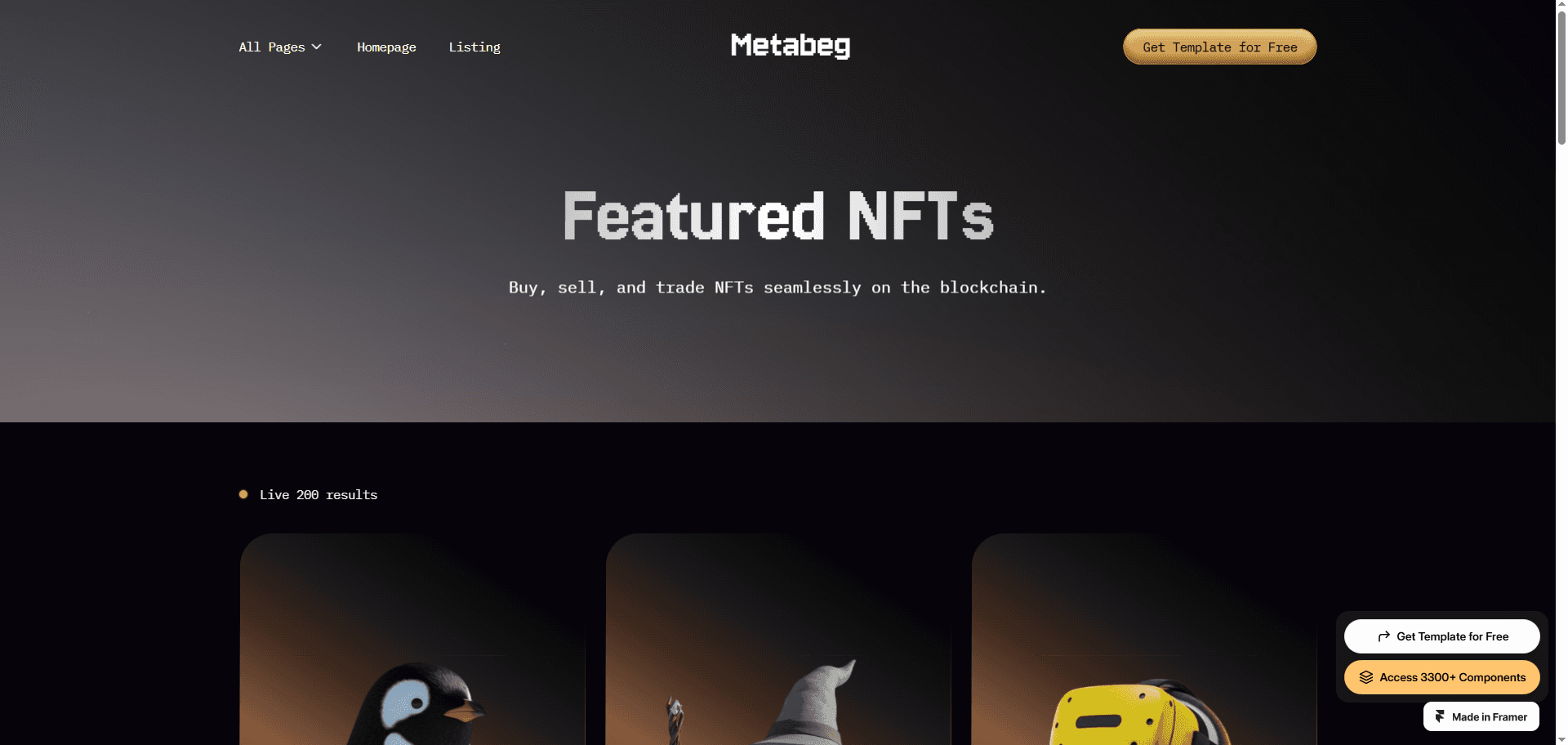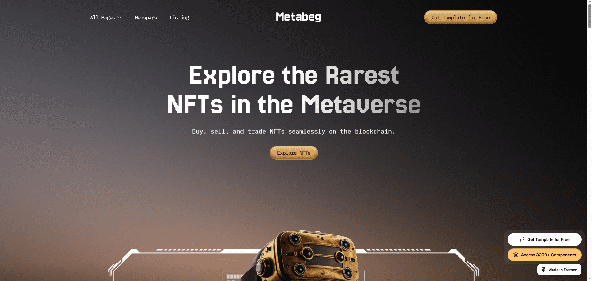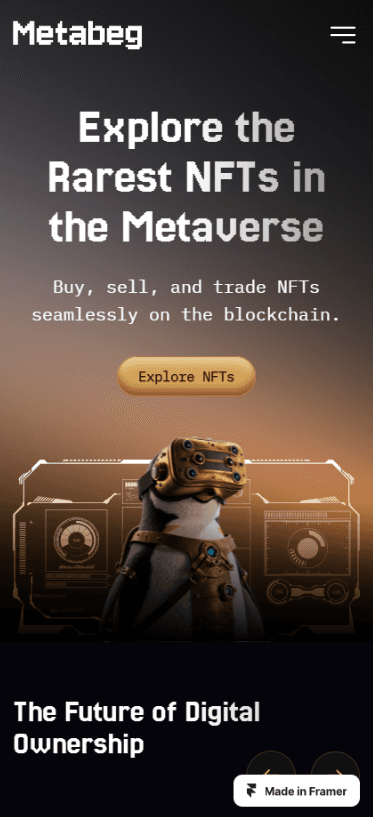 Dive into the exciting world of rare NFTs with Metabeg, an exclusive Framer template built for showcasing NFT projects, cryptocurrency, digital collectibles, blockchain and Web3 ventures.
