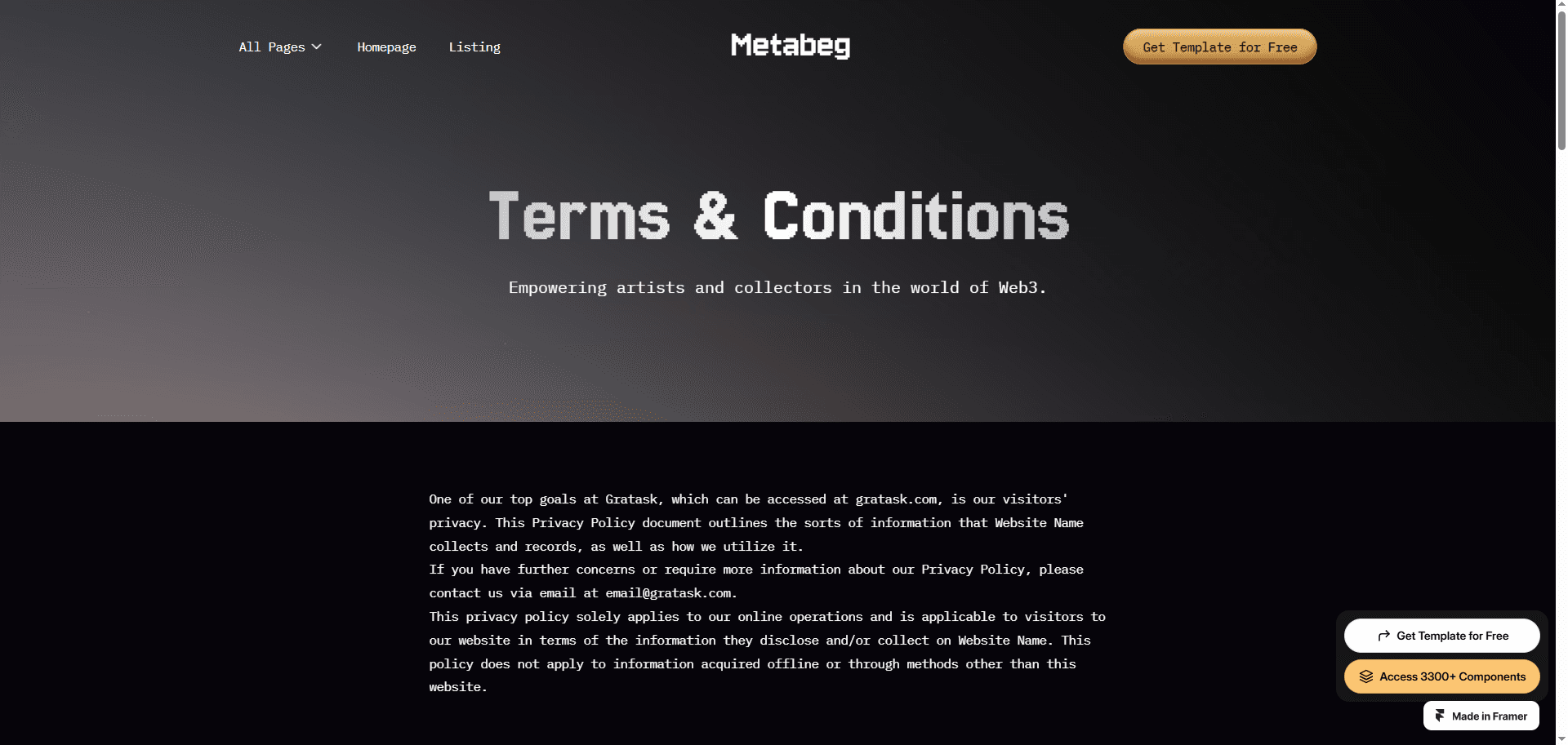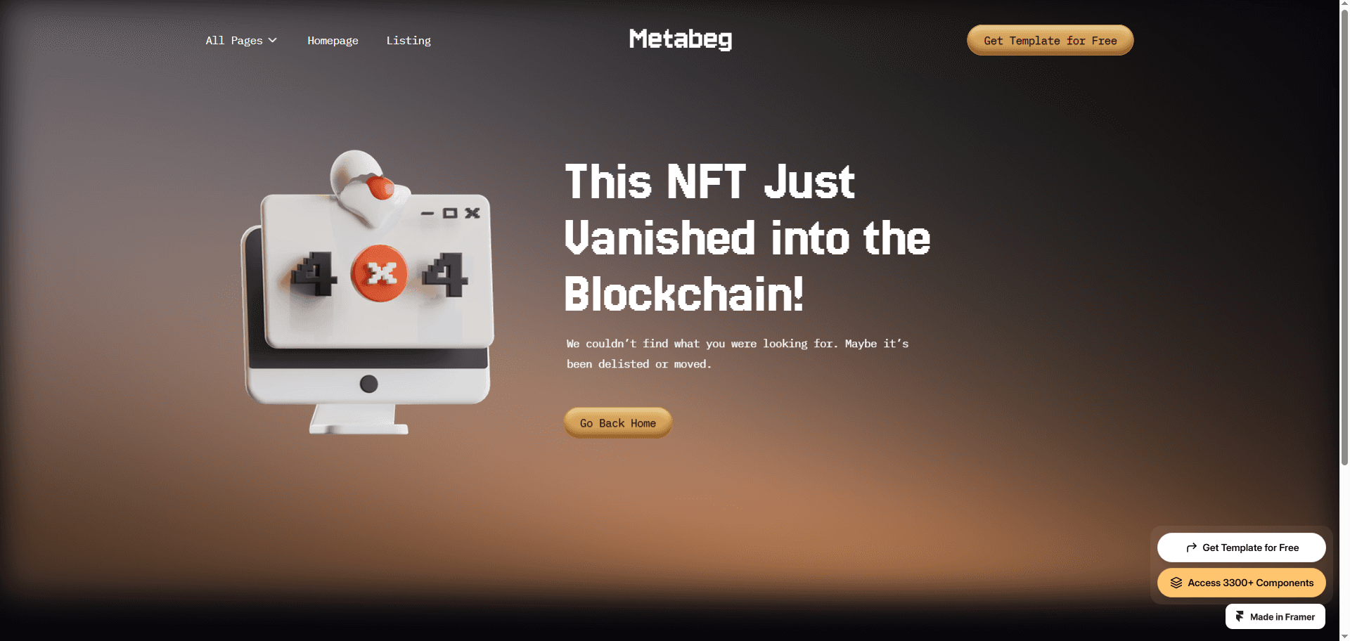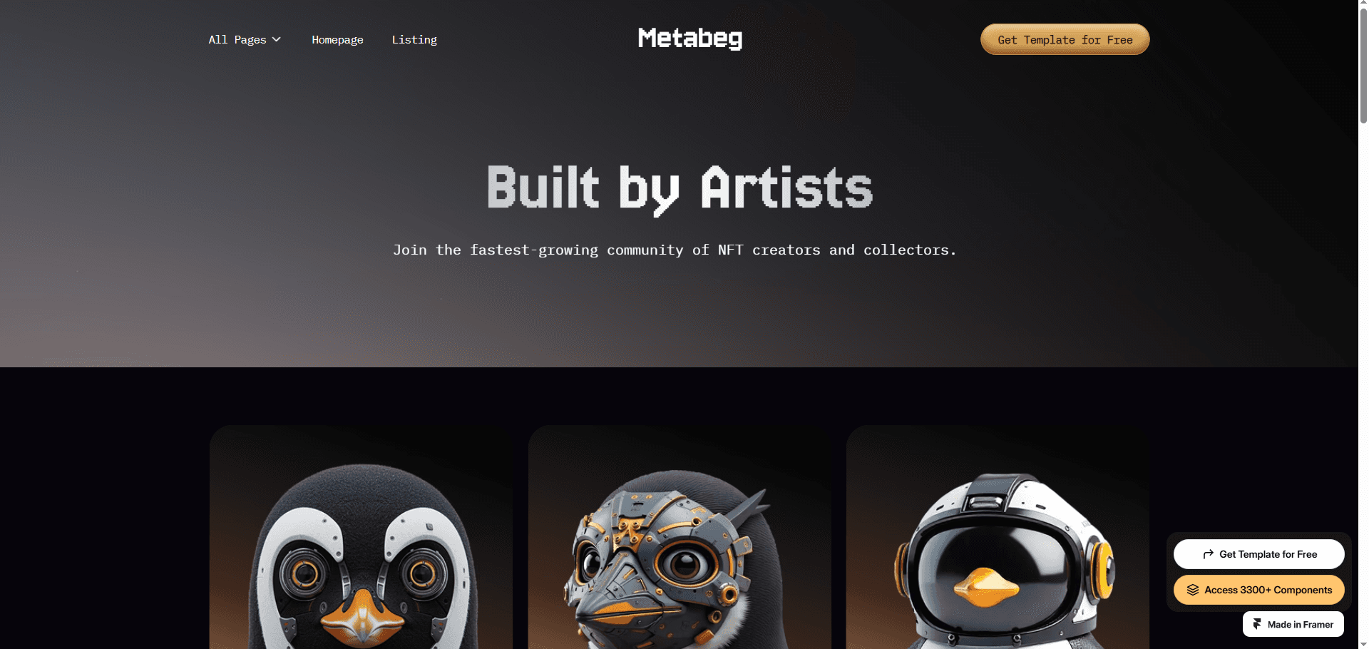 Dive into the exciting world of rare NFTs with Metabeg, an exclusive Framer template built for showcasing NFT projects, cryptocurrency, digital collectibles, blockchain and Web3 ventures.