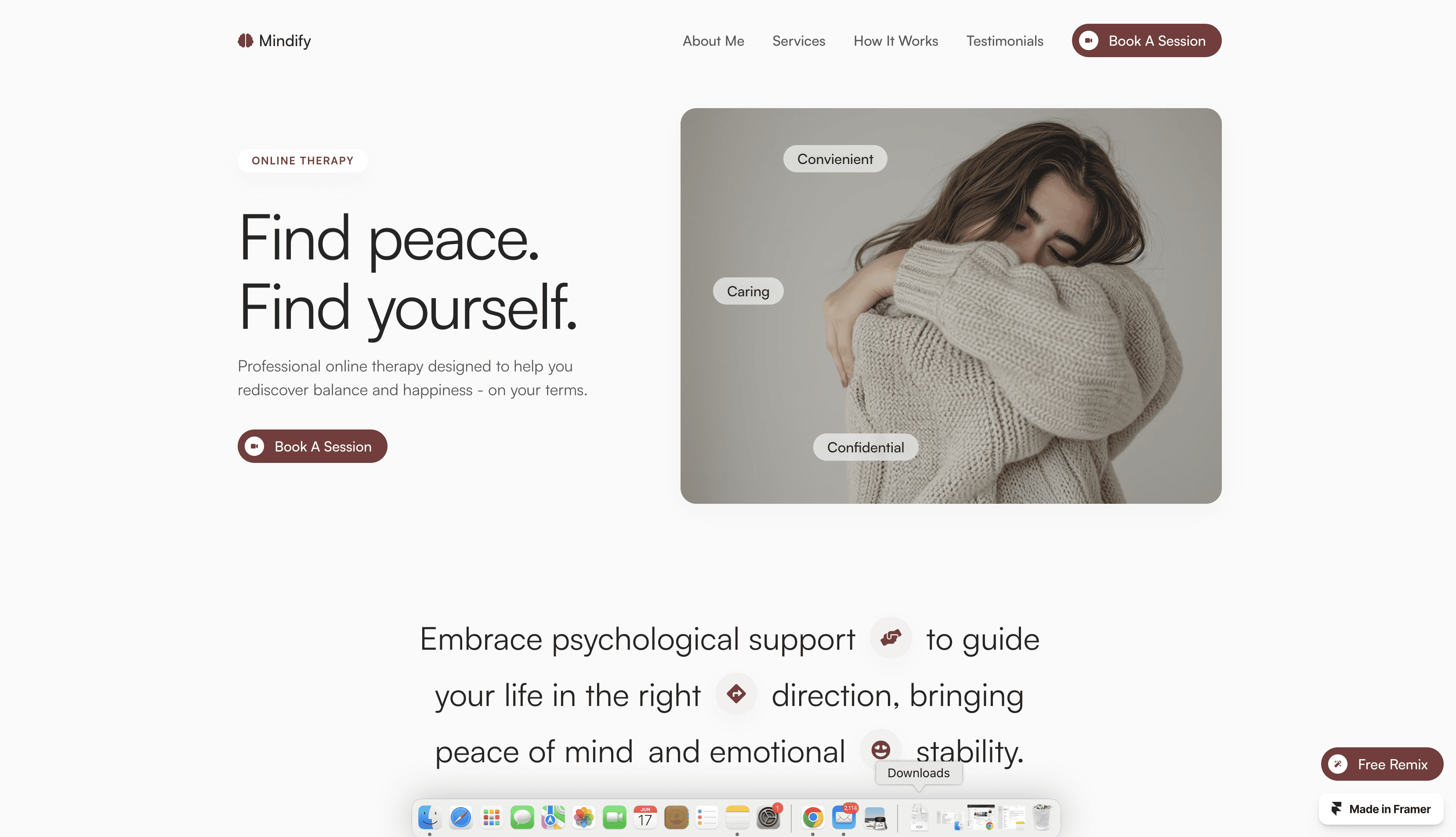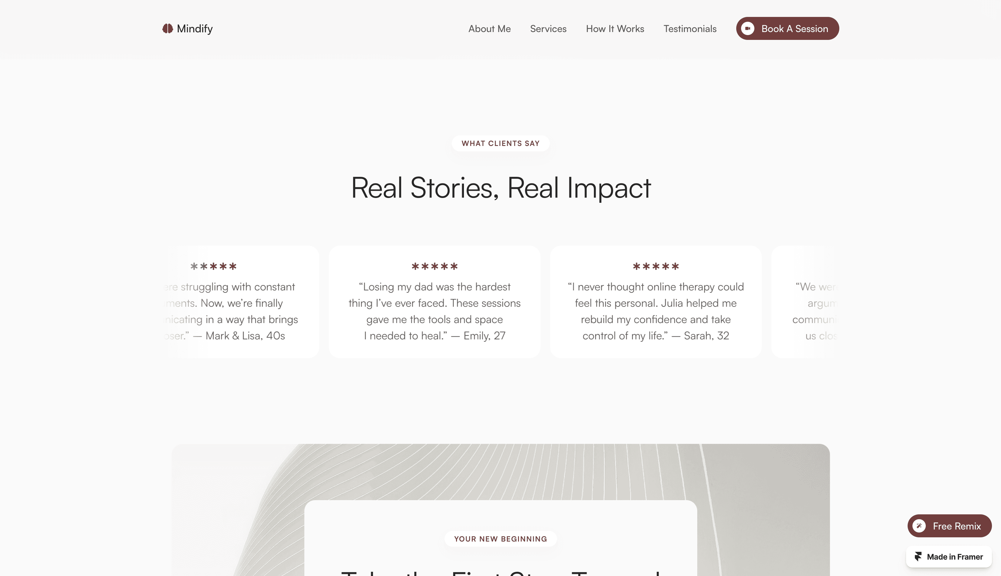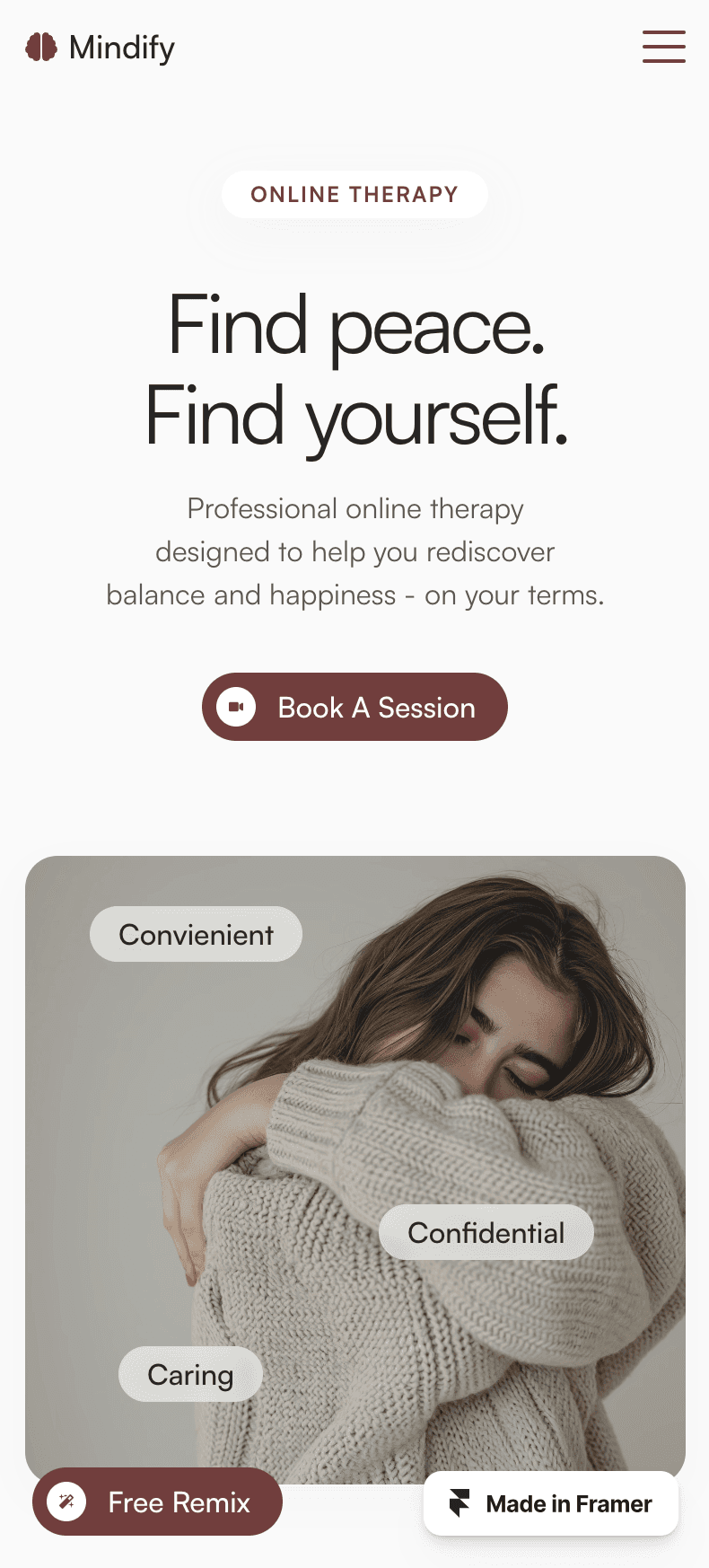 Mindify is a modern Framer template tailored for online psychologists and therapists, offering a professional, calming design with all the essential sections to establish trust and connect with clients.