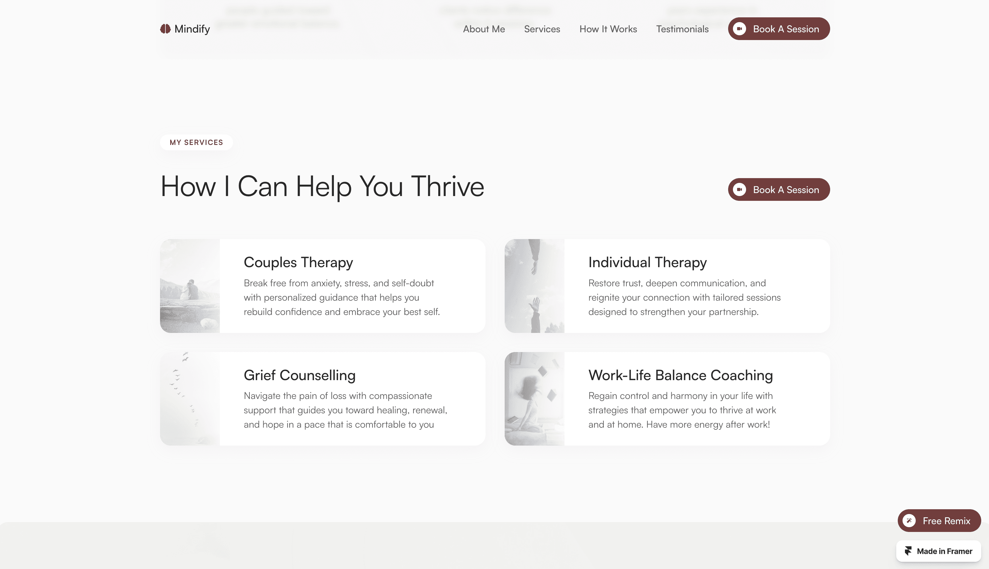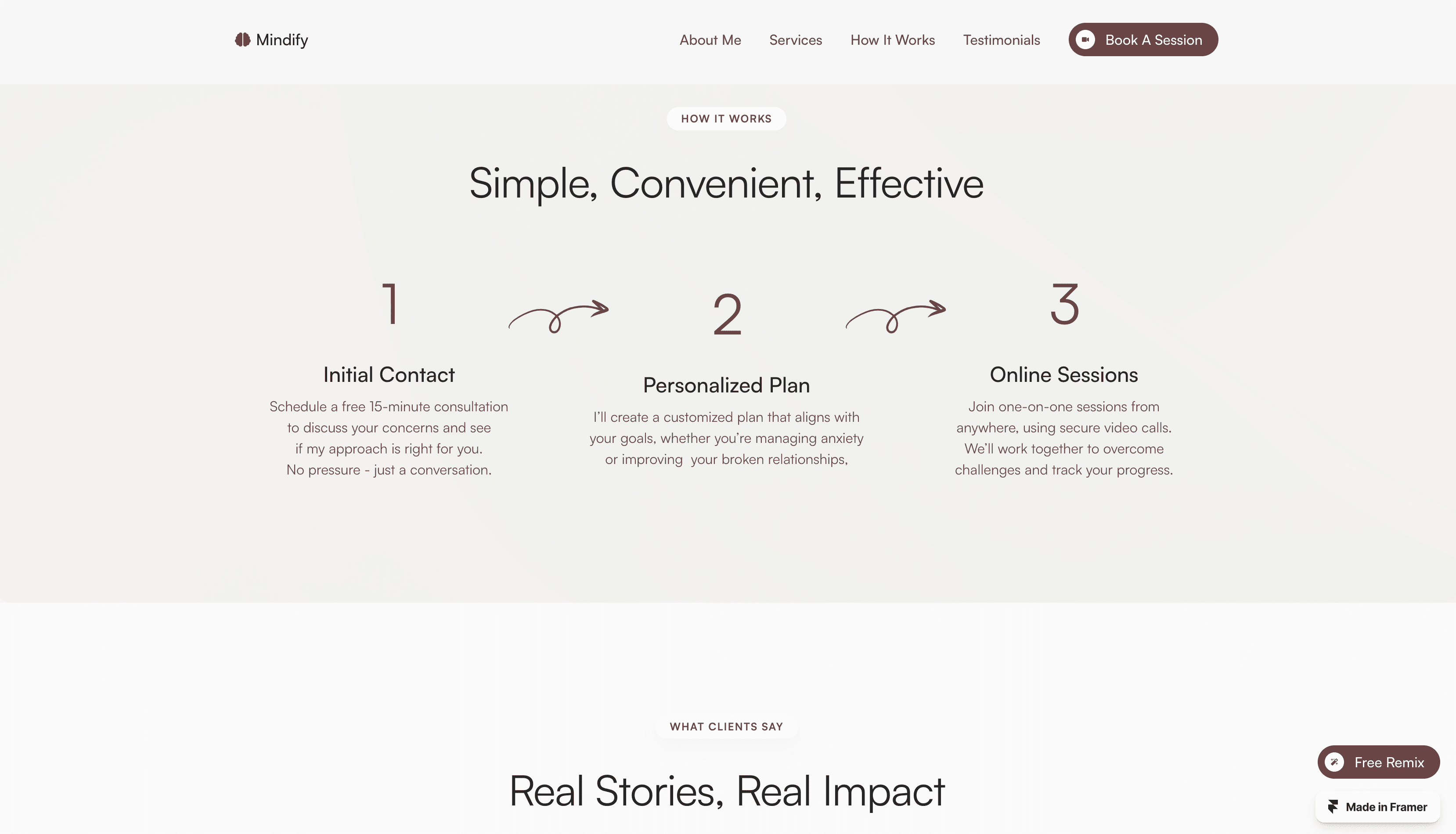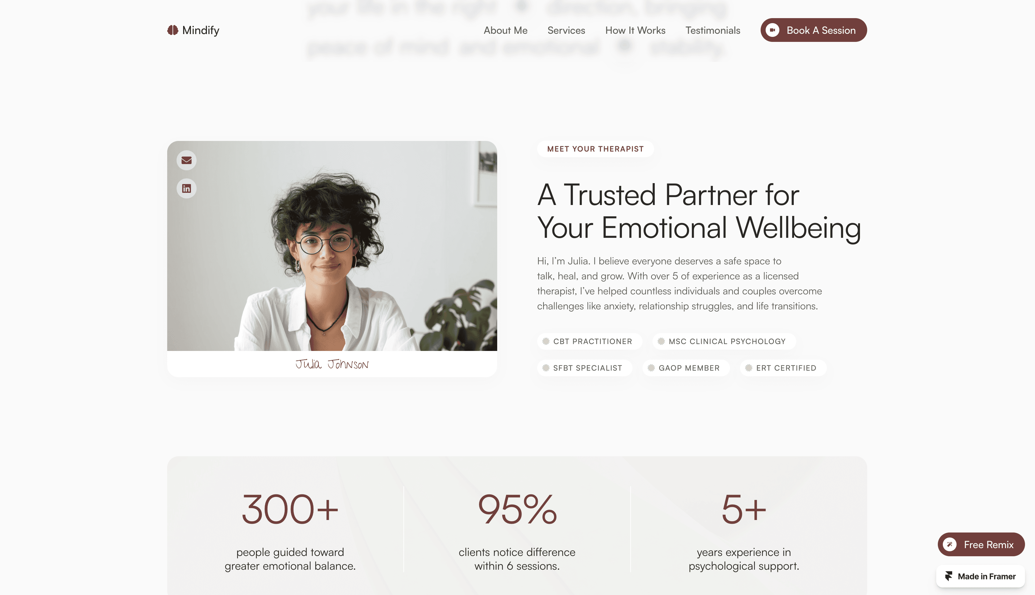 Mindify is a modern Framer template tailored for online psychologists and therapists, offering a professional, calming design with all the essential sections to establish trust and connect with clients.