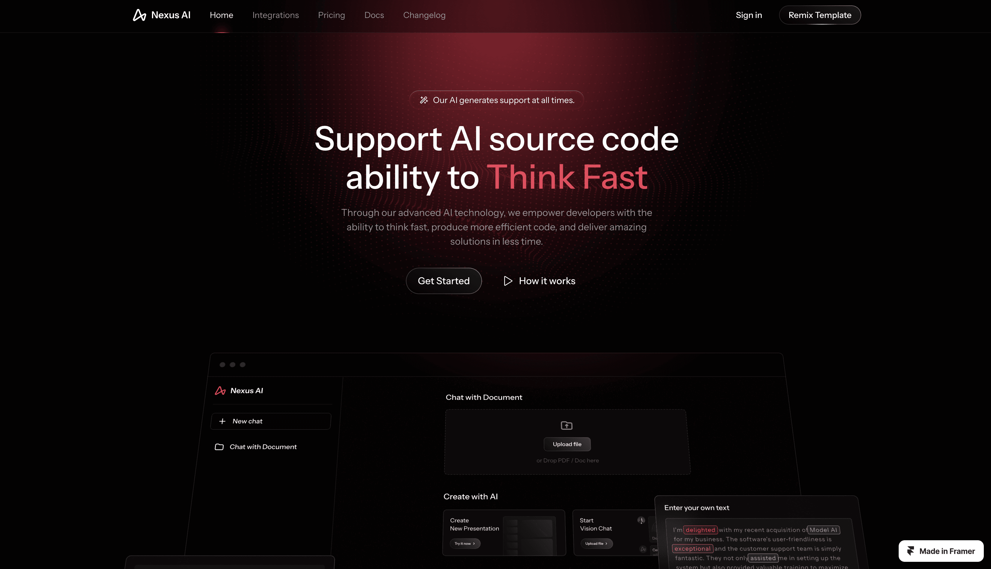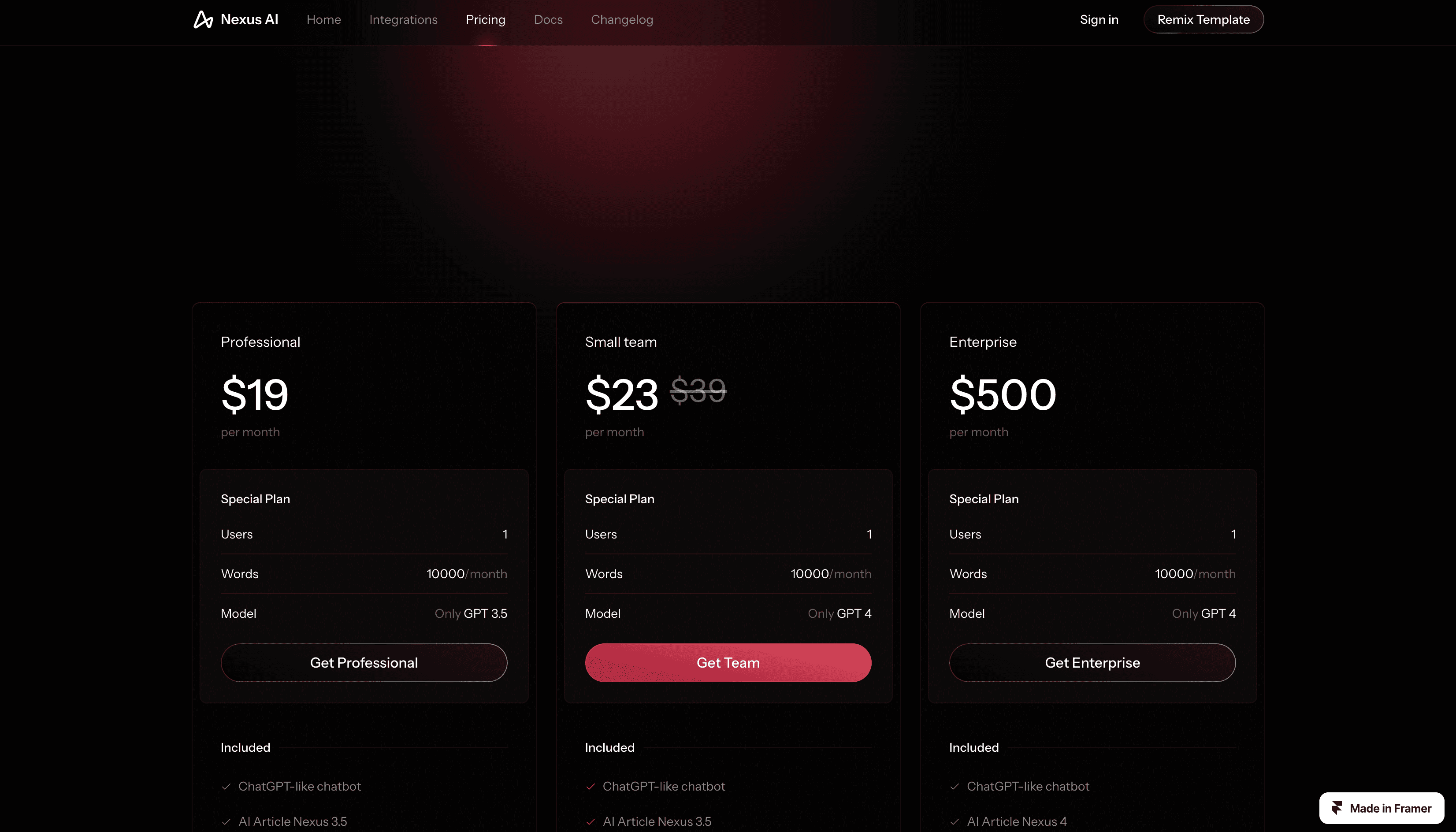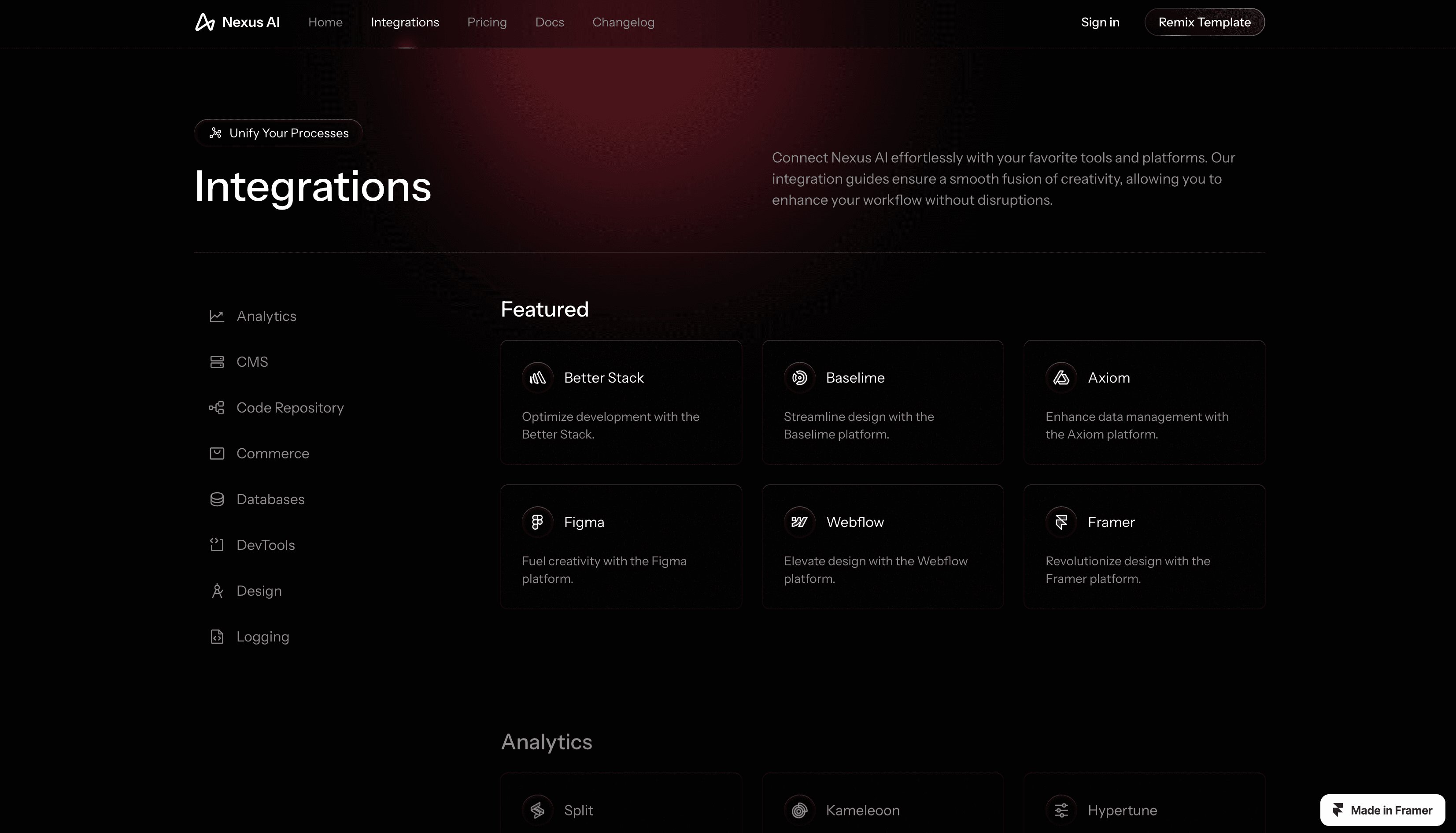 Discover the Nexus AI Framer Template, a dynamic solution that effortlessly combines the power of an AI Platform Marketing website (CMS) with the versatility of 7 collections, all wrapped in an elegant Dark Theme.