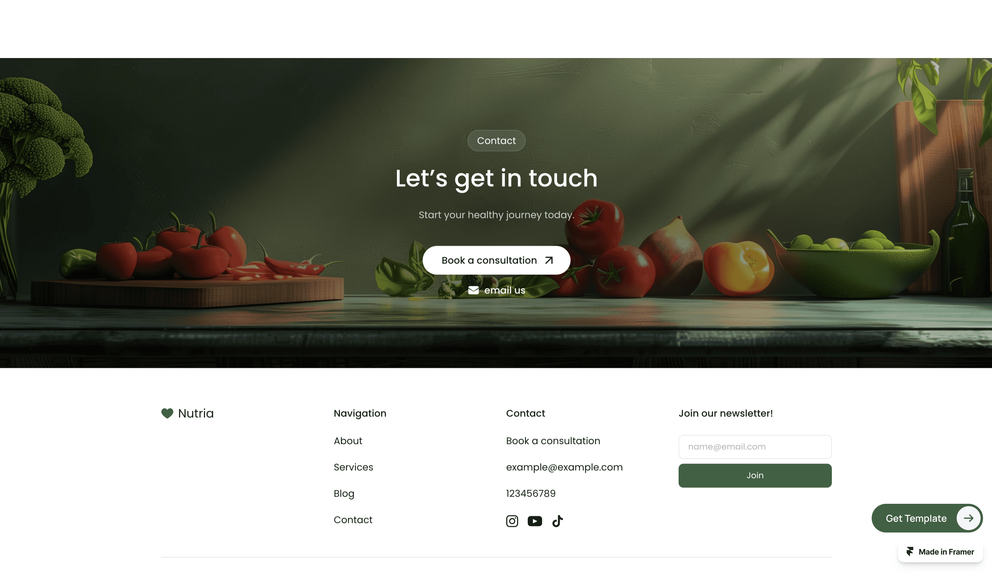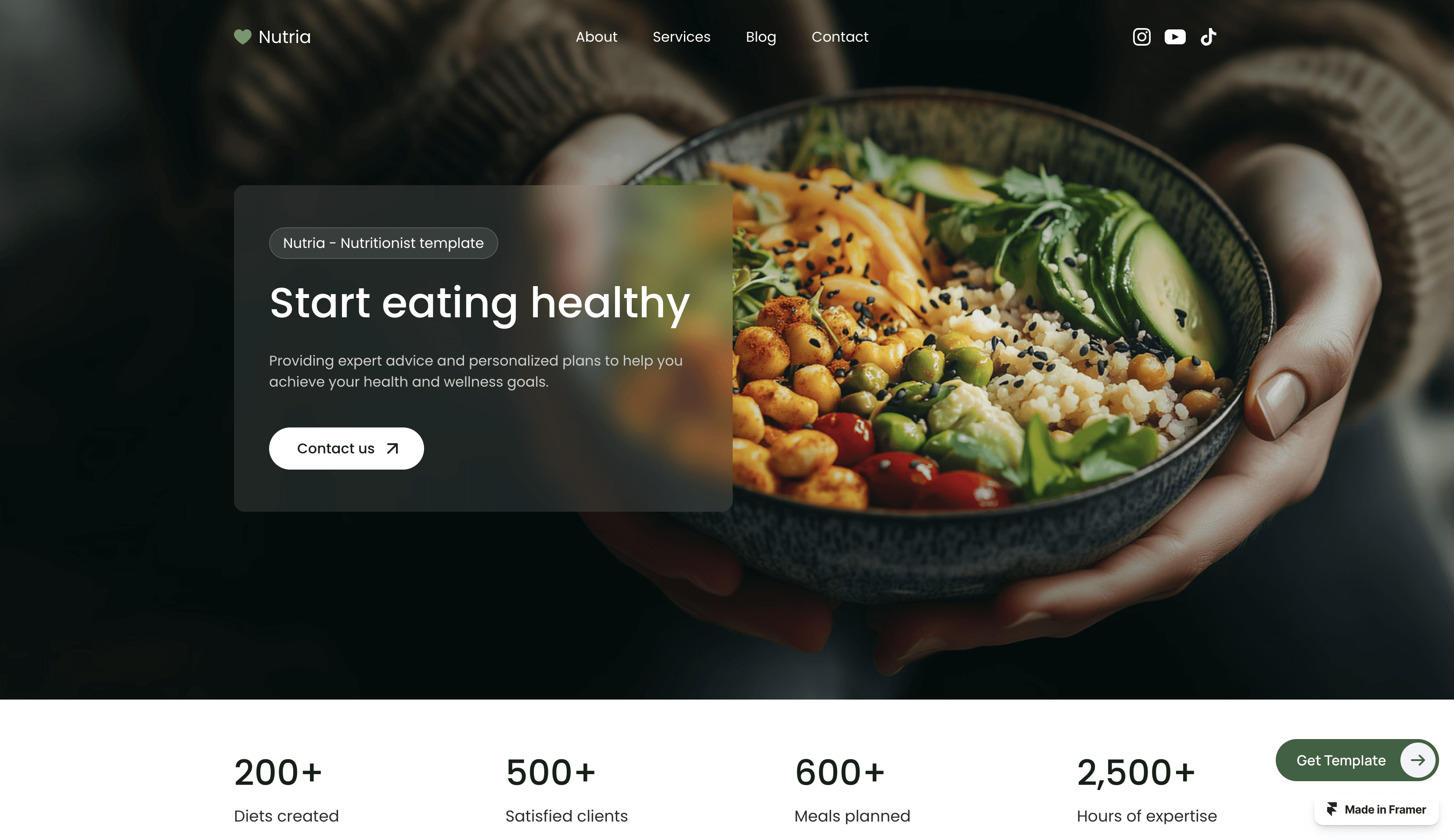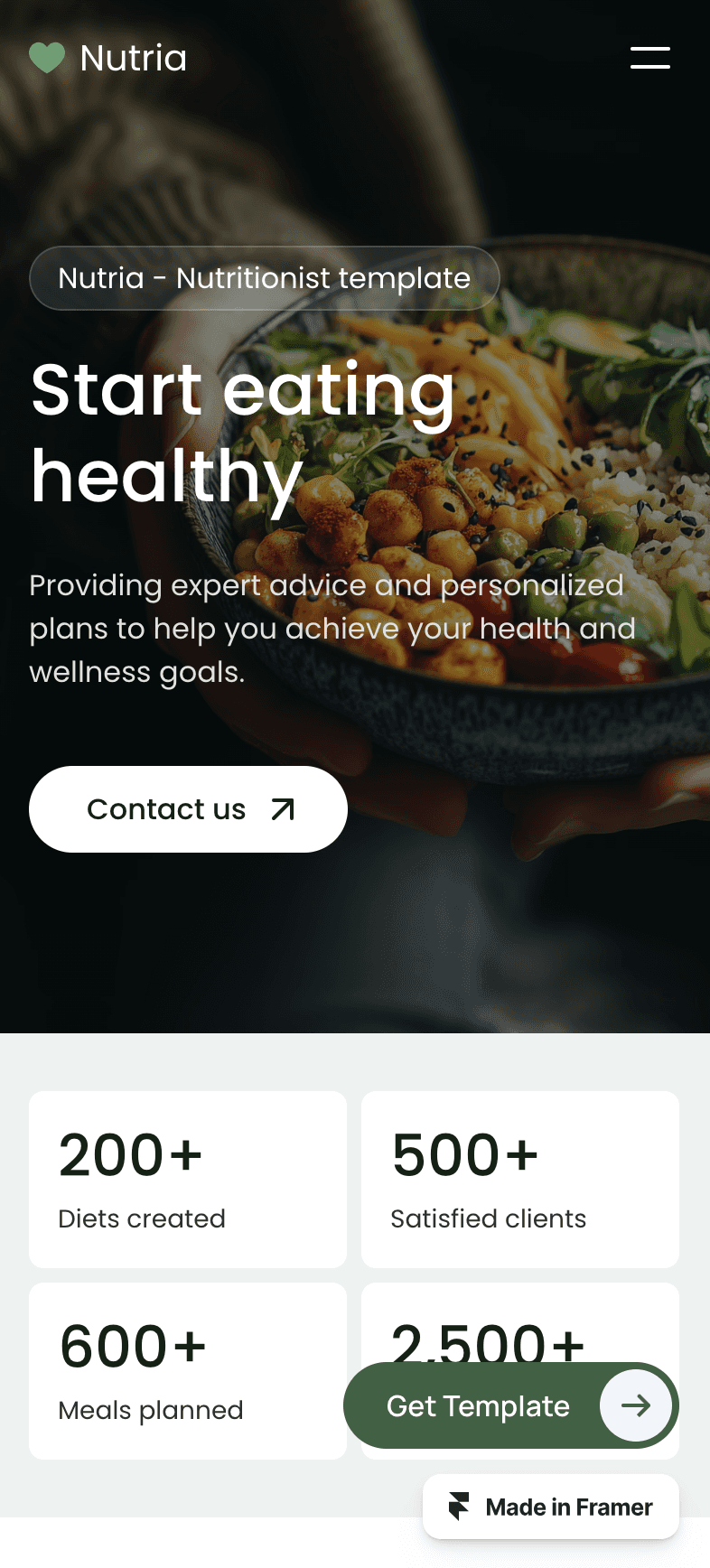 Nutria is a sleek, modern Framer template for nutritionists, featuring a high-converting landing page and blog to effectively attract and engage more clients online.