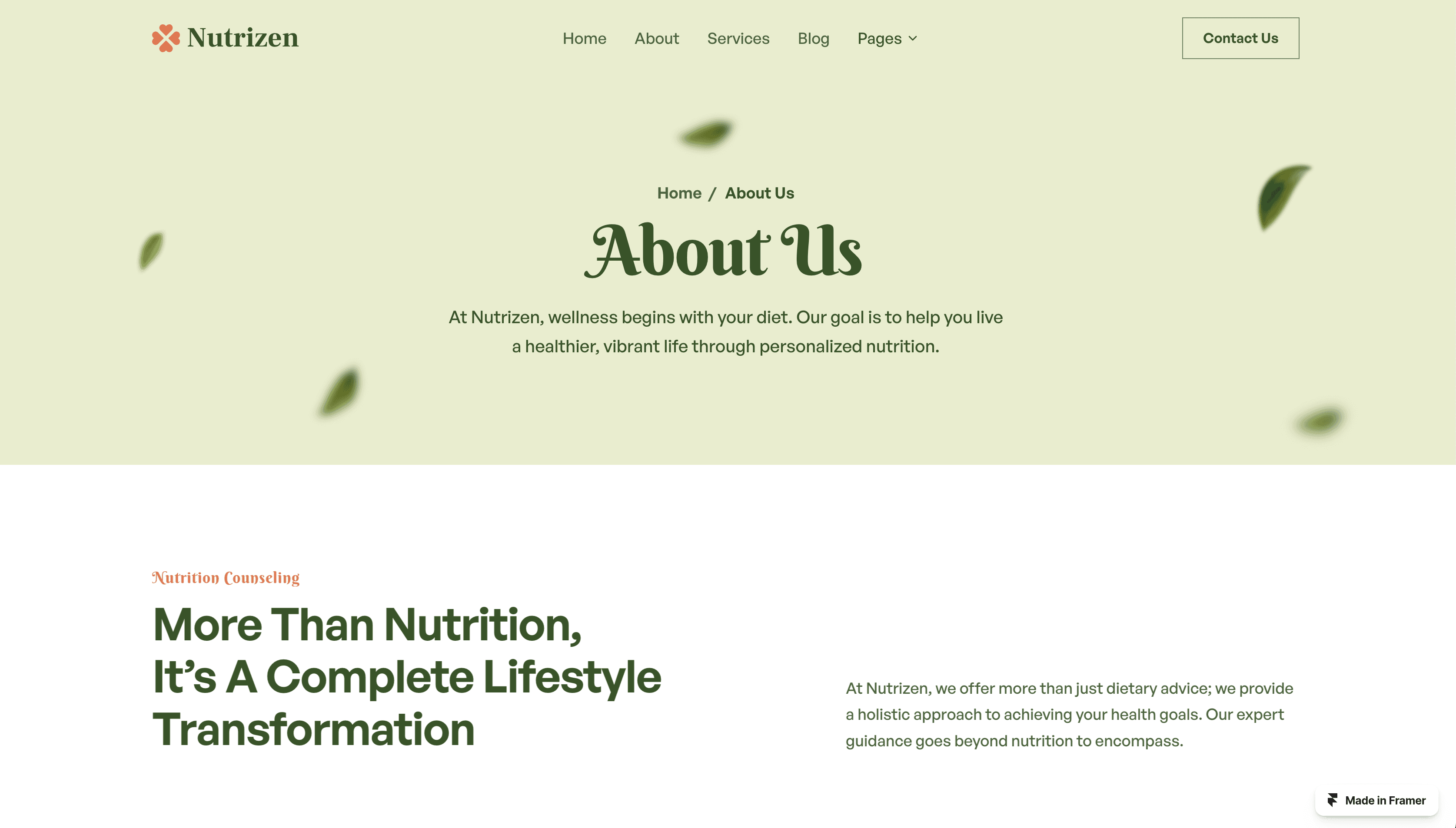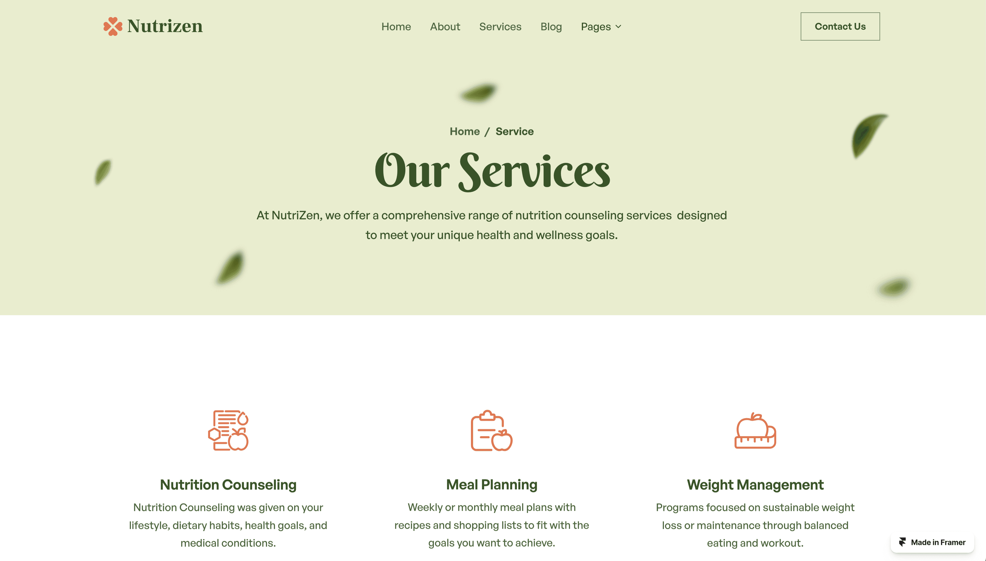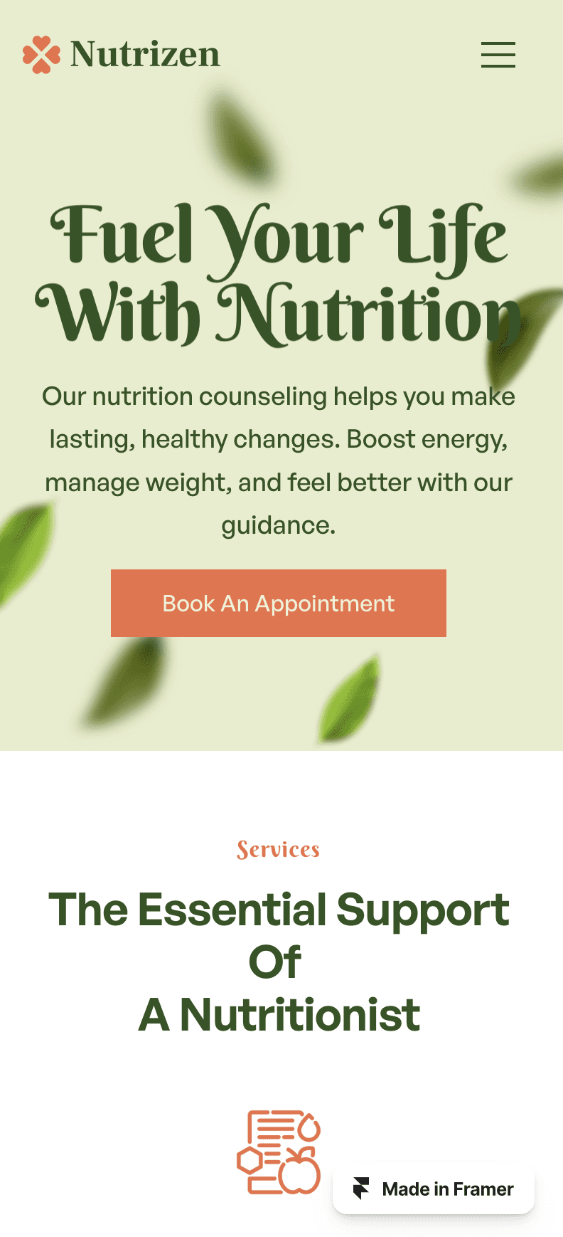 Nutrizen framer template is designed for nutritionists aiming to enhance their online presence and effectively engage clients.