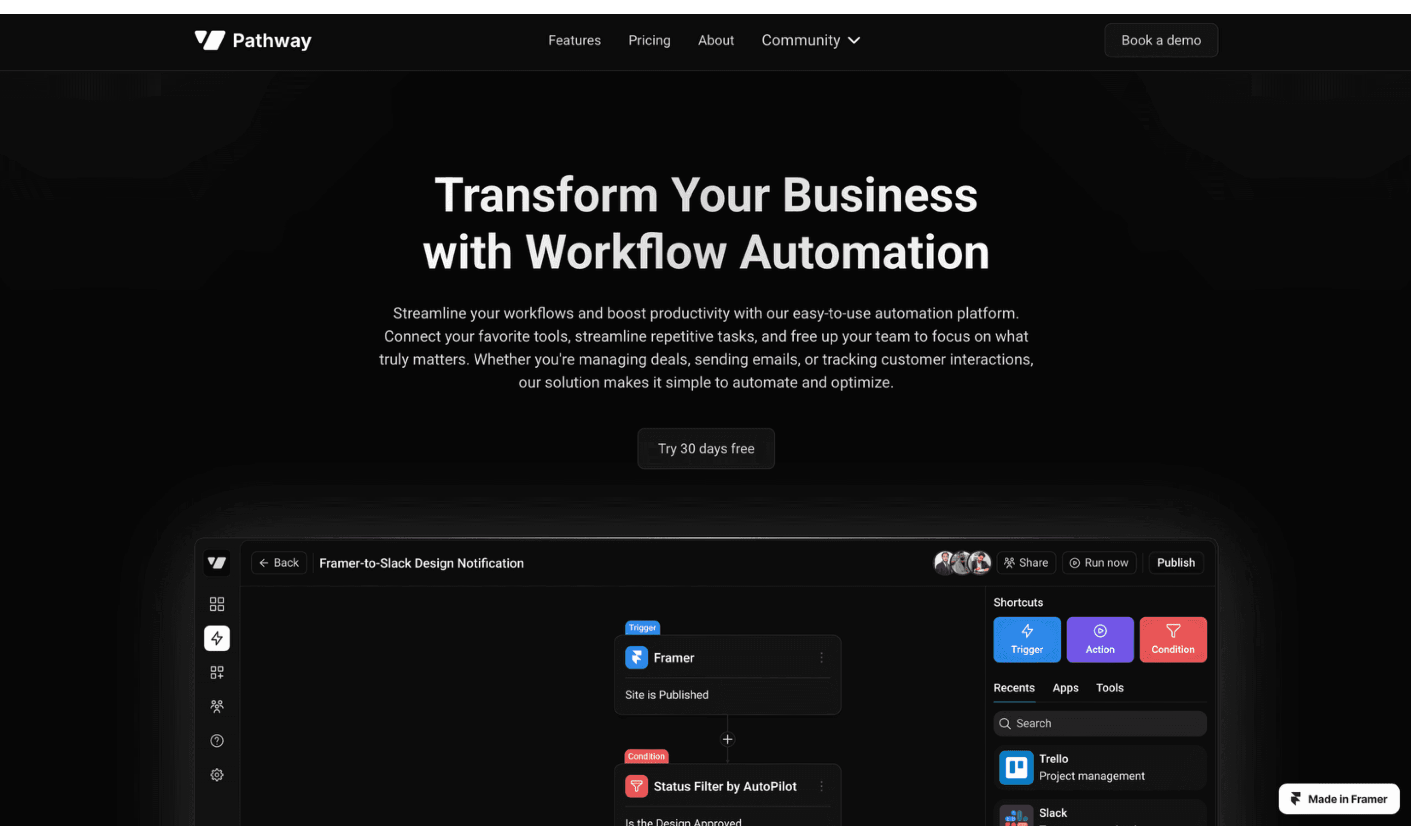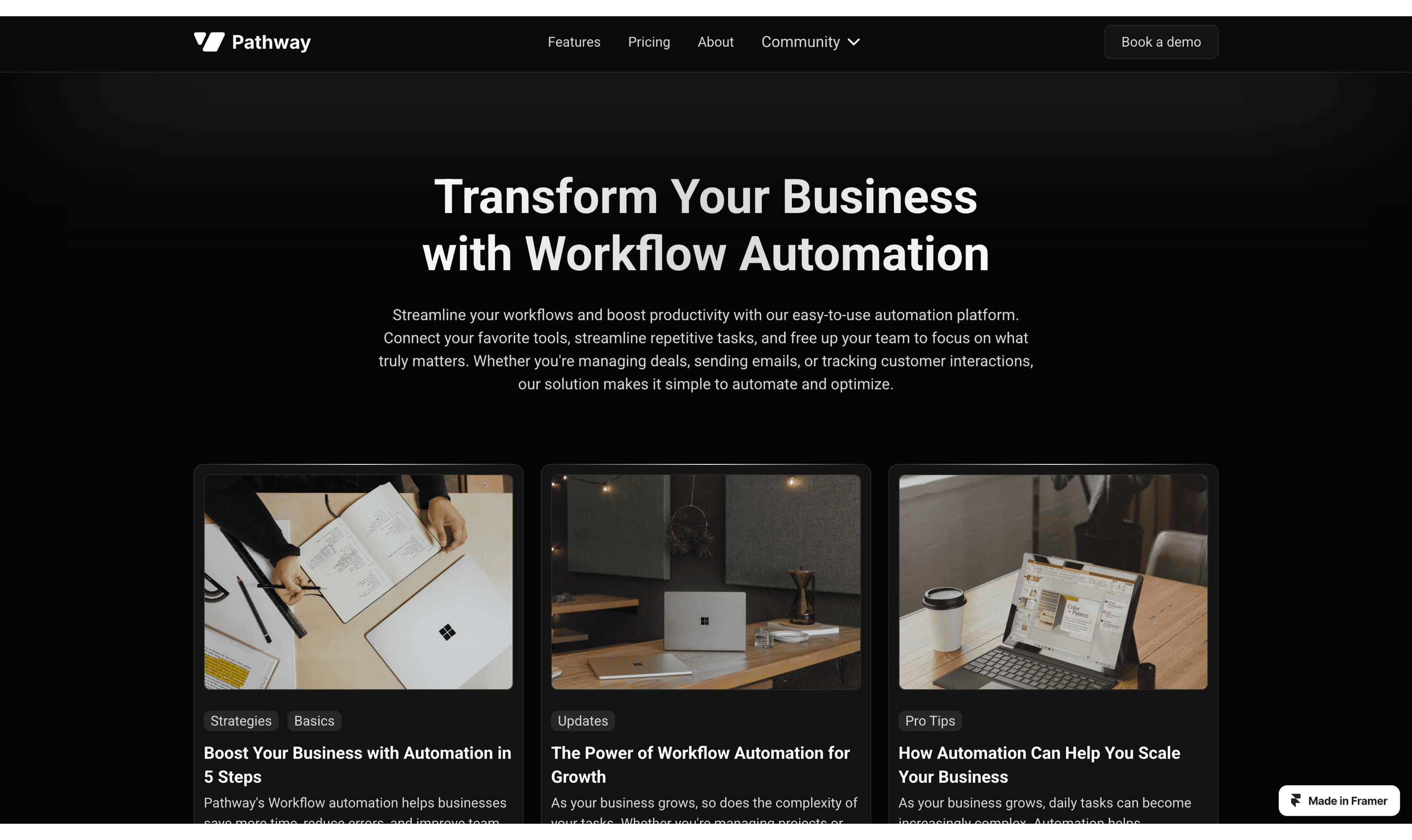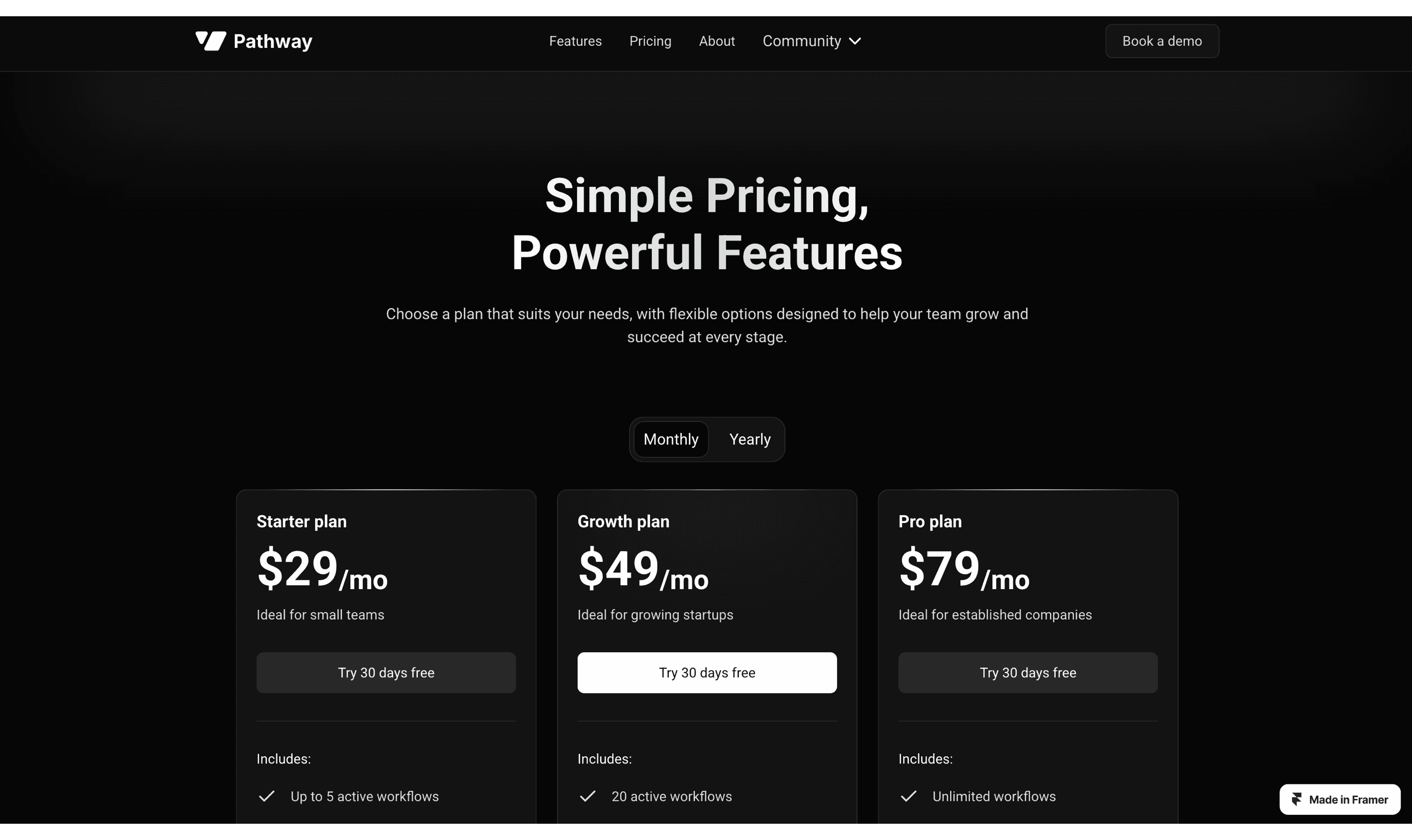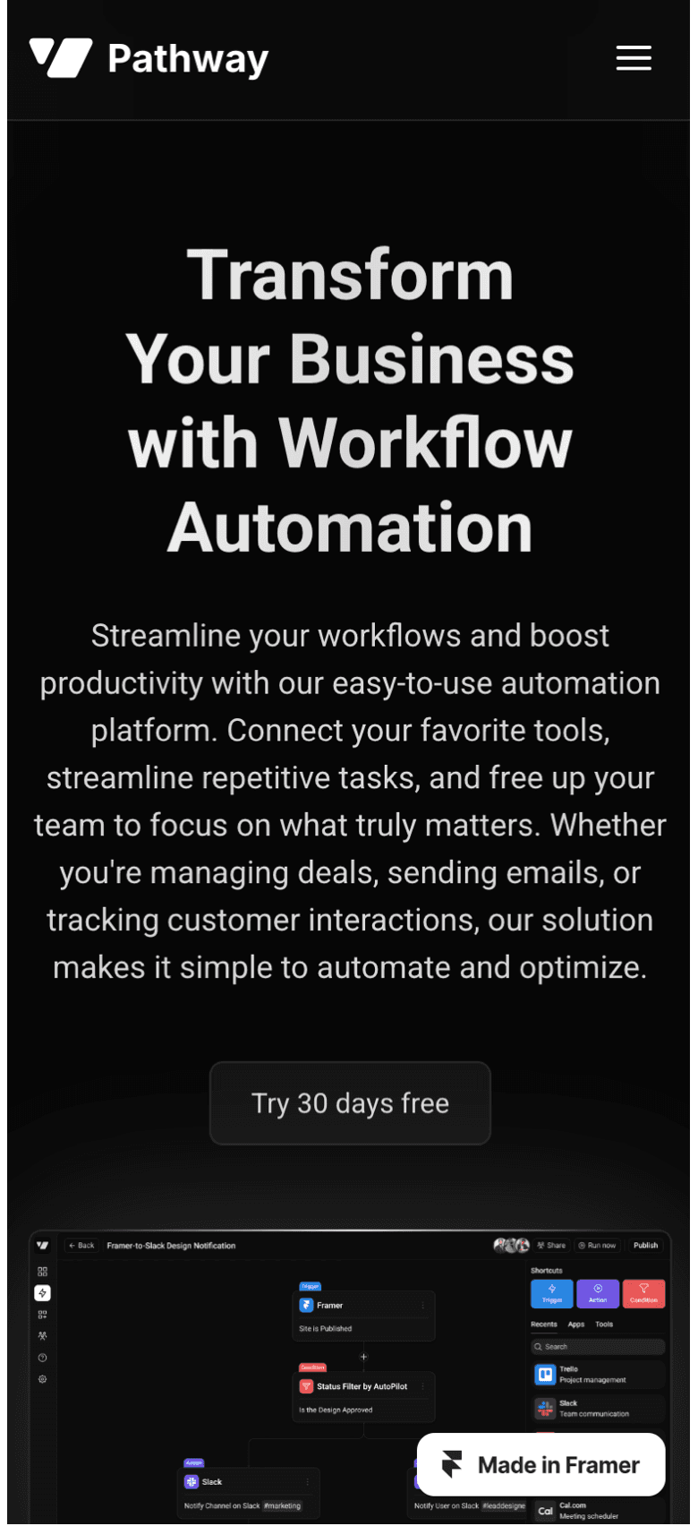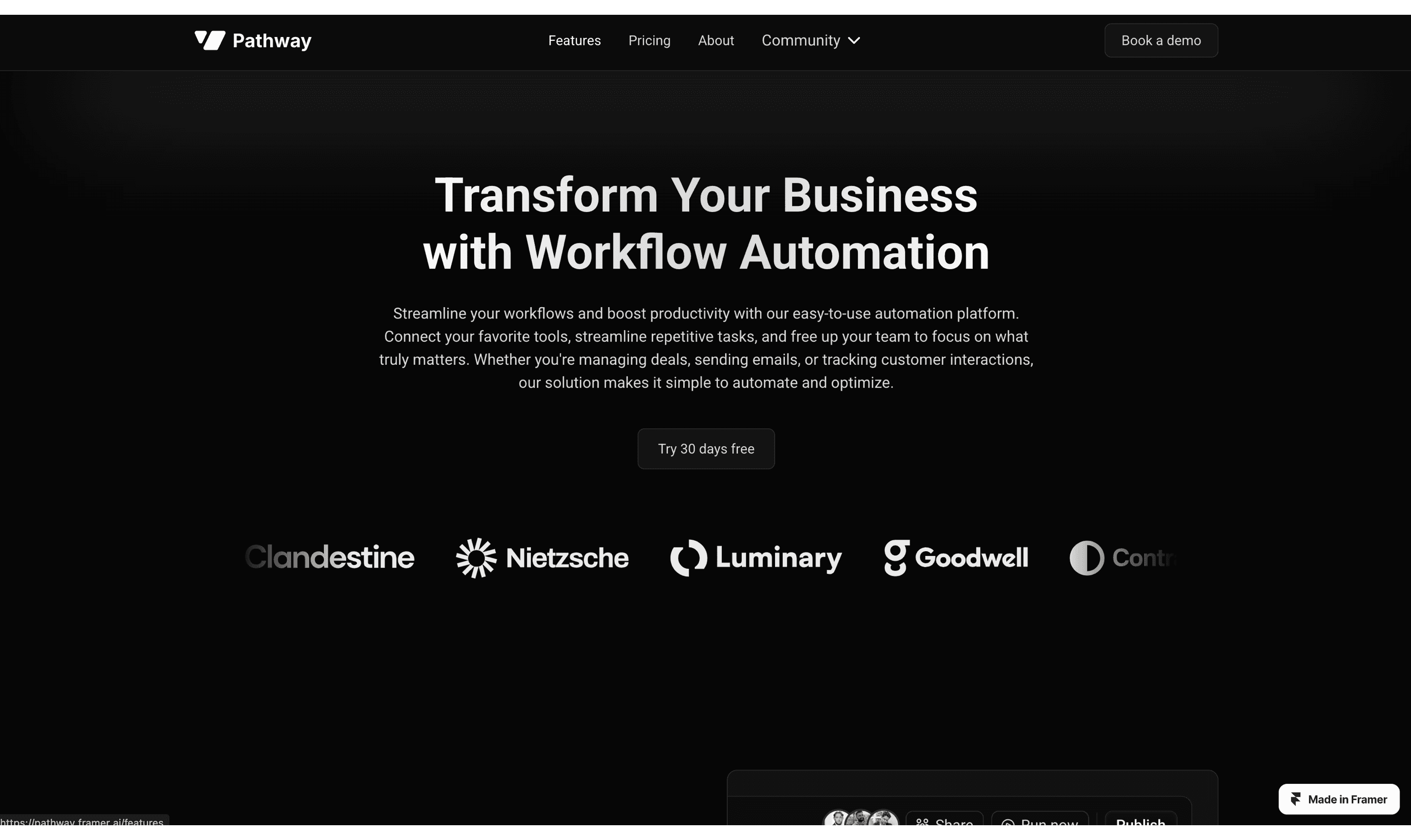 Pathway is a modern SaaS Framer template built for flexibility. With sleek layouts and effortless customization, it’s perfect for showcasing any software product or service.