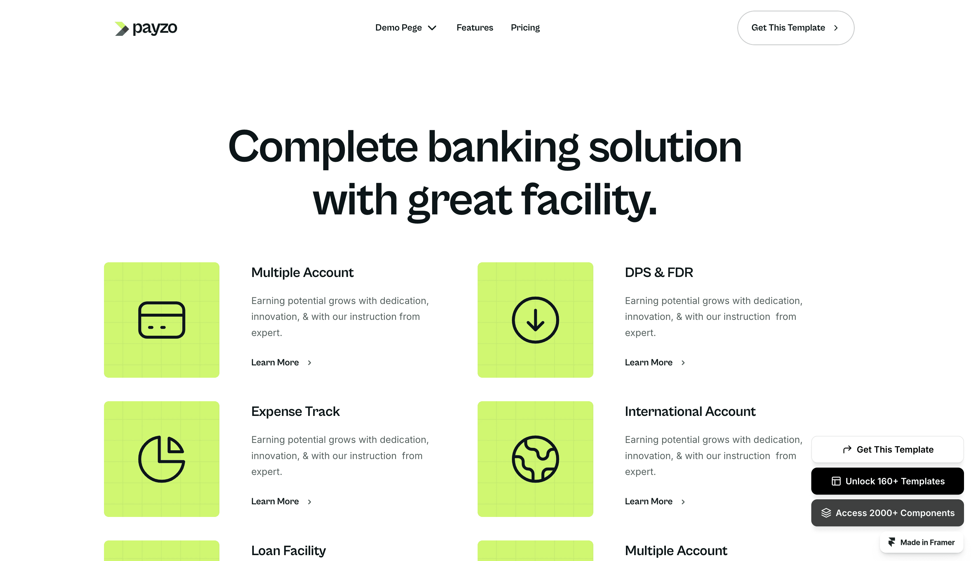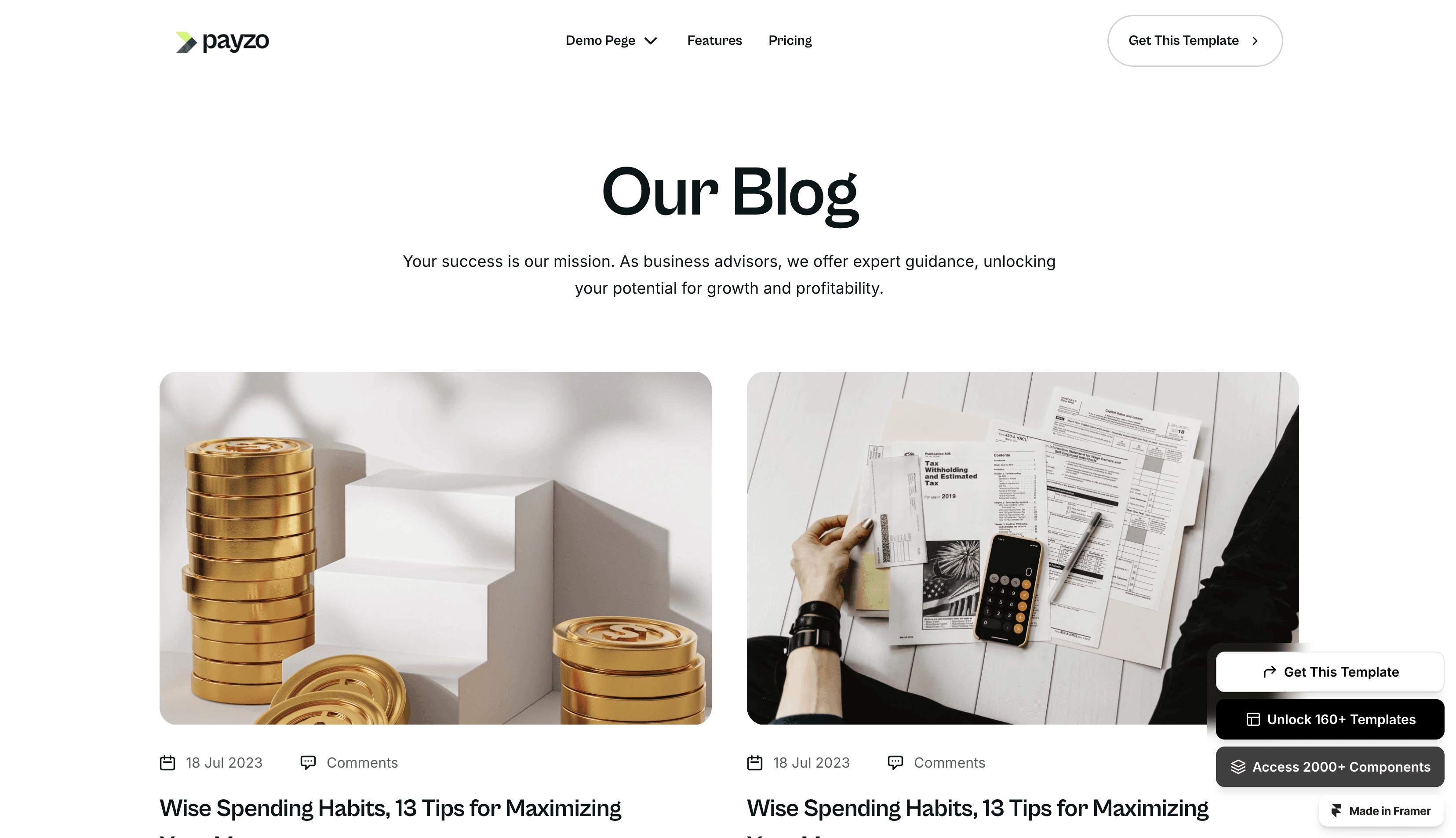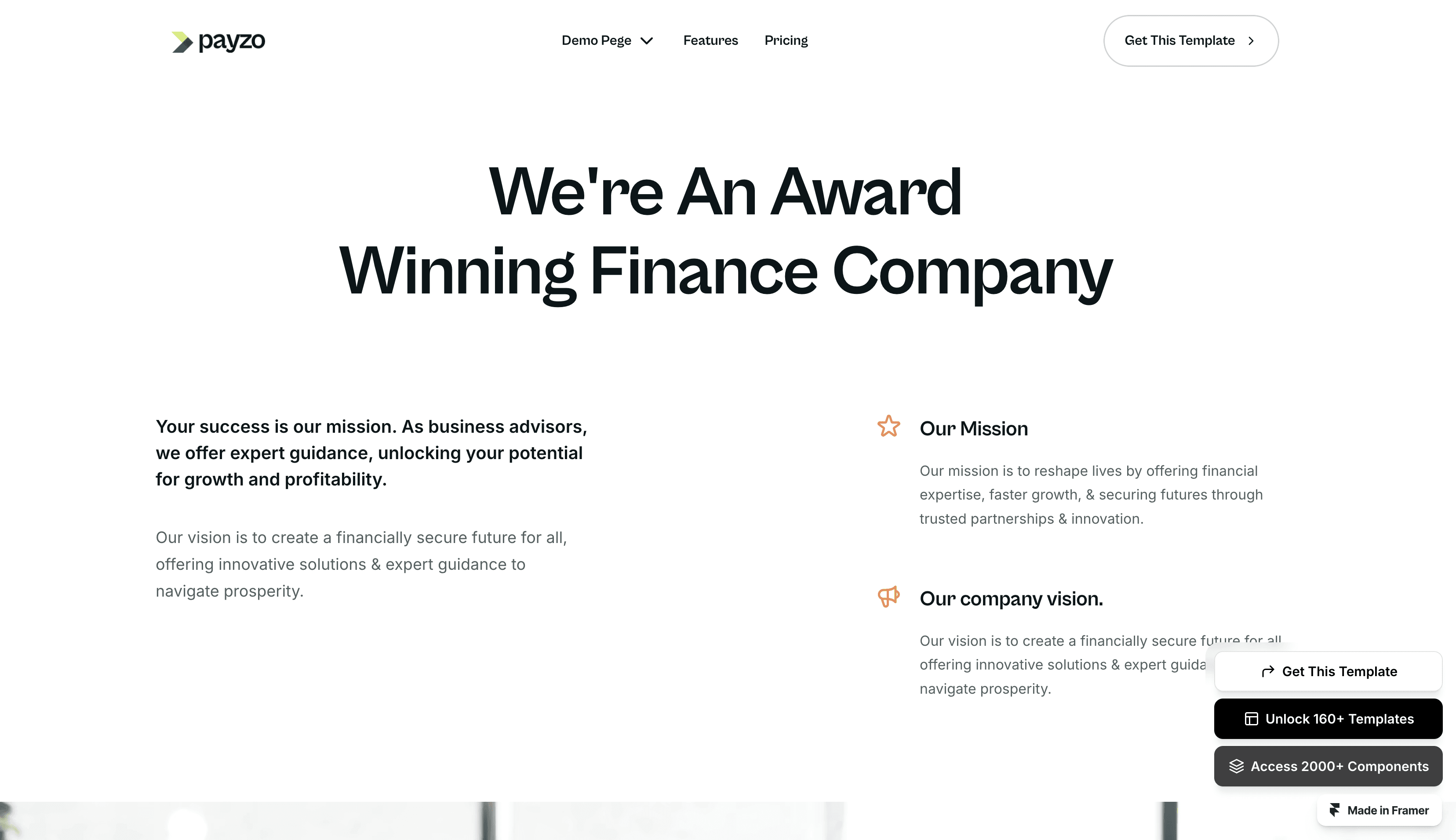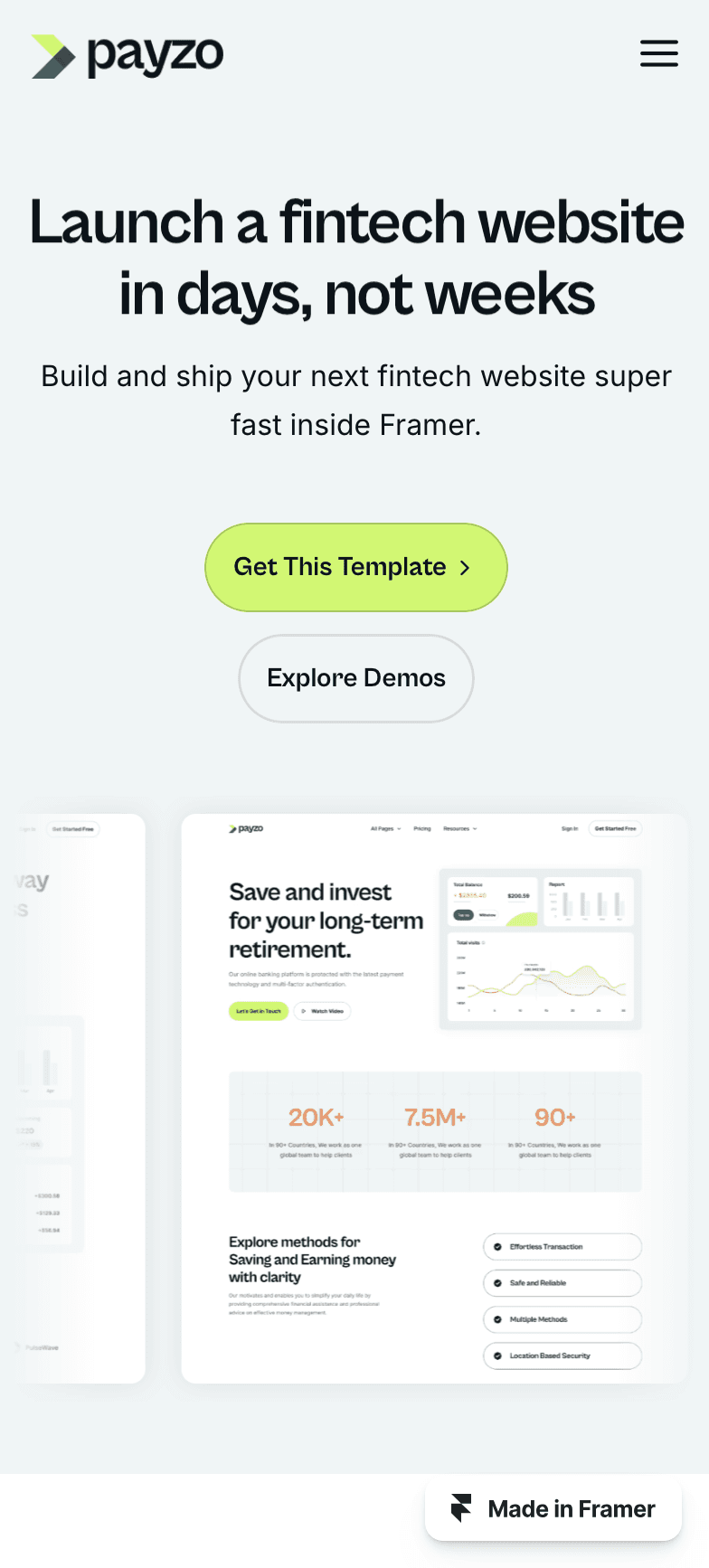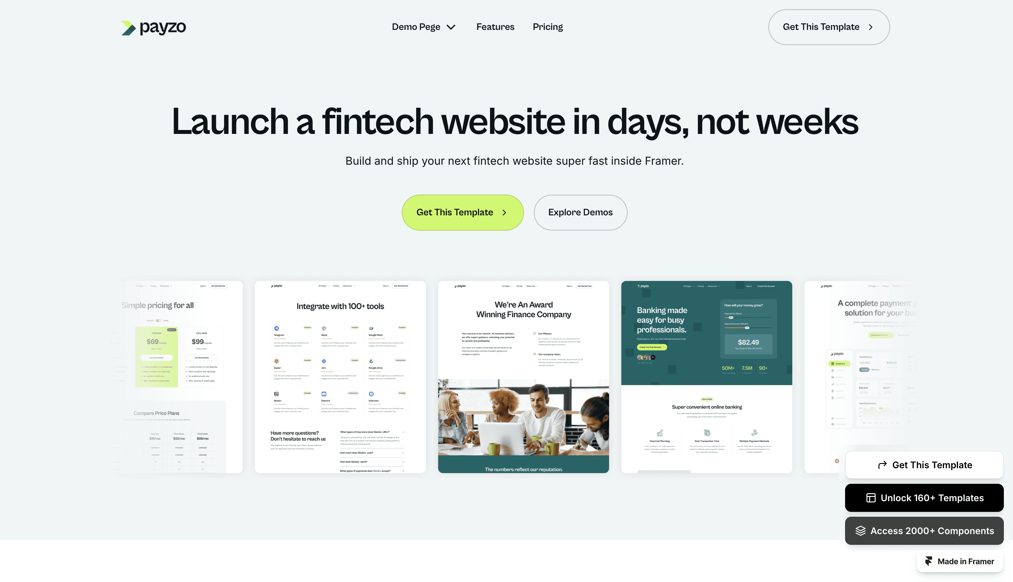 Introducing 'Payzo,' your all-in-one rocket booster for Fintech and finance website! With 17+ complete, ready-to-use pages, this Framer template is the ultimate choice. T