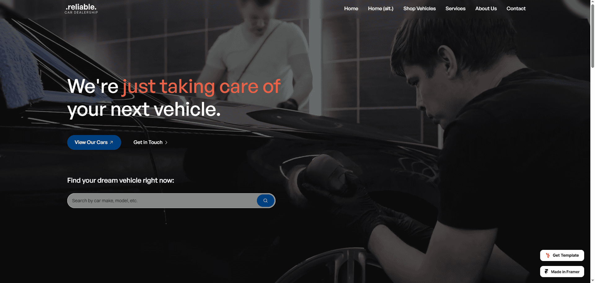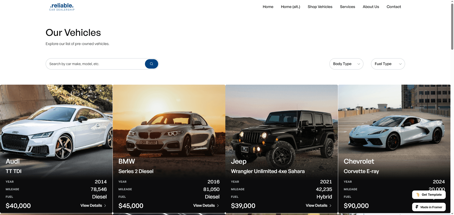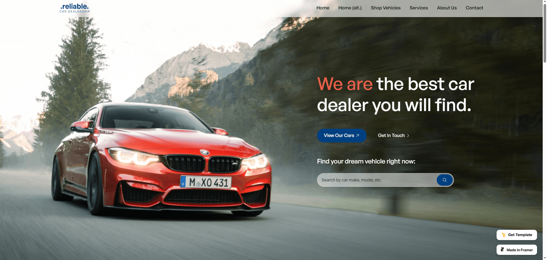 Reliable Car Dealership is a modern, clean, and fully responsive Car Dealership e-commerce template for Framer, with search and filtering components for users to easily find the type of vehicle they're looking for.