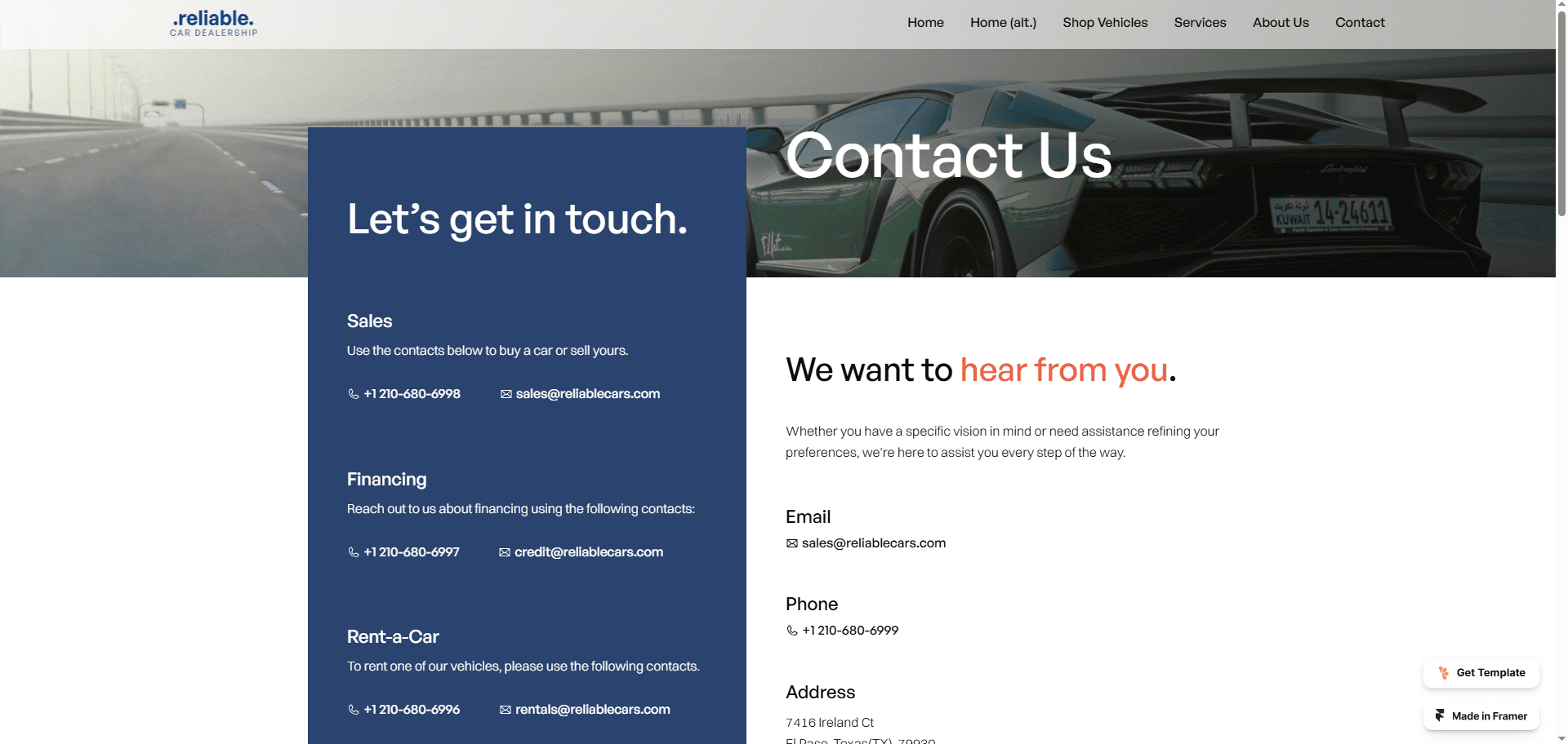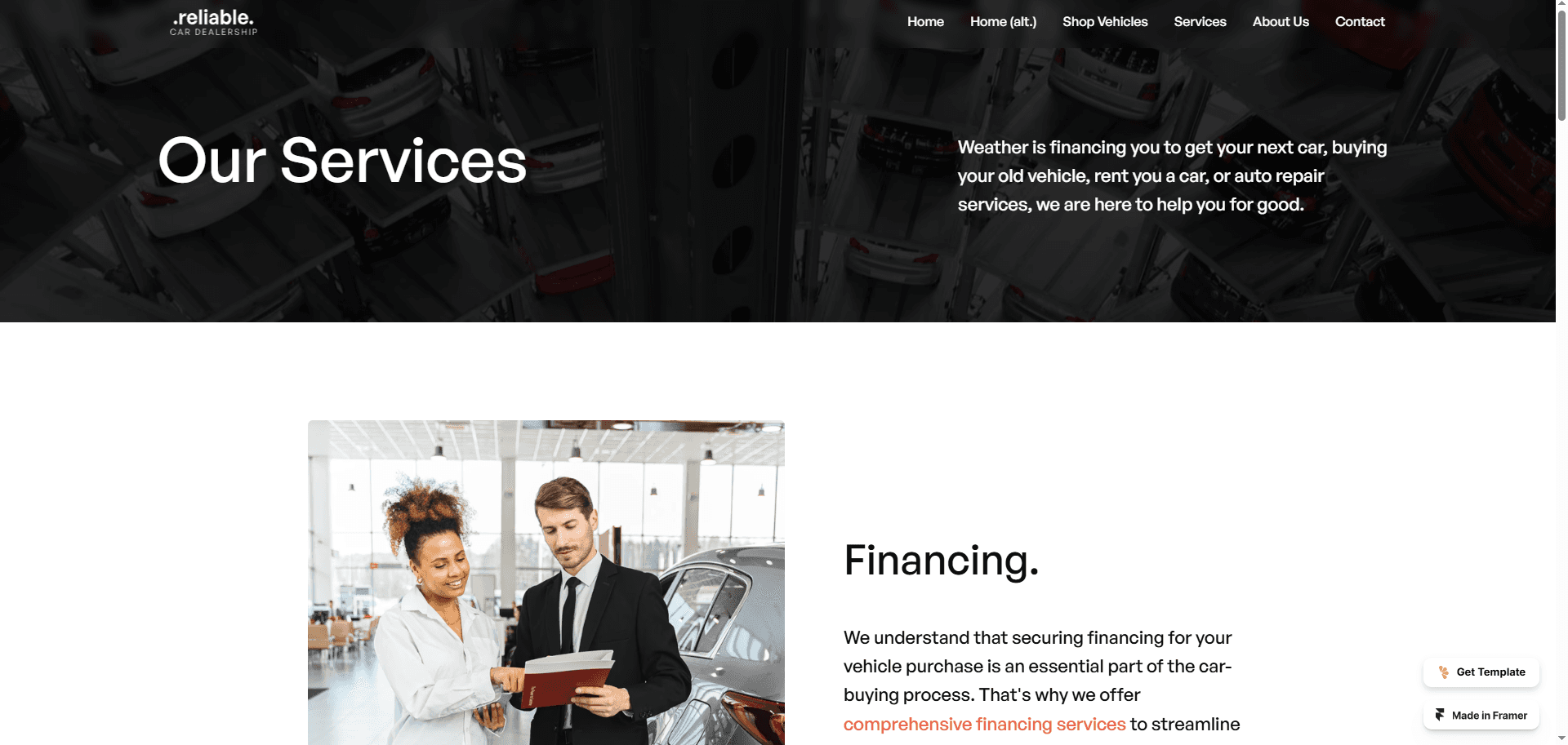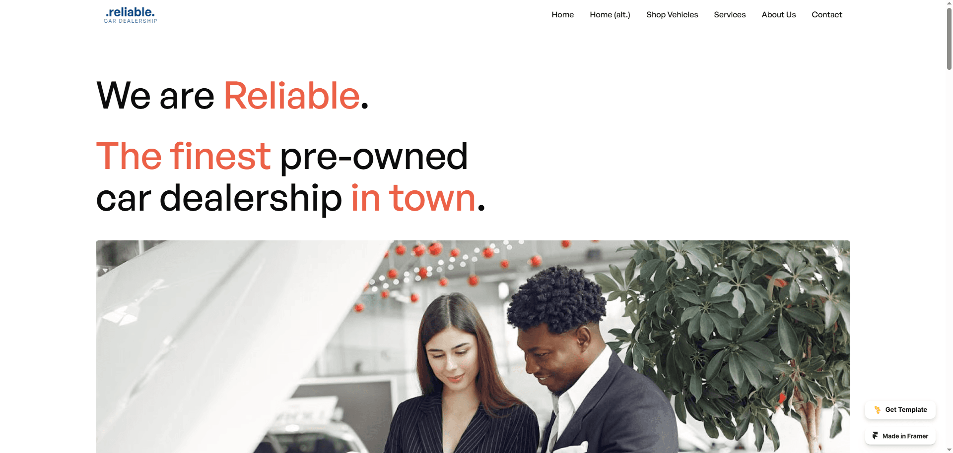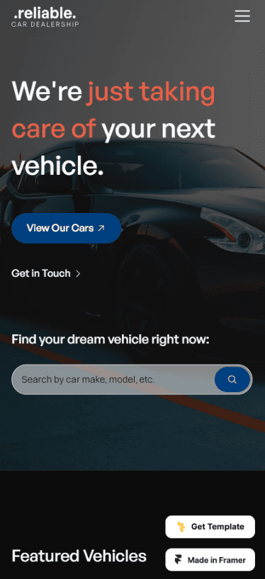 Reliable Car Dealership is a modern, clean, and fully responsive Car Dealership e-commerce template for Framer, with search and filtering components for users to easily find the type of vehicle they're looking for.