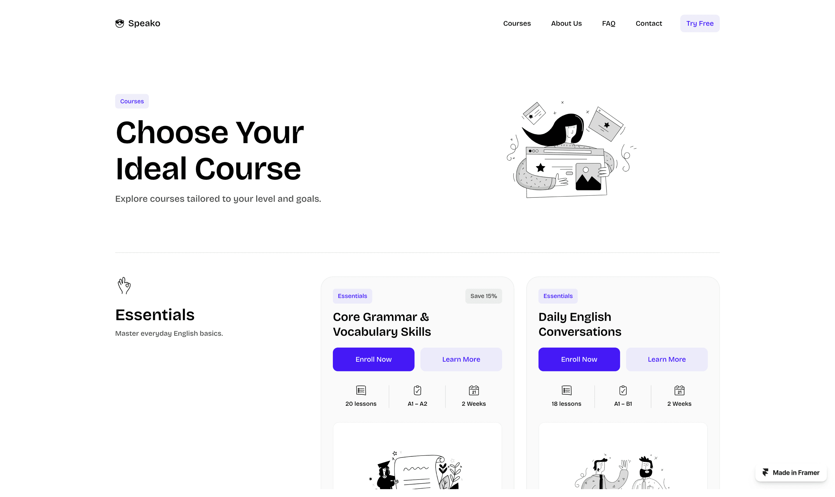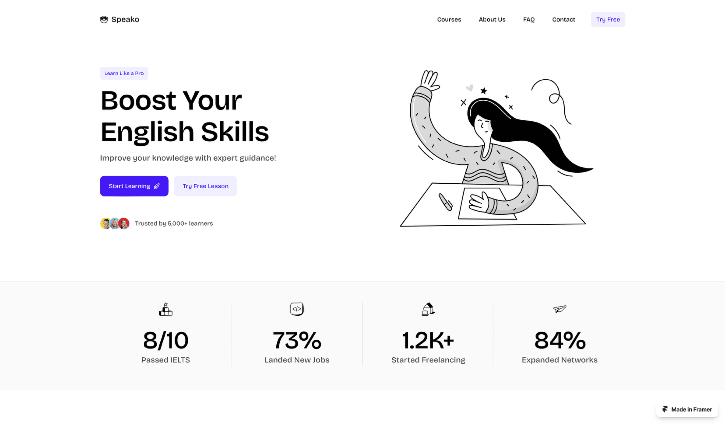 Speako is a sleek, responsive website template for online courses. Perfect for language platforms, it offers customizable features, playful design, and user-friendly navigation to help you showcase and sell your courses with ease.