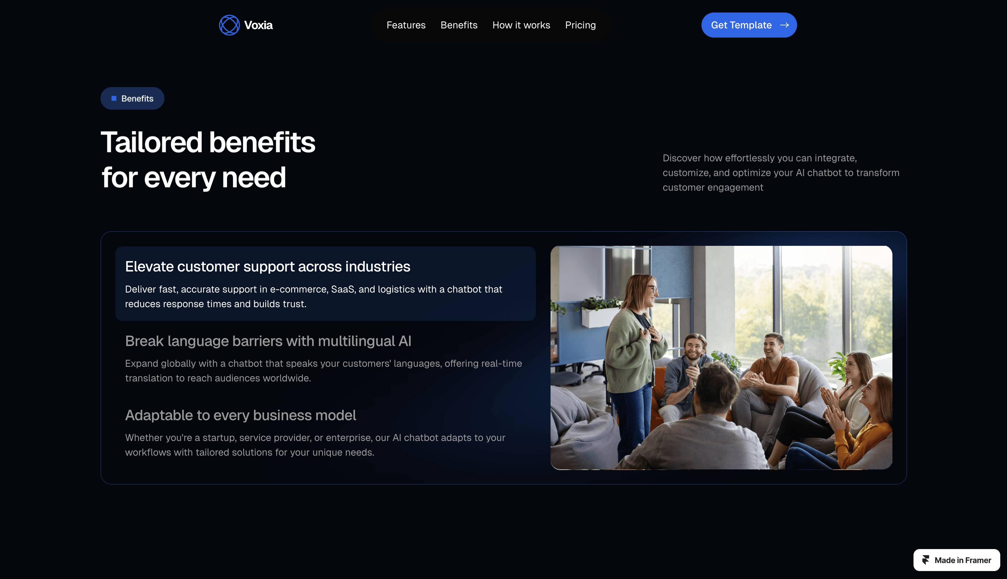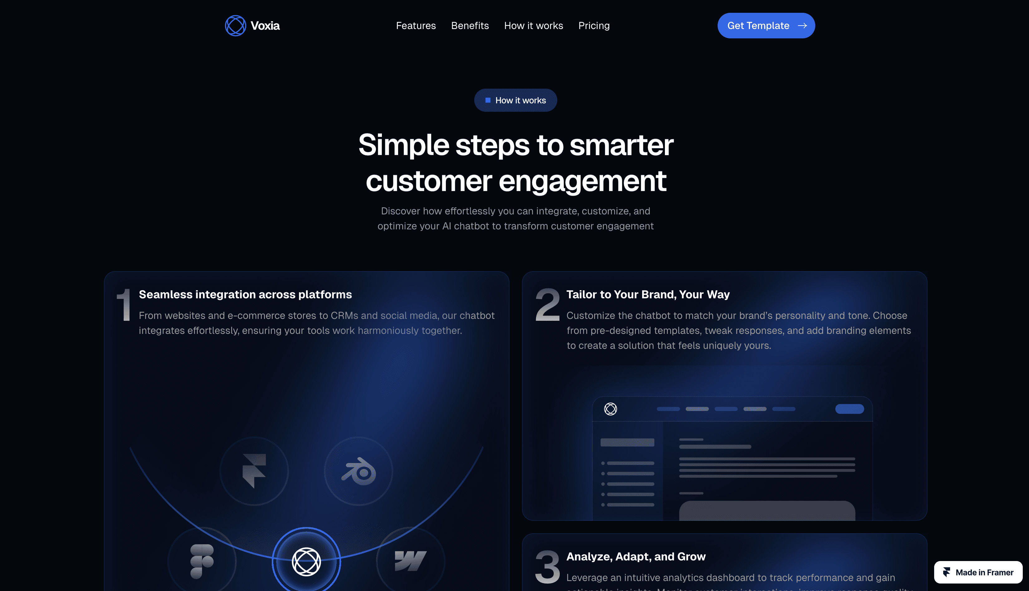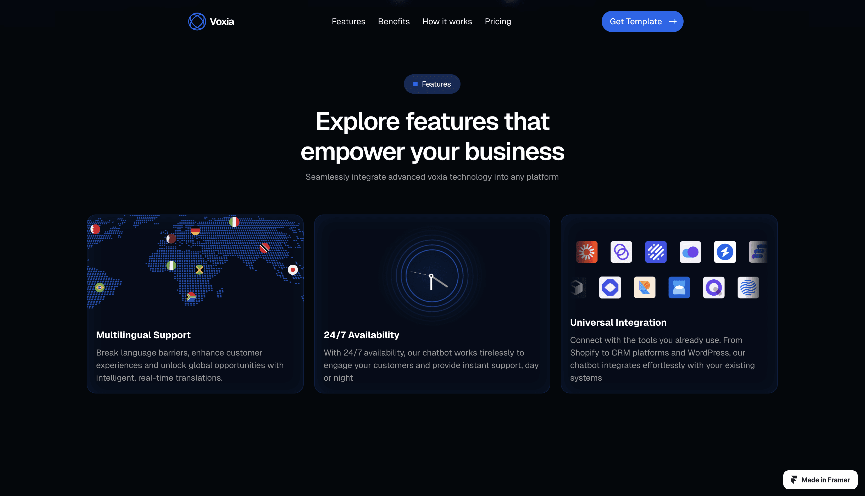 An intelligent AI Chatbot SaaS Framer template with multilingual support, platform integration, analytics, and customizable branding.